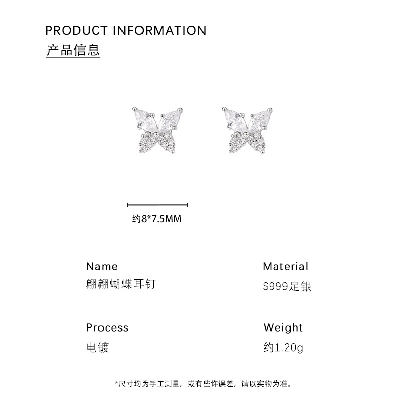 【蝴蝶半夏】S999纯银蝴蝶镶嵌锆石耳钉【YXS-E5455】 商品图1