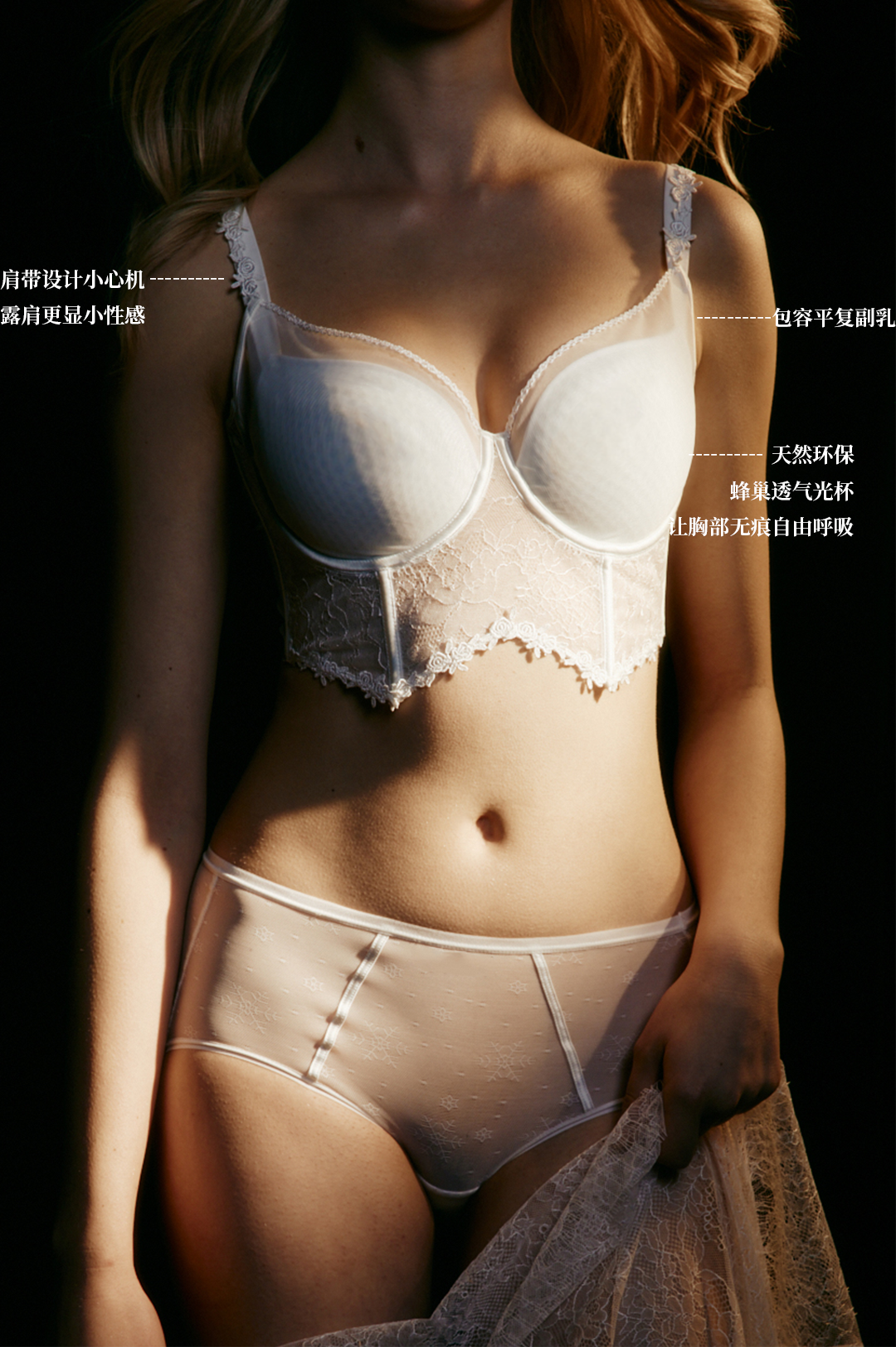 运用法国珍贵的列维斯蕾丝和天然材质的透气蜂巢杯,