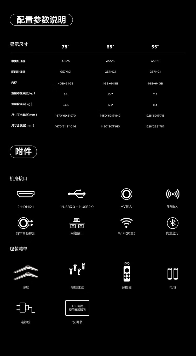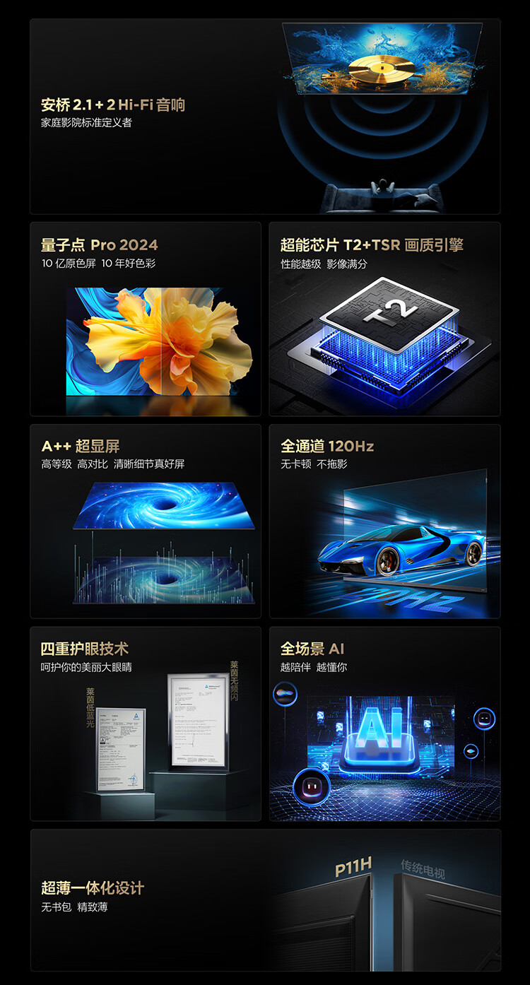 TCL电视 量子点Pro2024 超薄一体化设计 超能芯片T2+TXR画质增强引擎 剧院量子点电视 65英寸 P11H