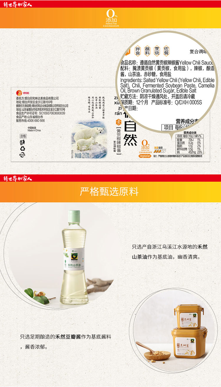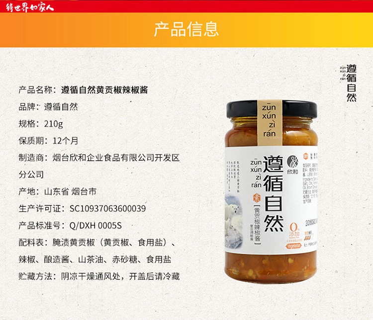 禾然遵循自然黄贡椒辣椒酱210g/瓶