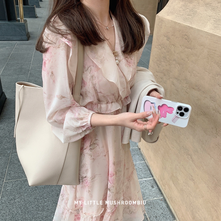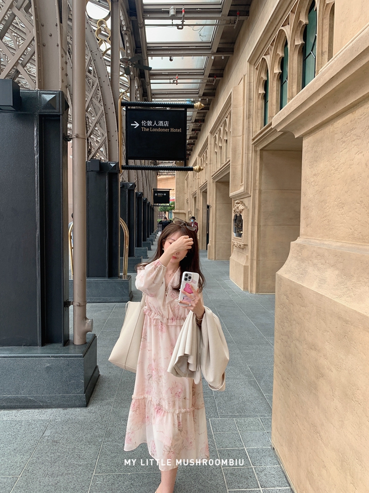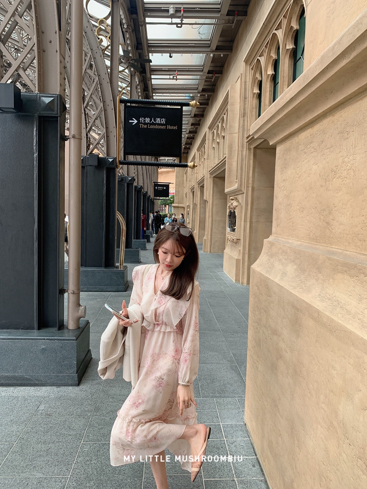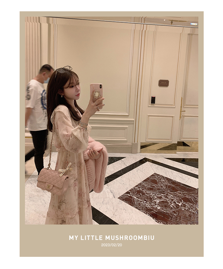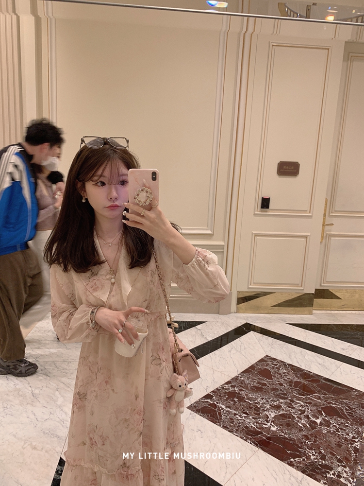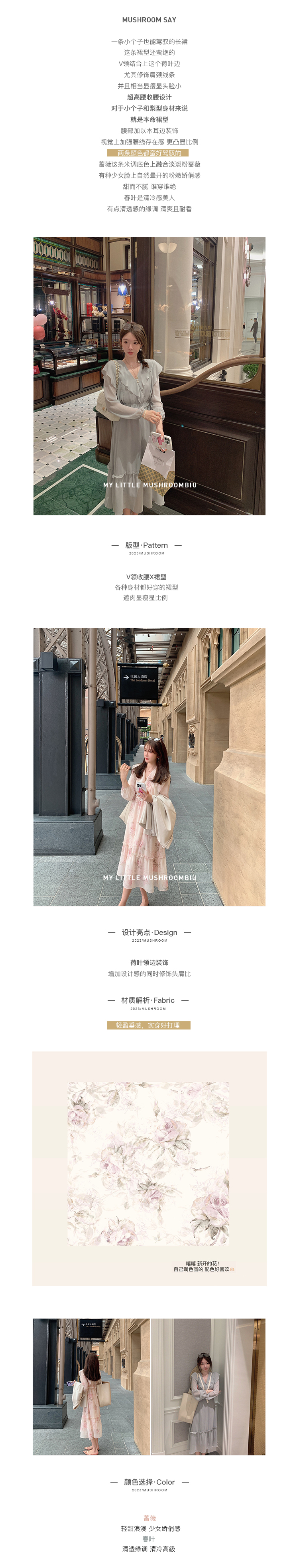 断码特价 金蘑菇菇 春叶蔷薇子/ 招牌印花回归 淡盐系 V领收腰碎花连衣裙