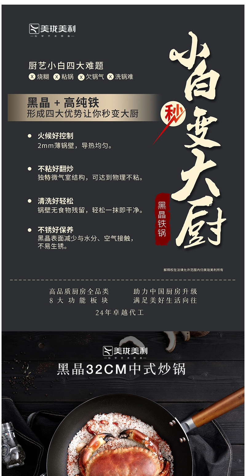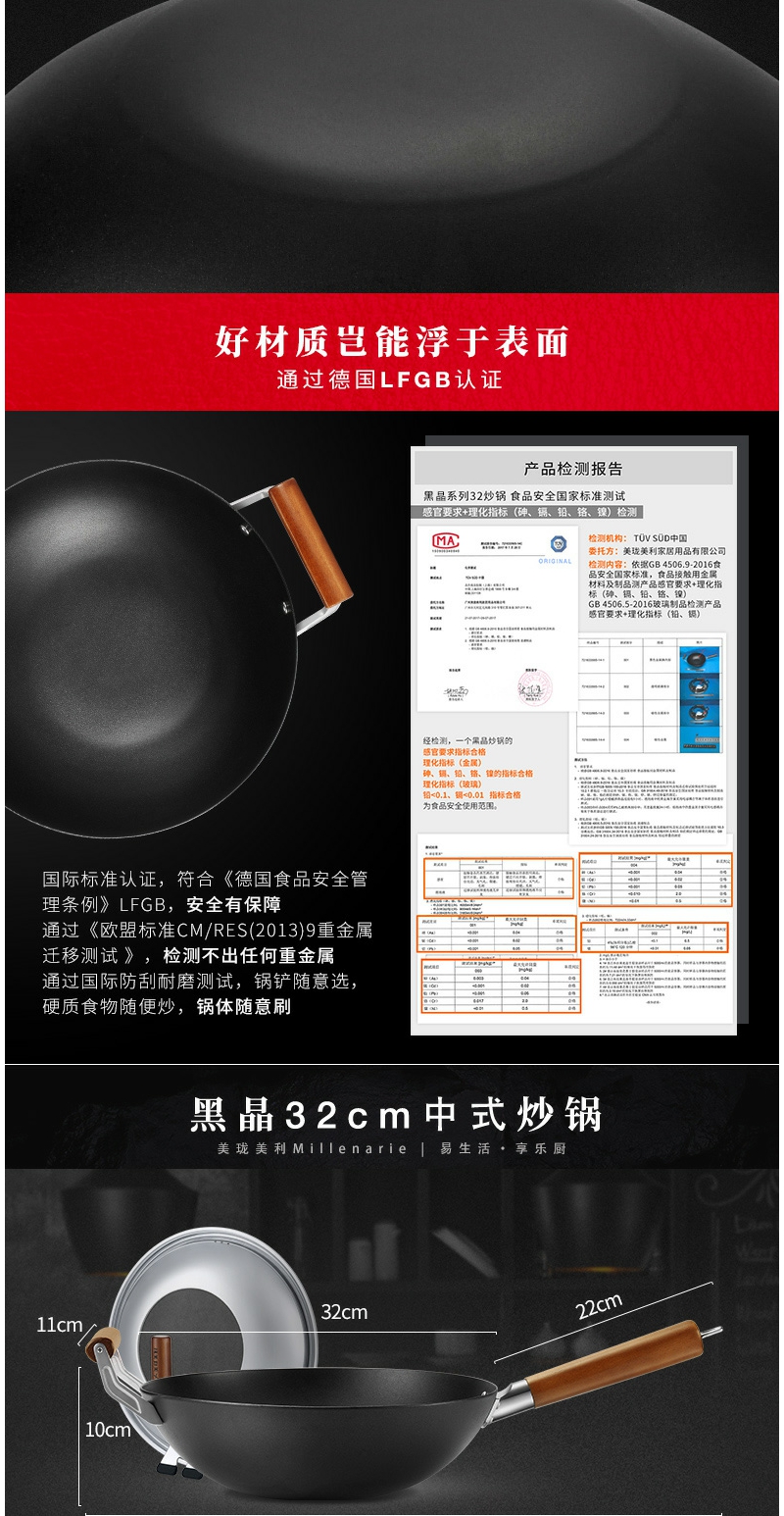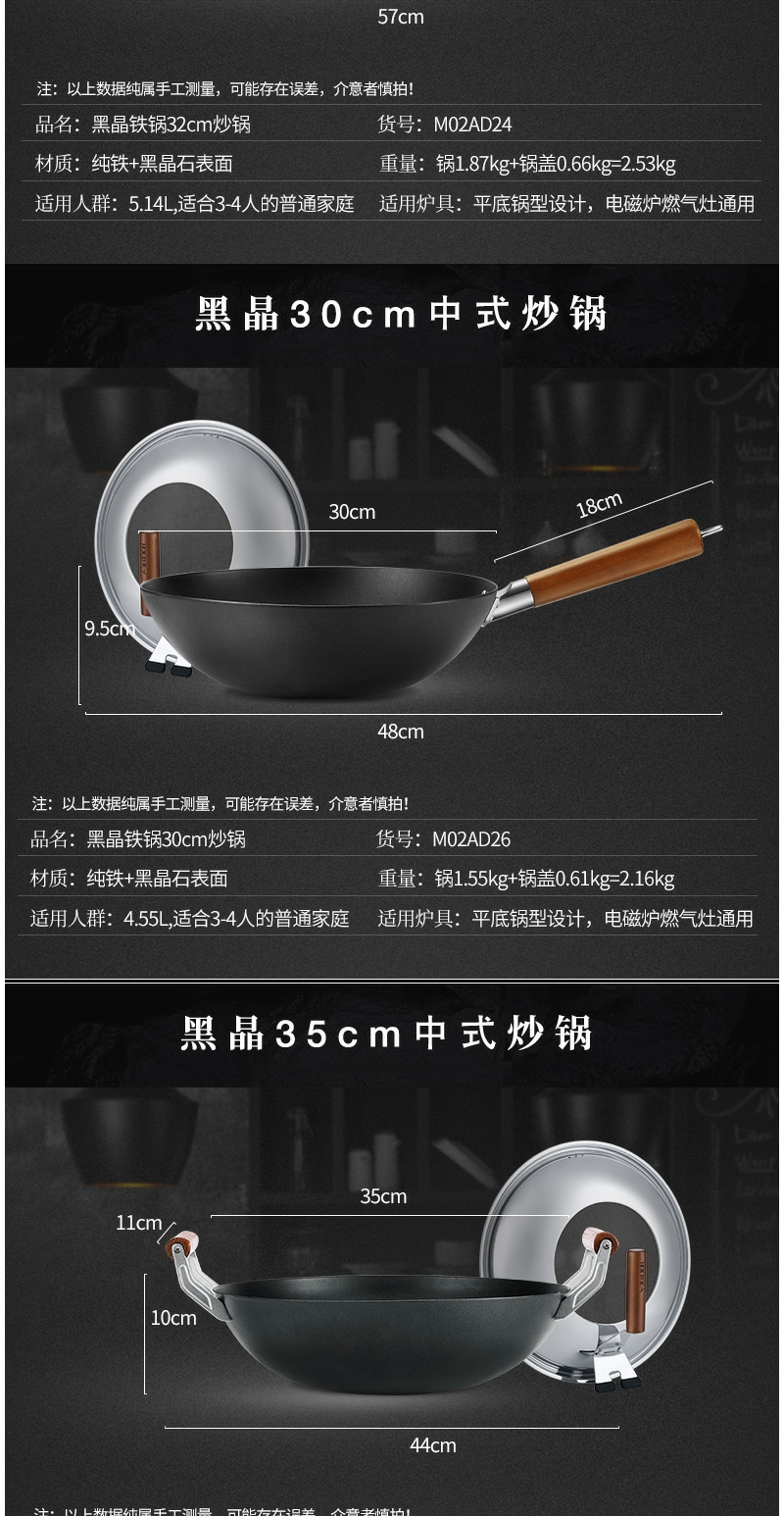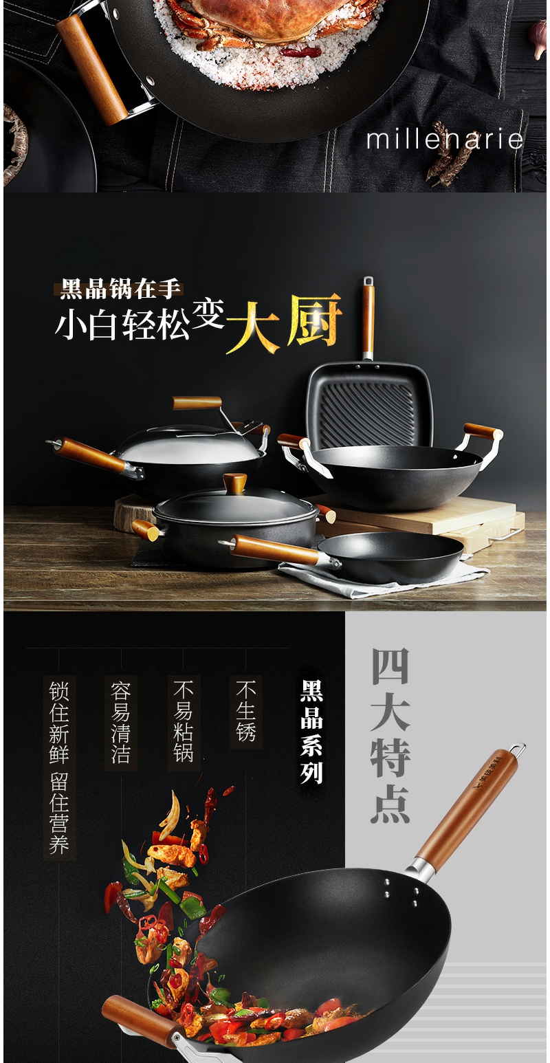 【直发】美珑美利 黑晶铁锅系列炒锅 少油烟物理不易粘炒菜锅 无涂层厨房铁炒锅 黑晶炒锅30cm