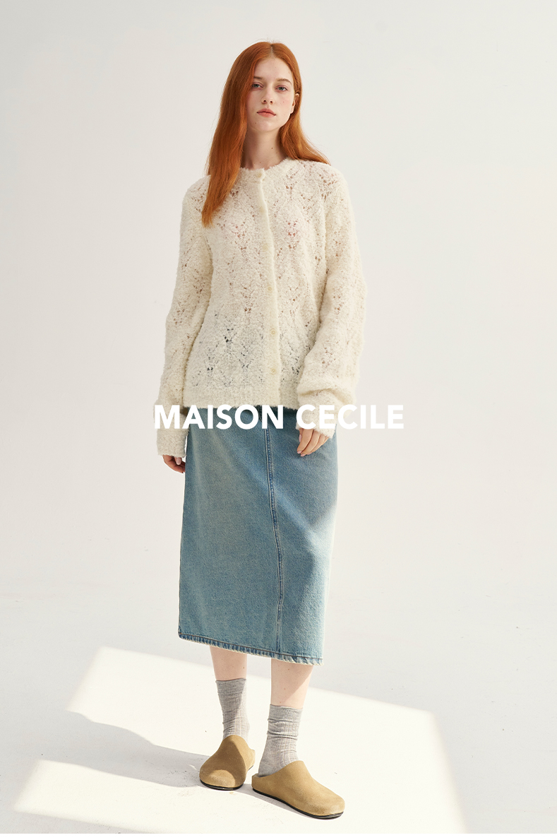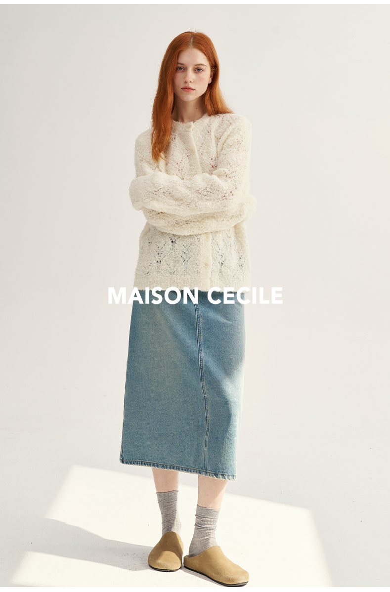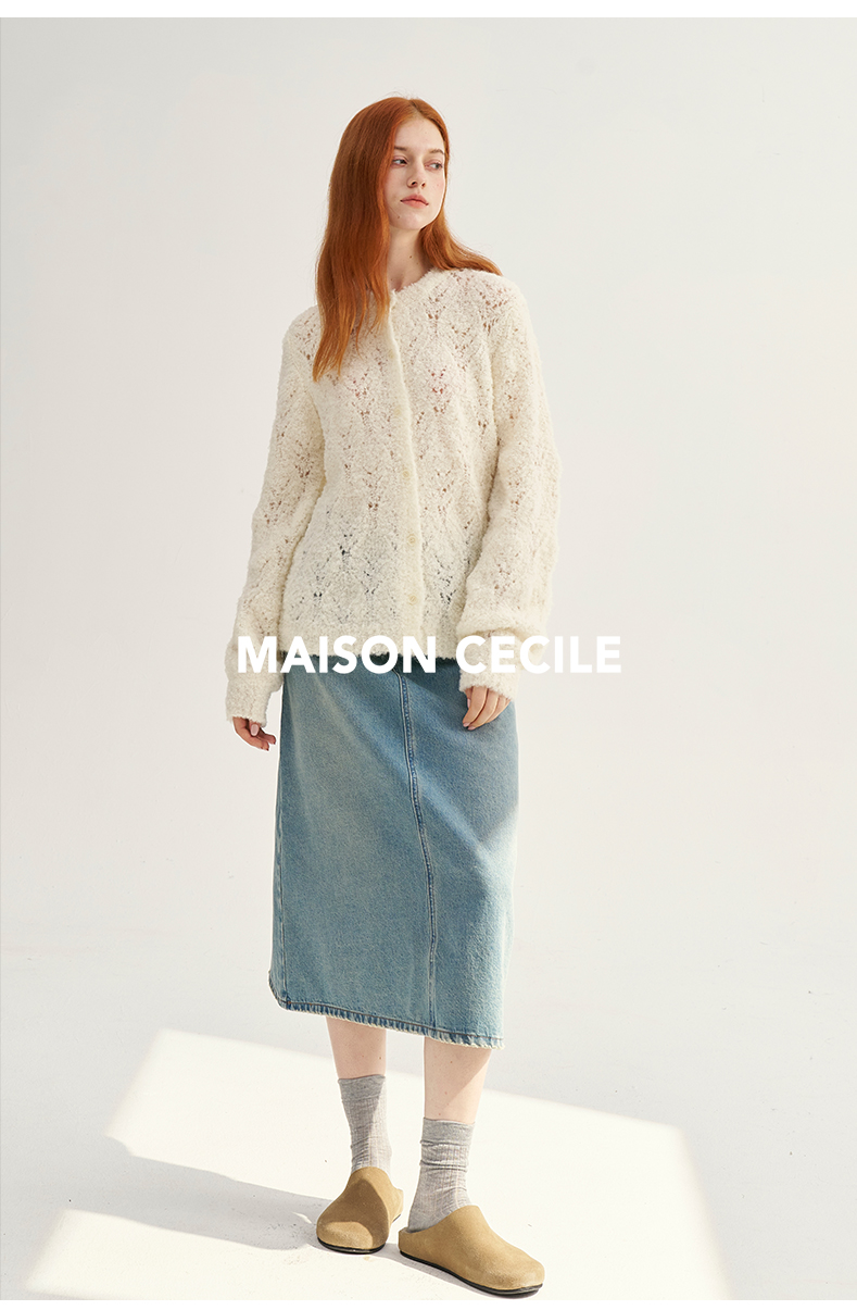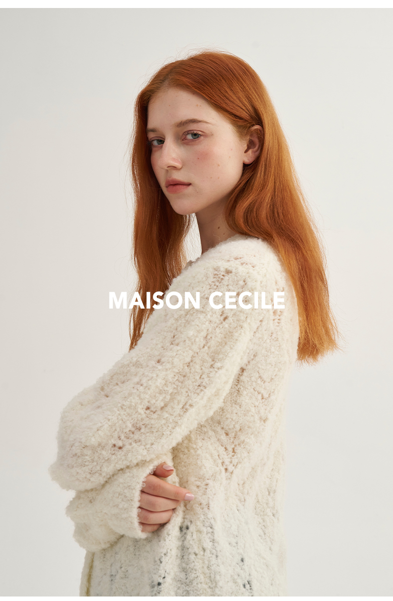 MAISON CECILE复古奶白色羊驼毛羊毛钩花针织开衫