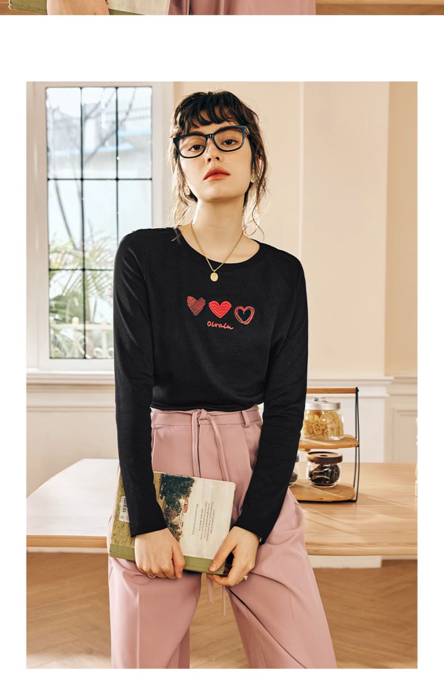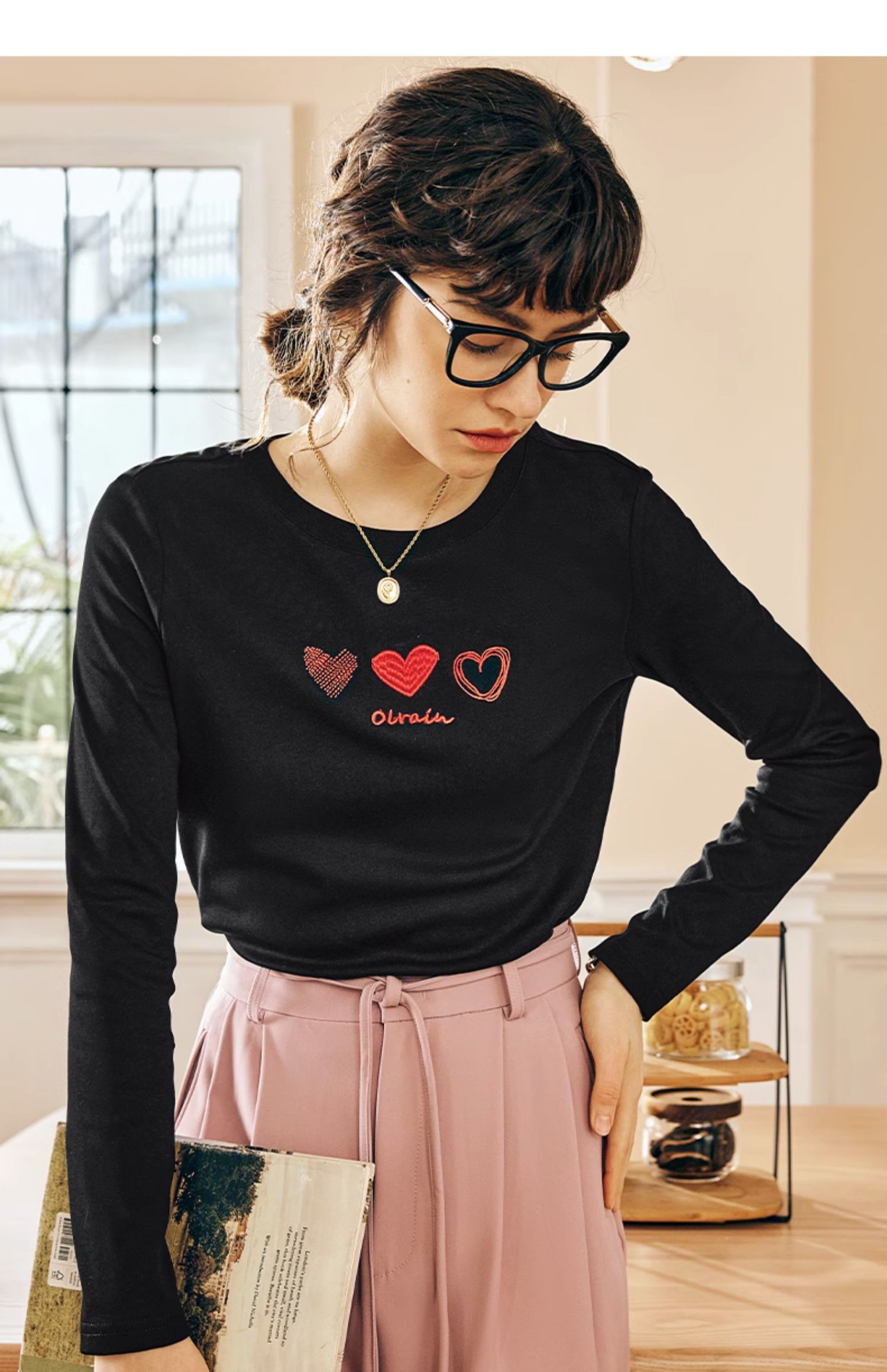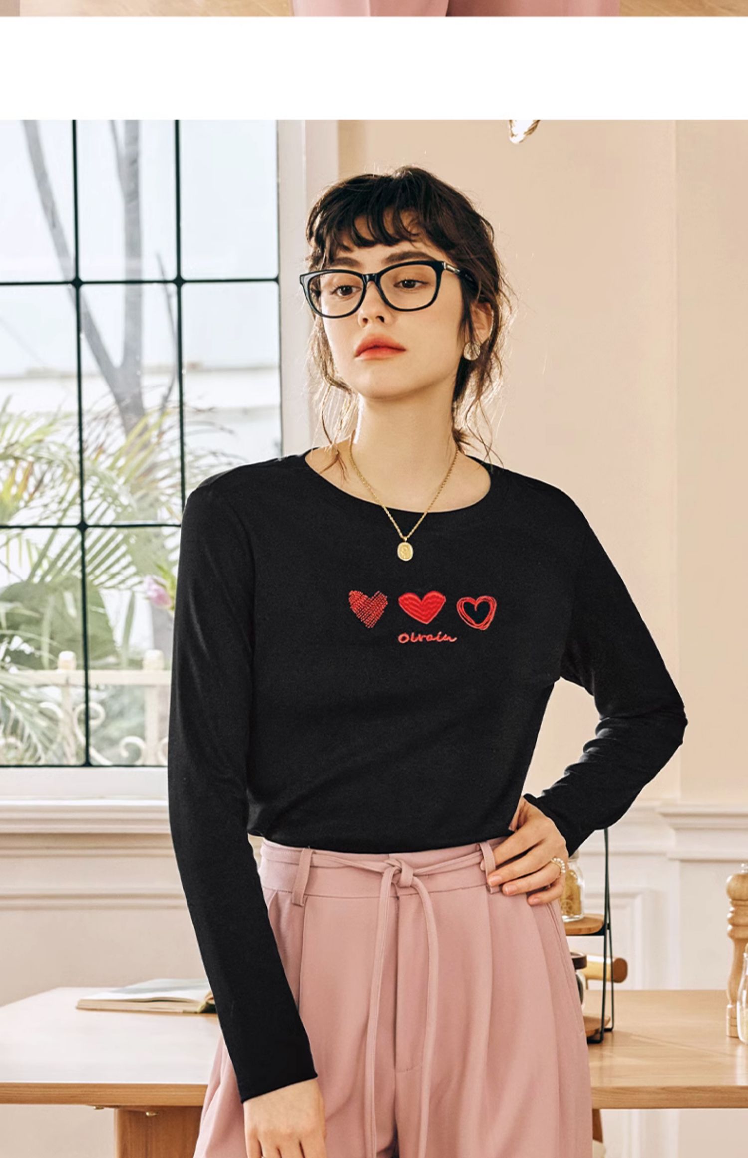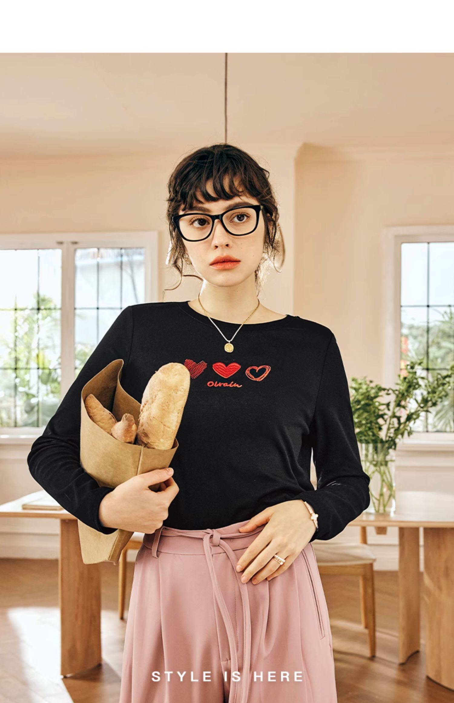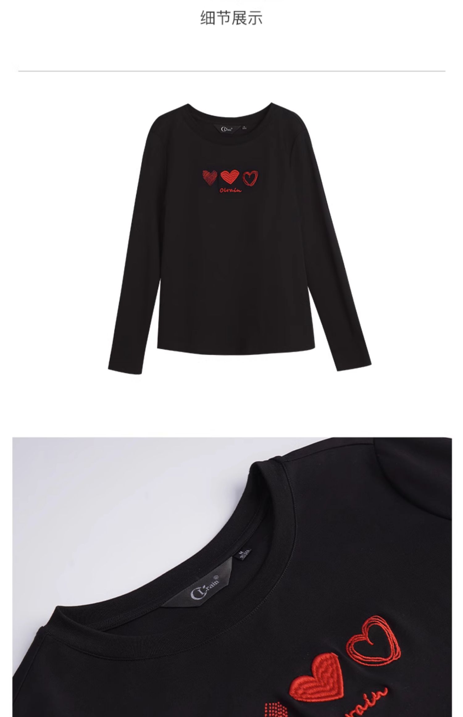 OLrain欧芮儿法式黑色长袖T恤女春季2024年新款爱心刺绣休闲上衣