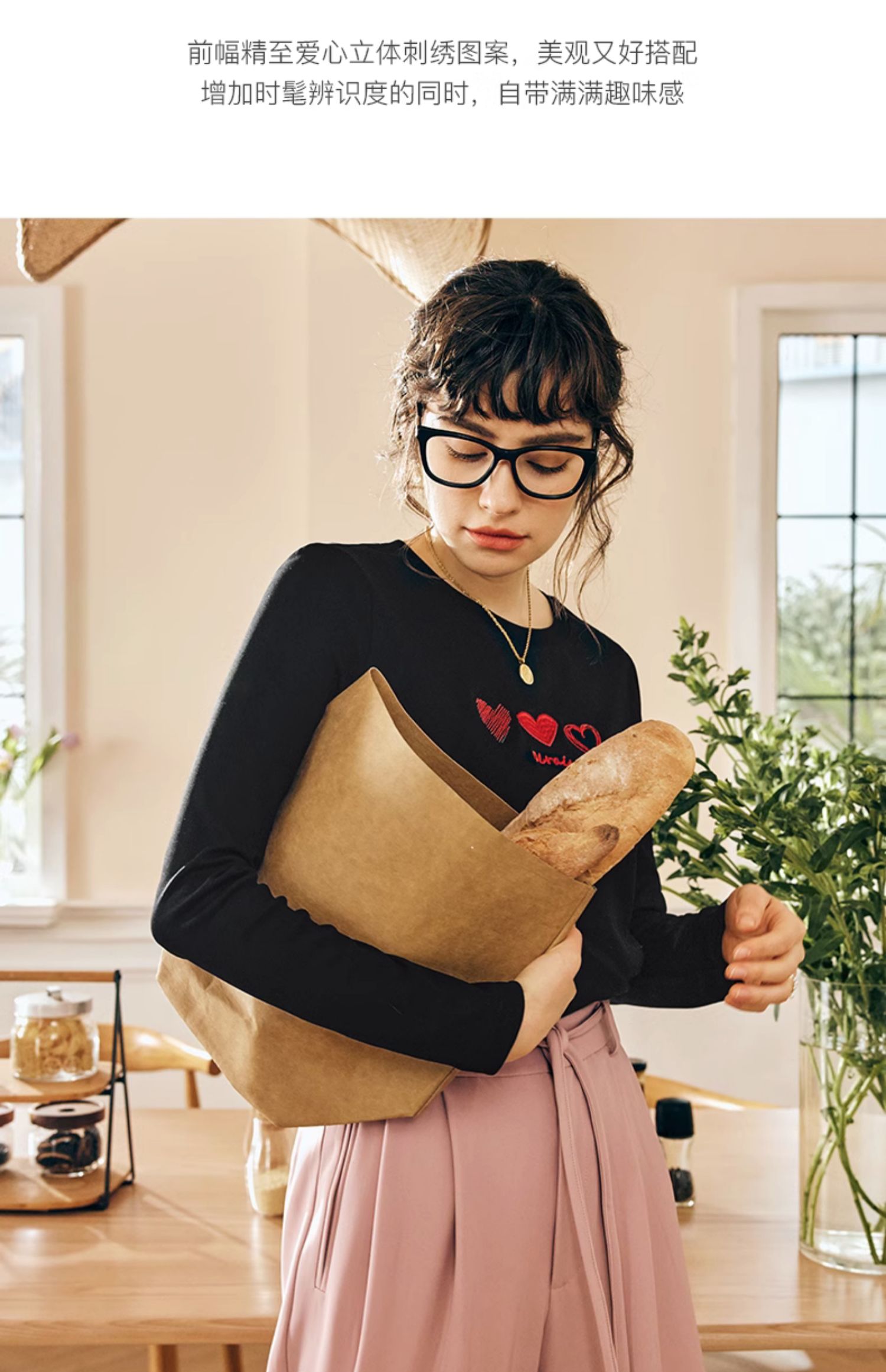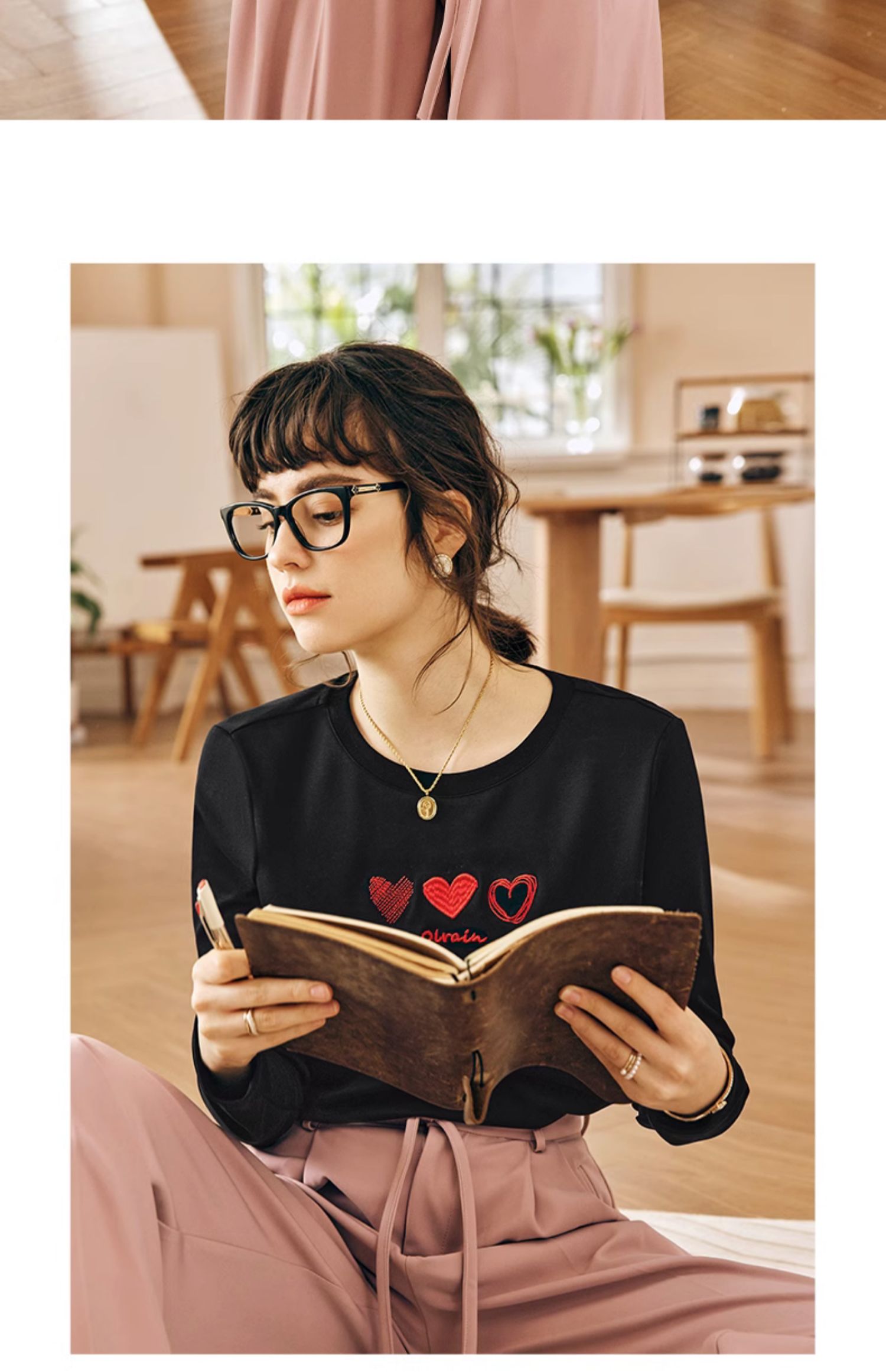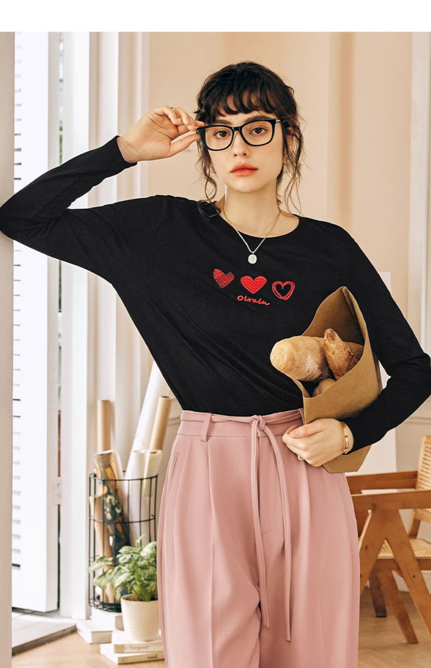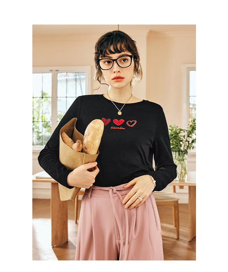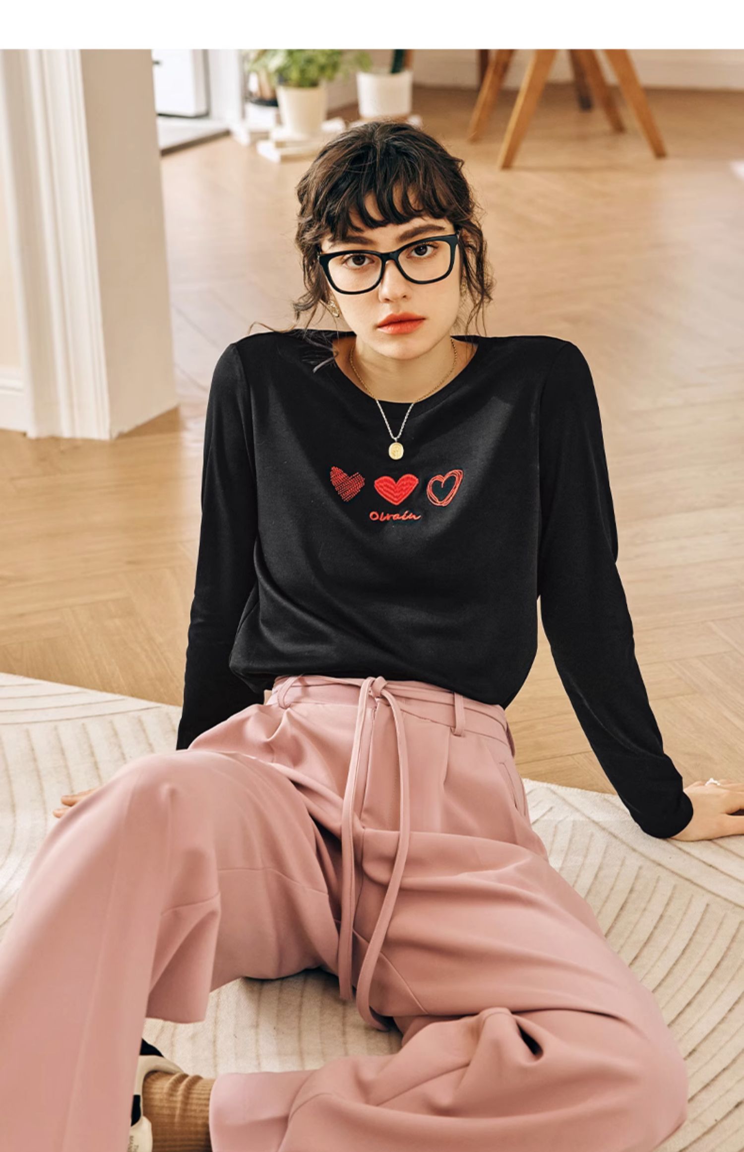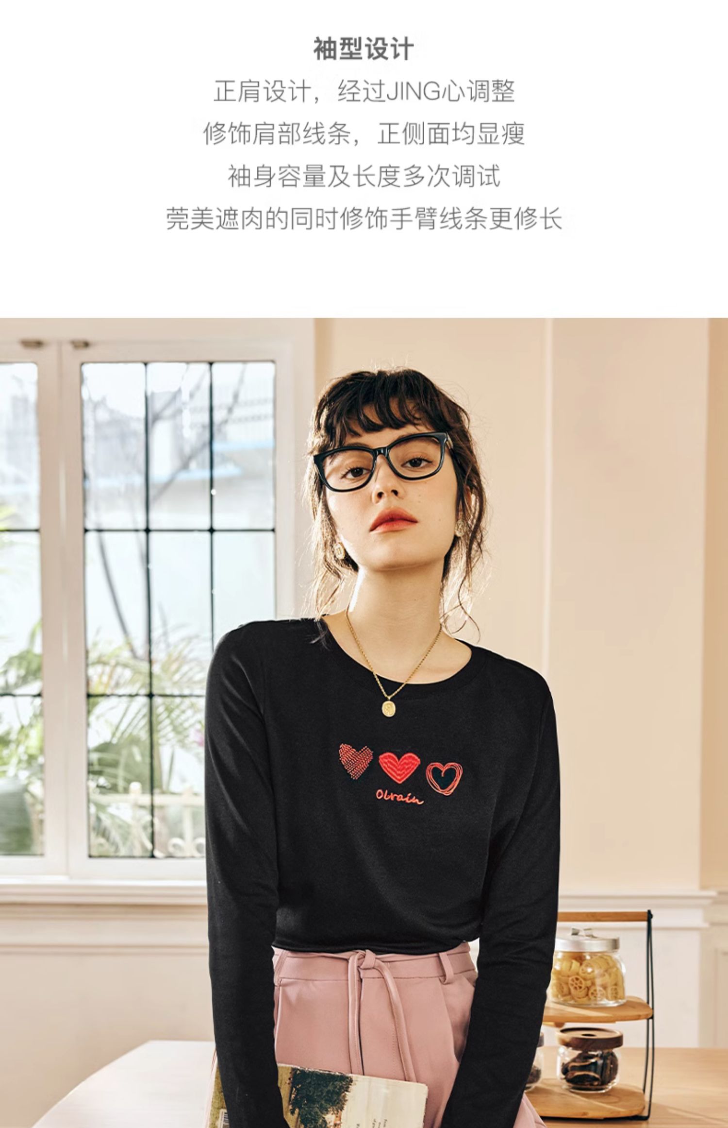 OLrain欧芮儿法式黑色长袖T恤女春季2024年新款爱心刺绣休闲上衣