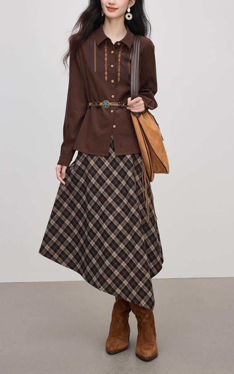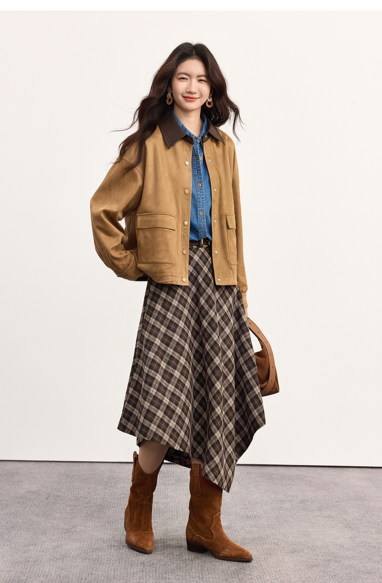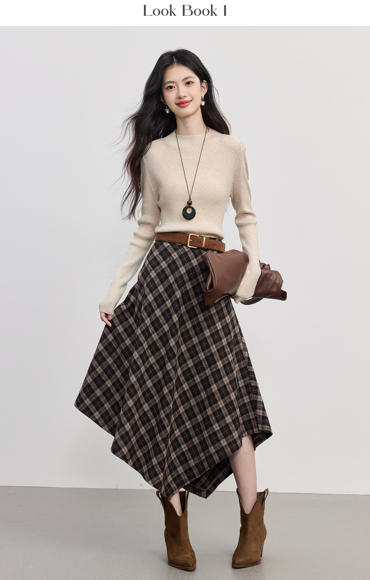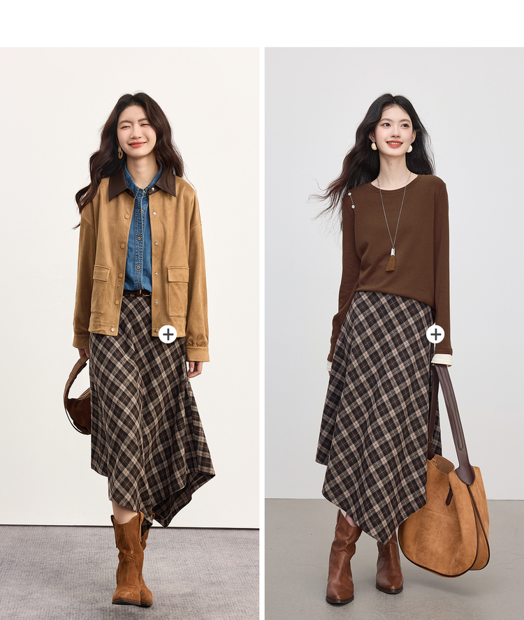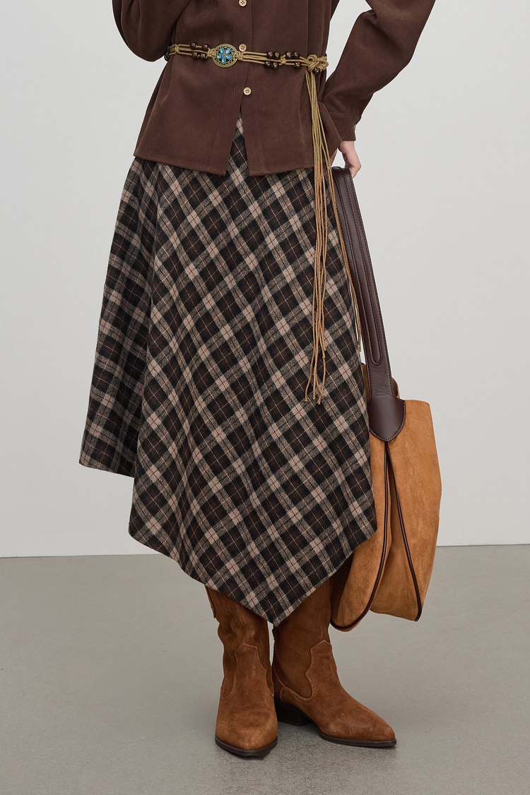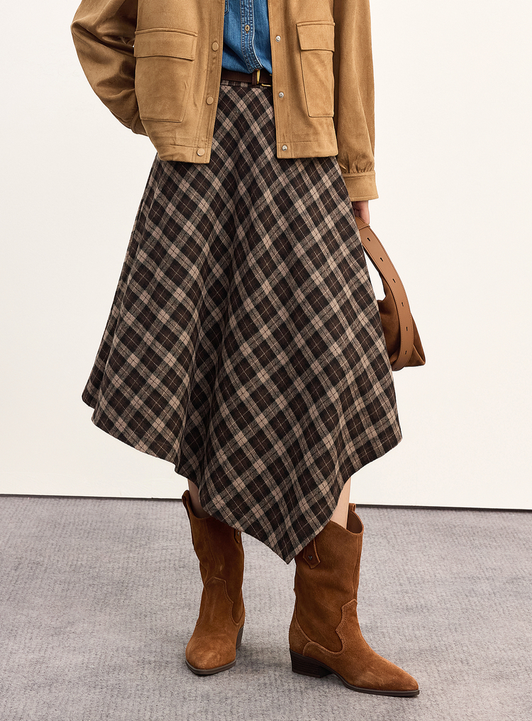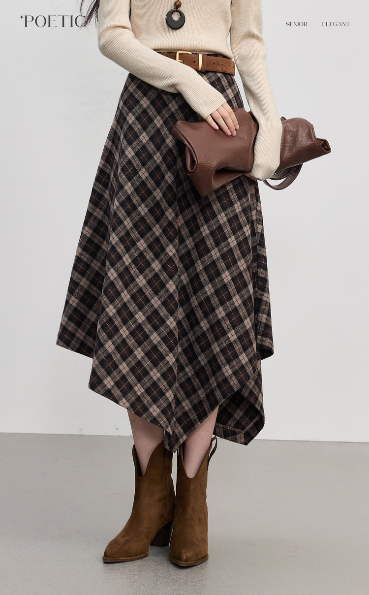 【10/1新品】熙世界不规则剪裁格纹半身裙女秋冬2025新款高腰显瘦复古磨毛裙子