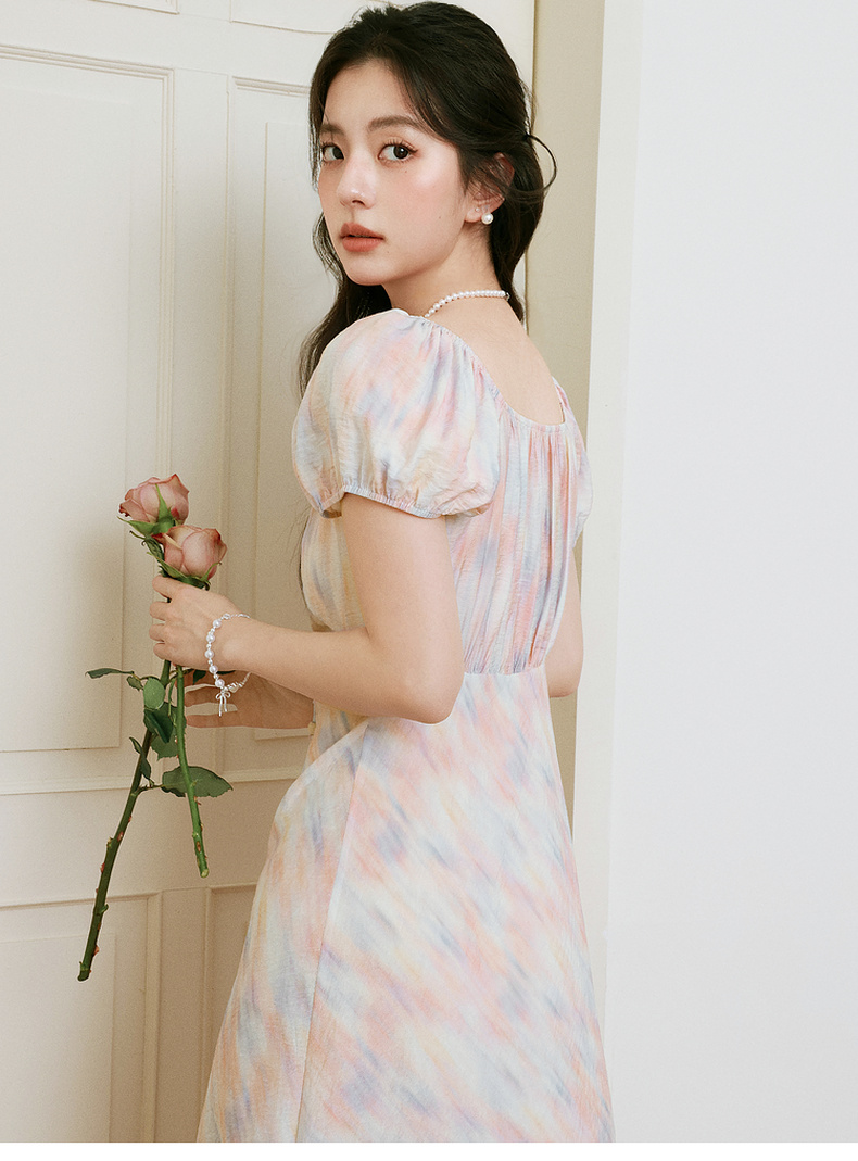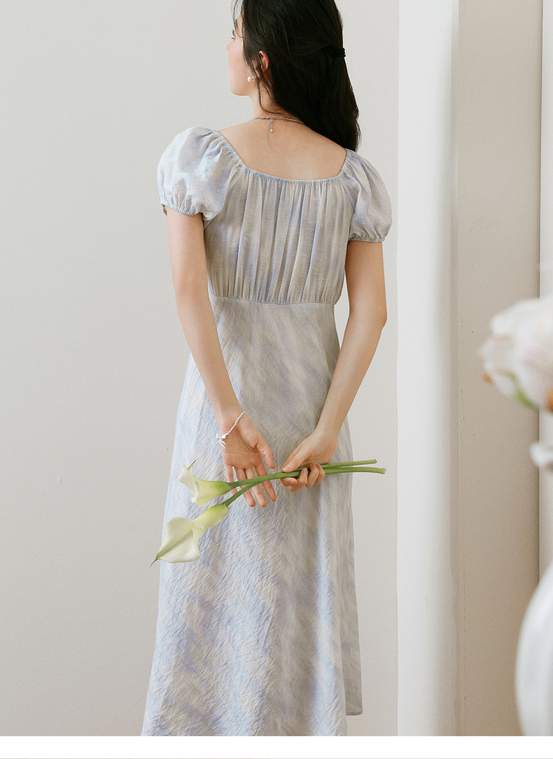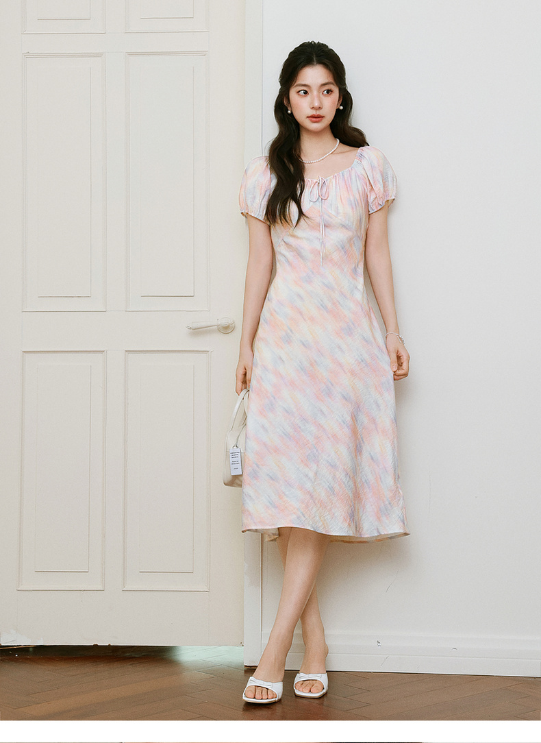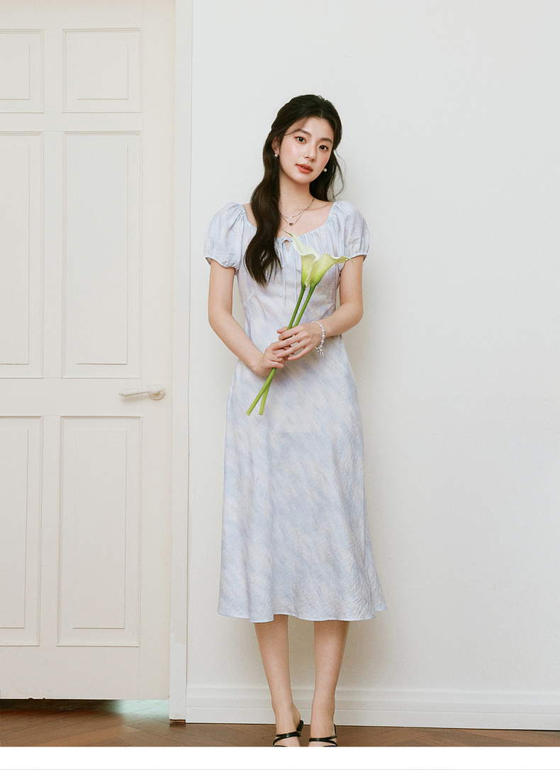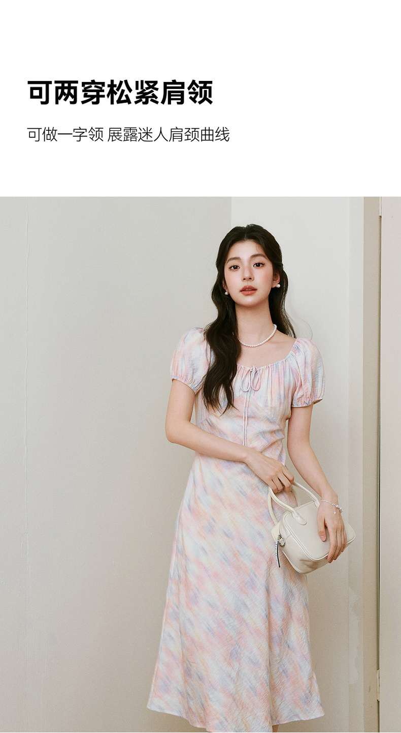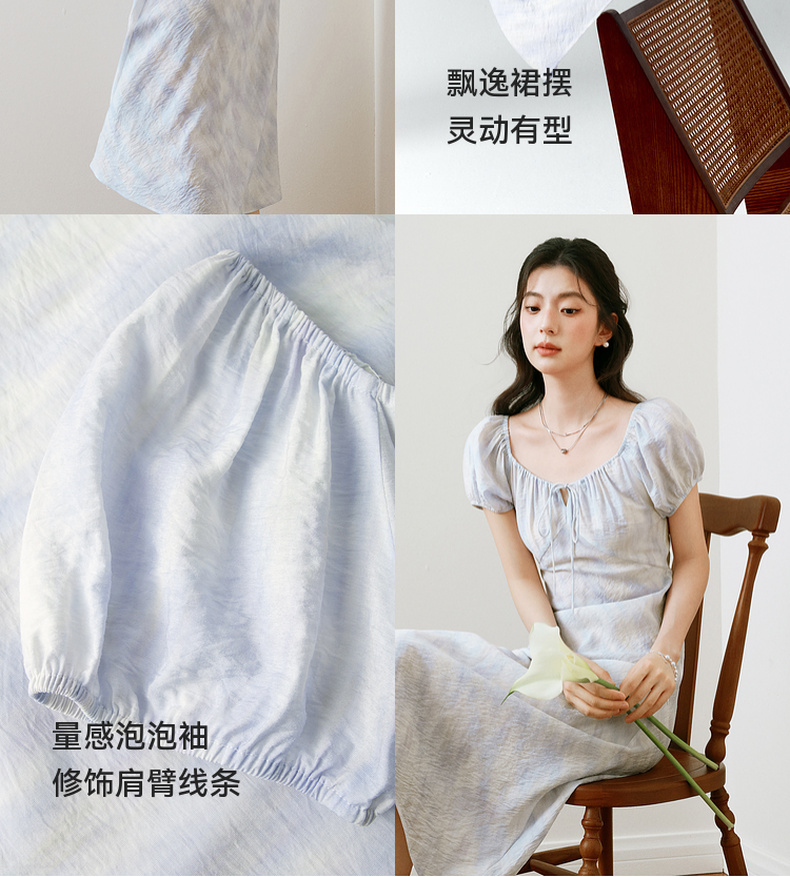 【严选】诗凡黎泡泡袖连衣裙2025春新款莫奈裙收腰欧若风度假绝美长裙7G3290721