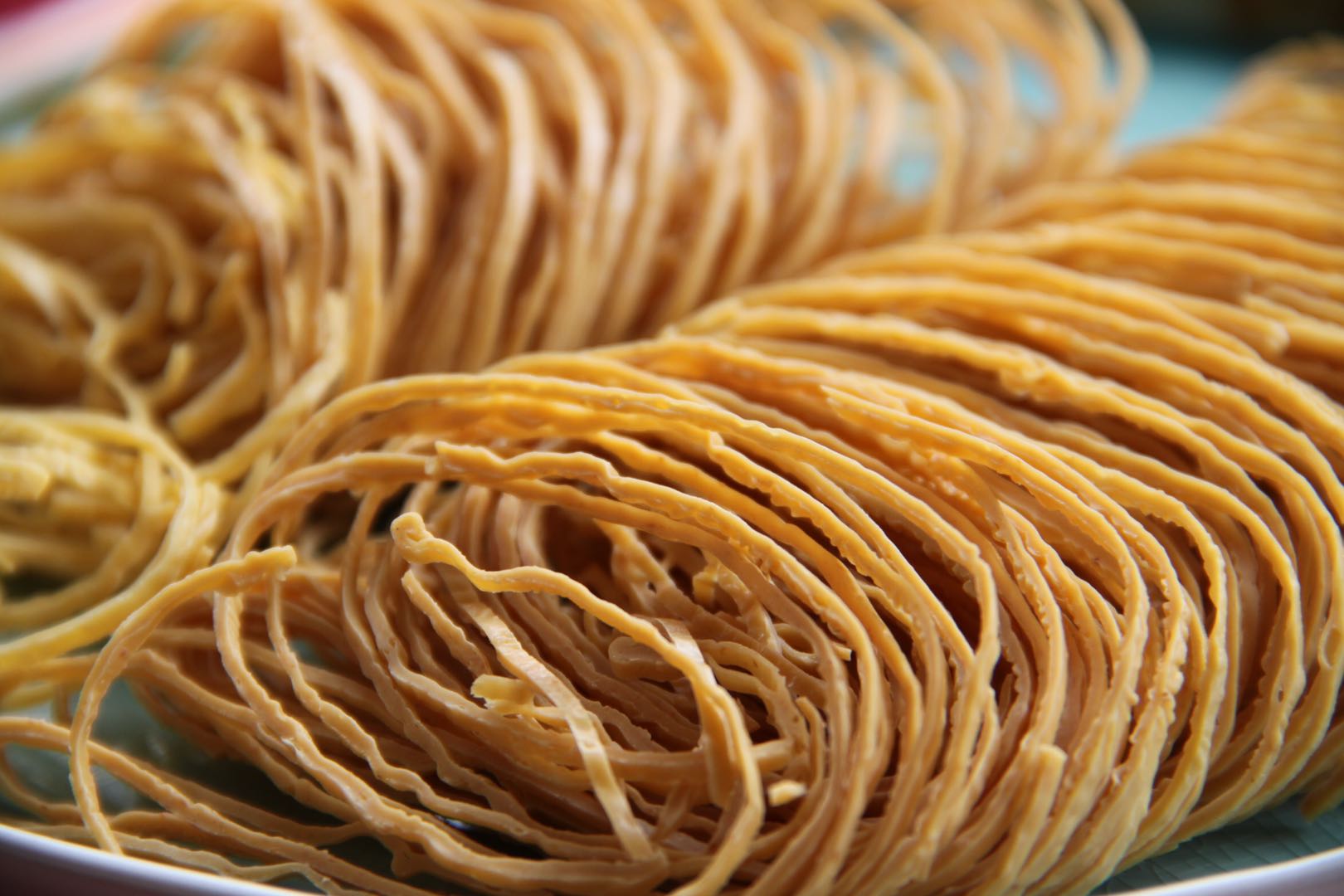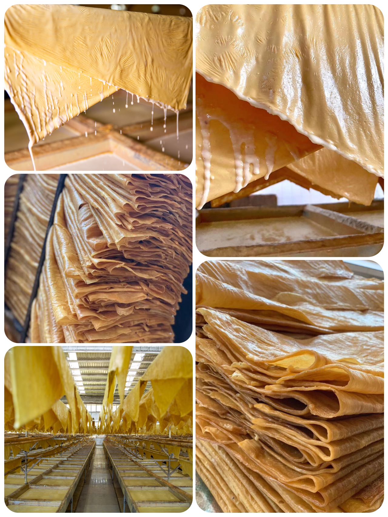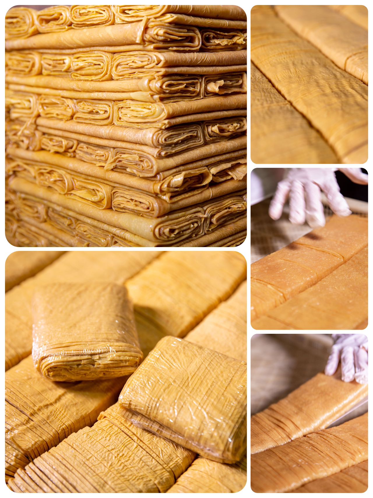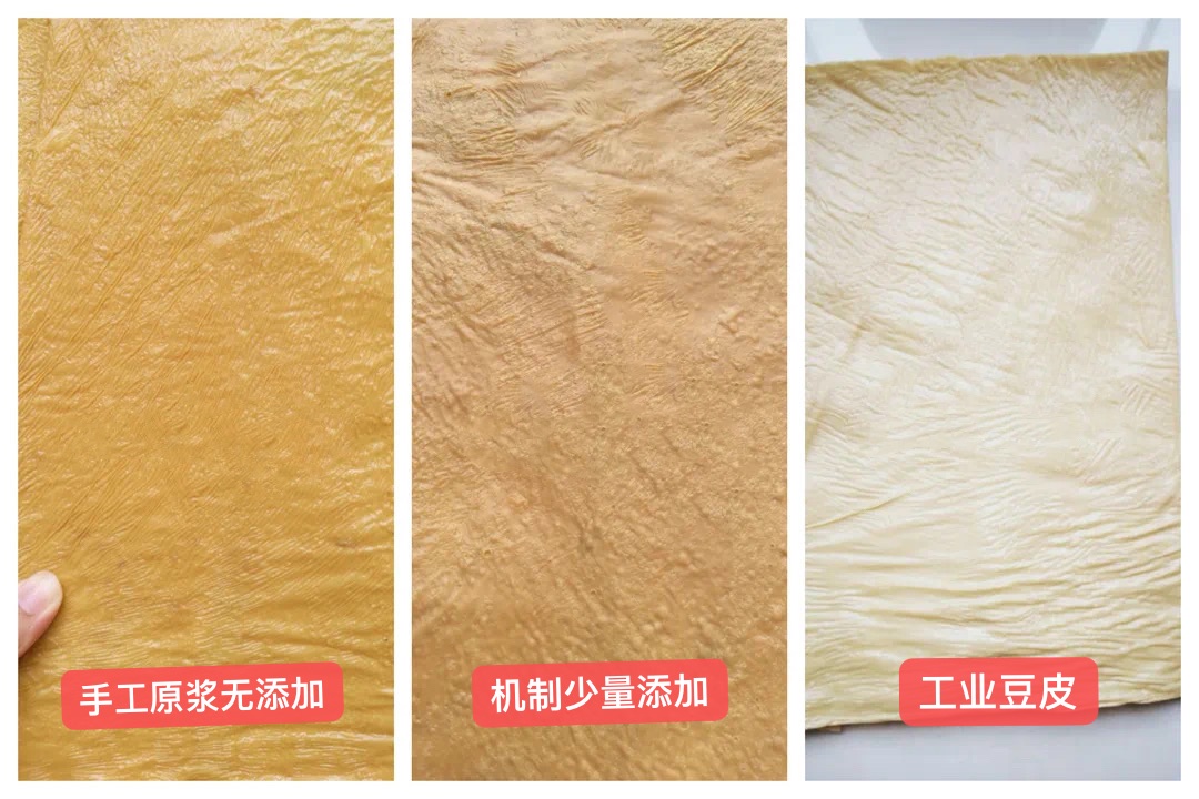 2⃣️机制少量添加:工厂流水线制作出来的豆腐皮,一锅豆浆可以揭起来很多的豆皮,甚至会使用凝固剂来增加产量,和手工原浆头层豆皮相比,口感和营养会差很多。