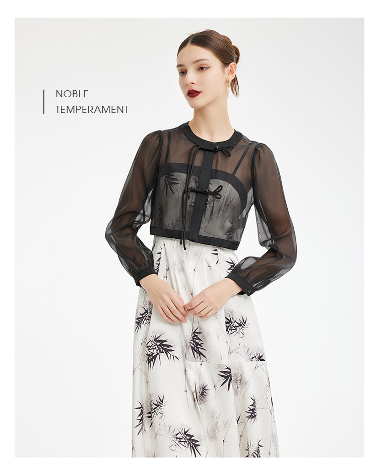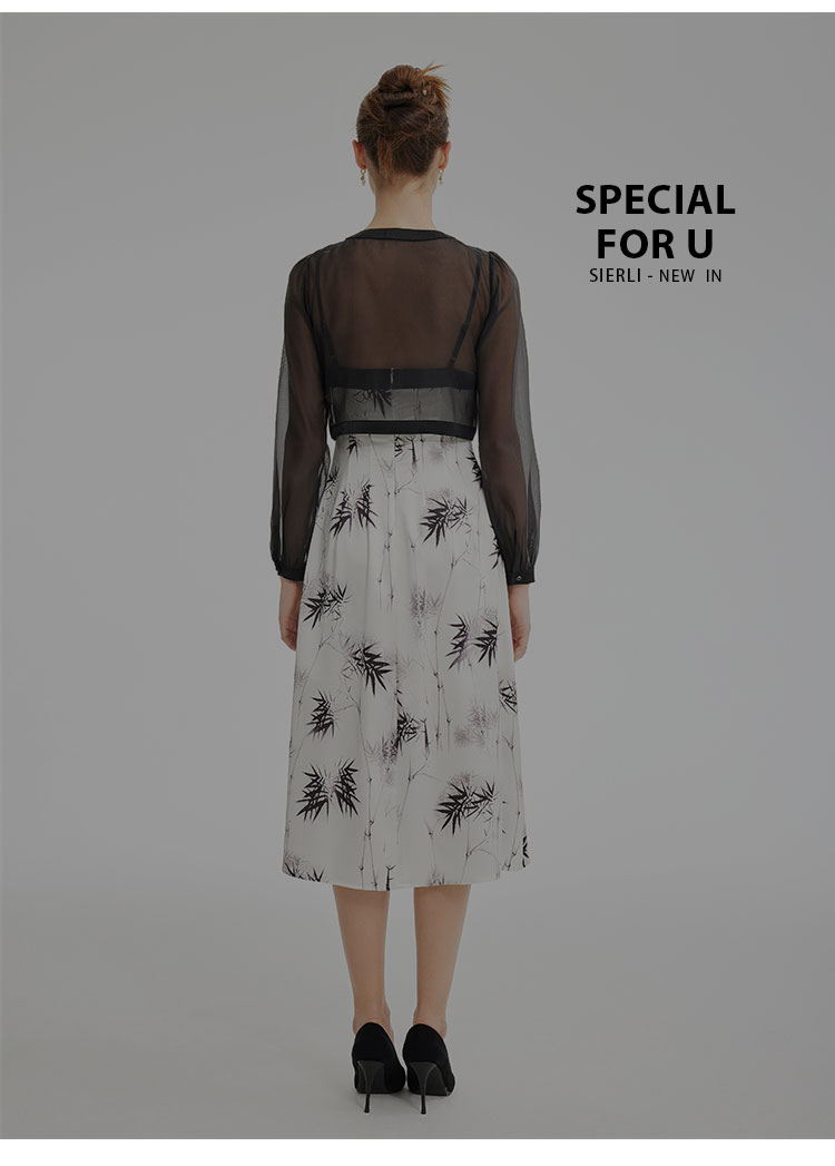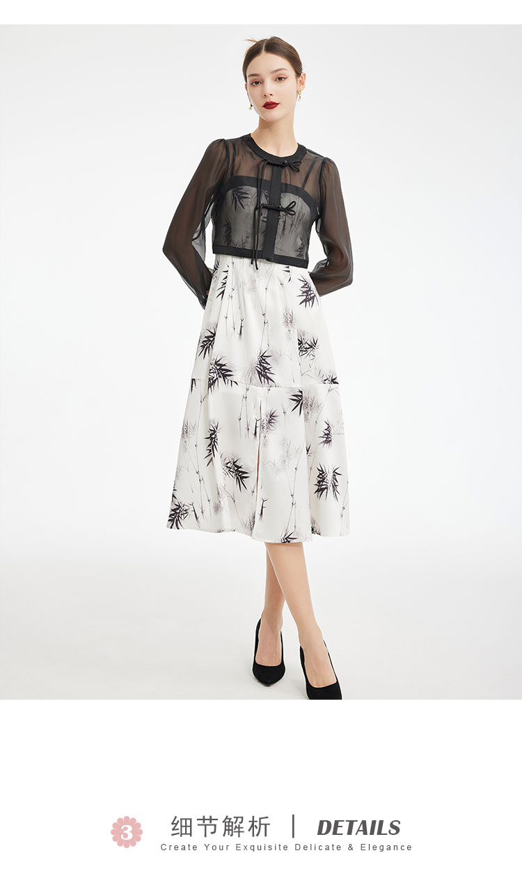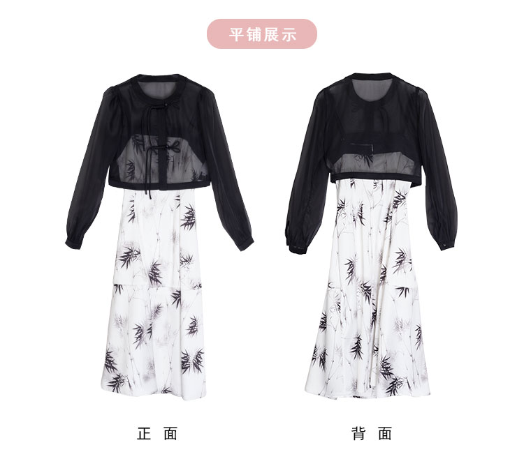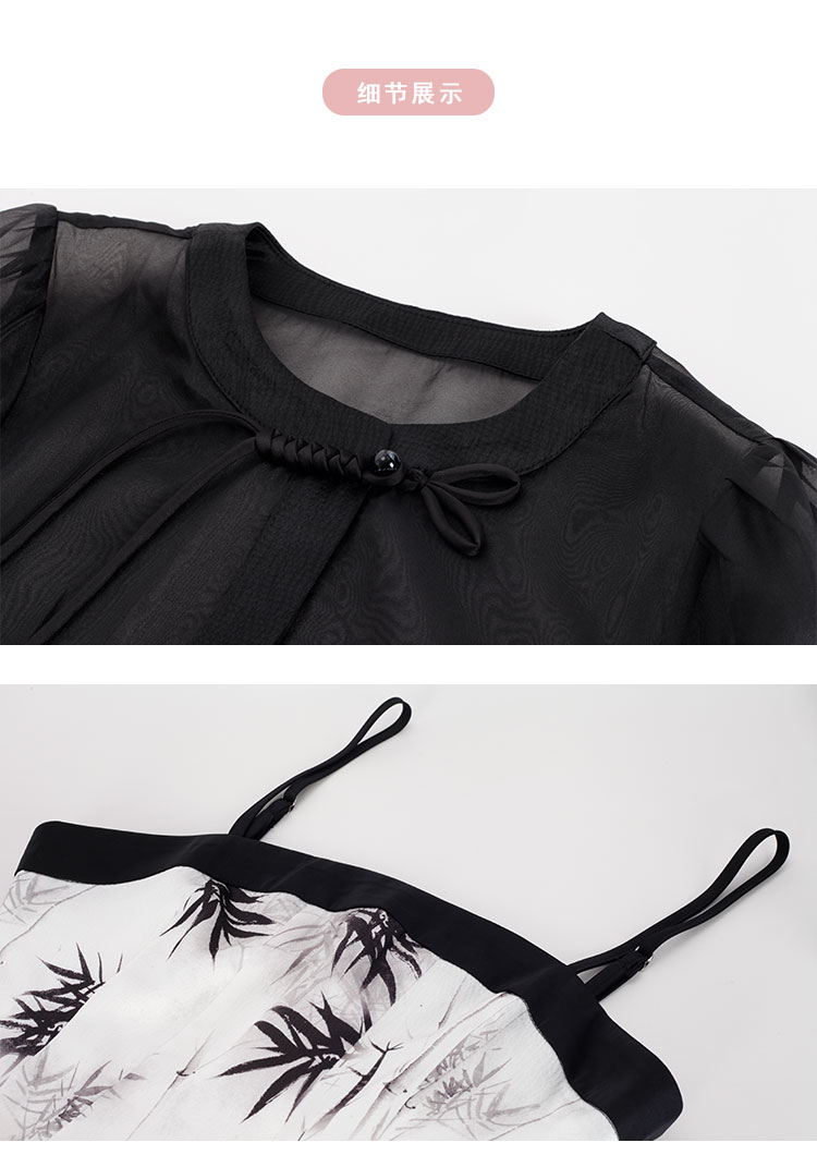 PF854斯尔丽2024新款国风系列薄纱箱型外套搭配吊带印花连衣裙两件套装