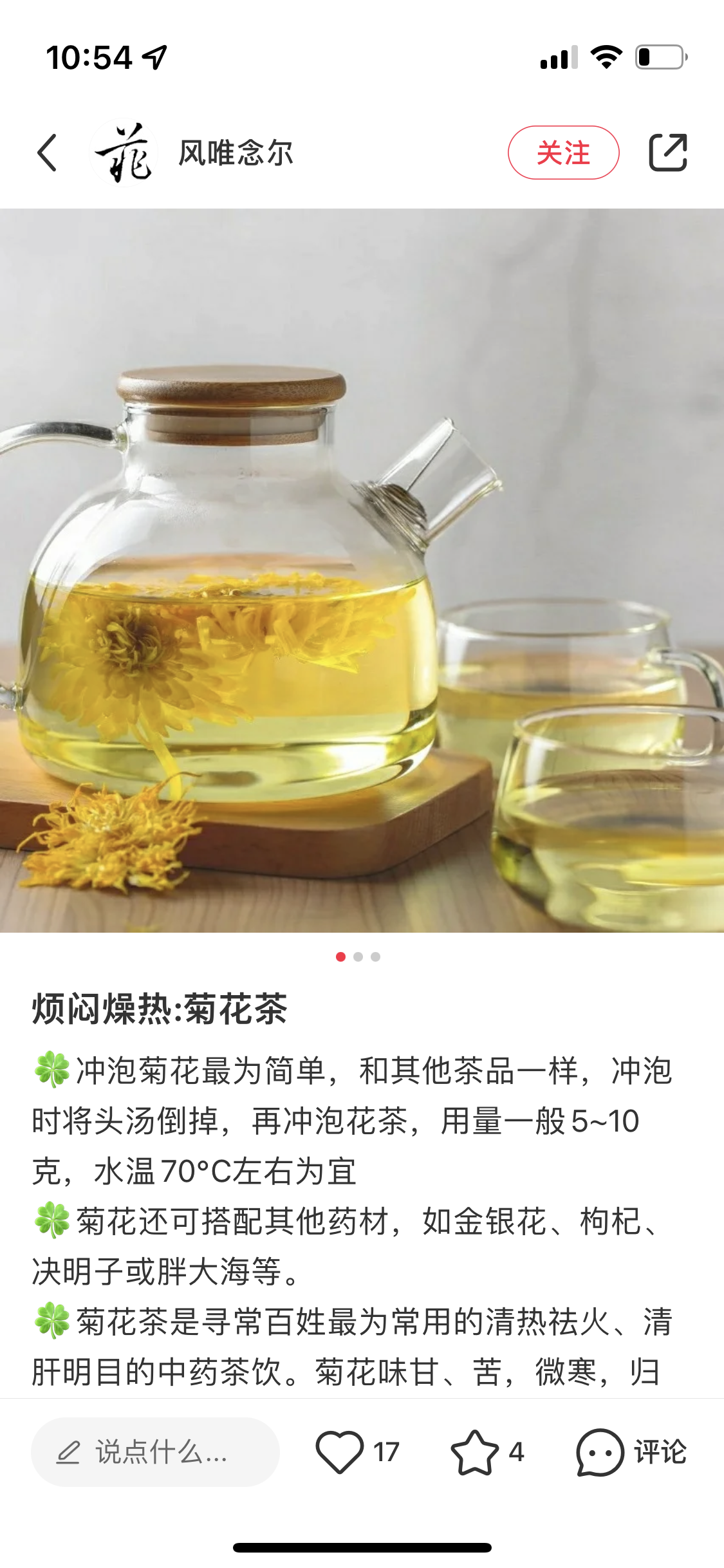 四季适宜,特别是冬天,天干物燥的,可以随时来一杯菊花茶去去火气。对于长期伏案工作的电脑族,手机党,熬夜族来说,可以很好的缓解肝火旺盛,用眼过度导致的干涩,能清肝明目,除了可以解风热,还可以解酒,去湿气,所以,闲着没事就多喝点~~哈哈,养生达人必备哟~~