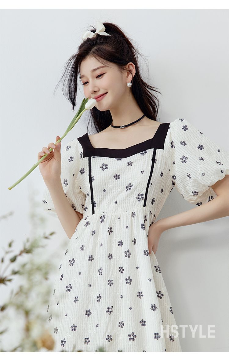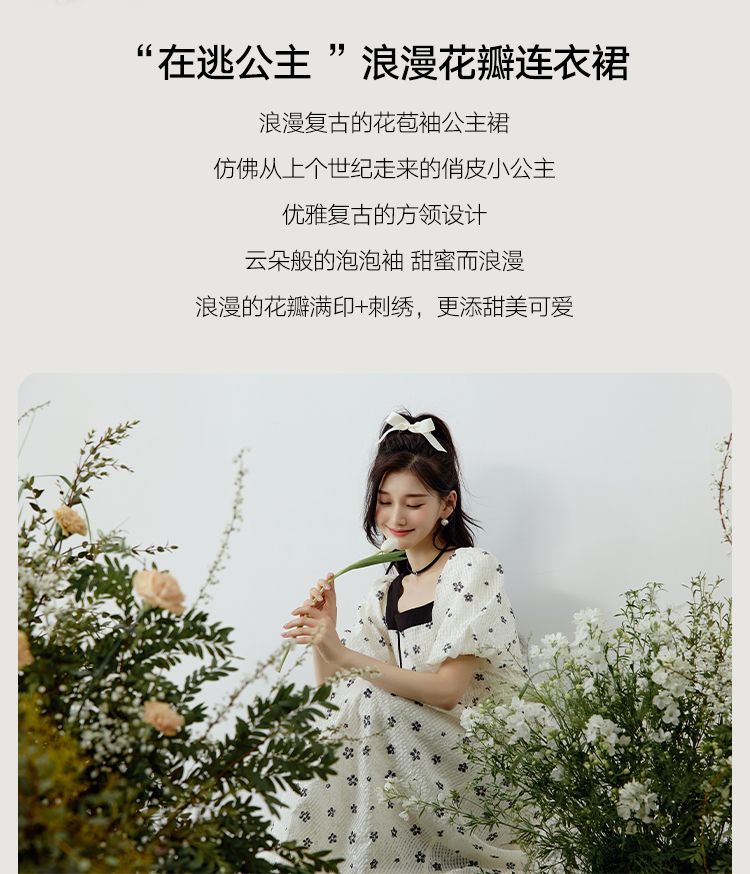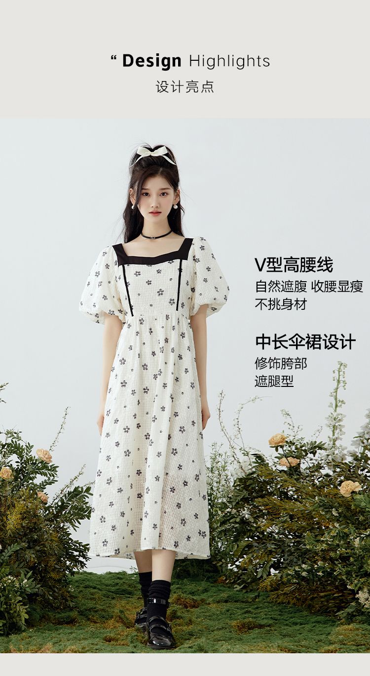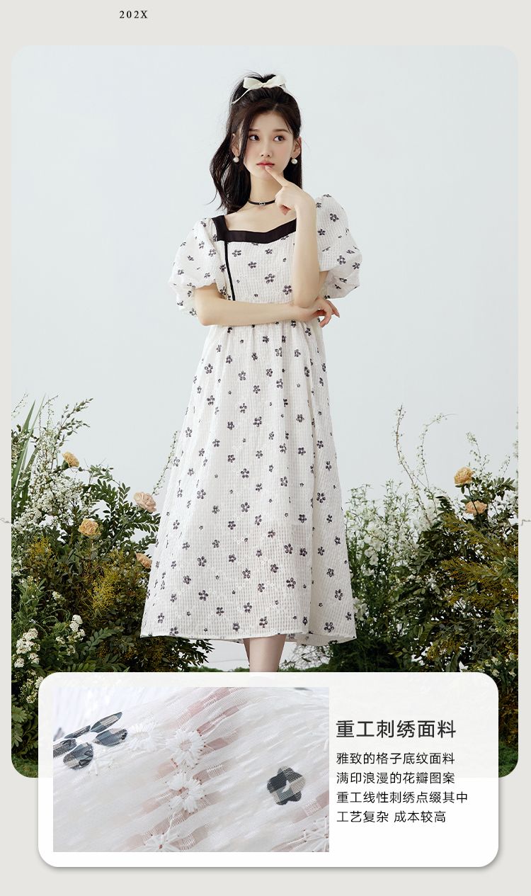 韩都衣舍方领连衣裙女薄款2023夏新款甜系收腰刺绣长裙子NFD0343