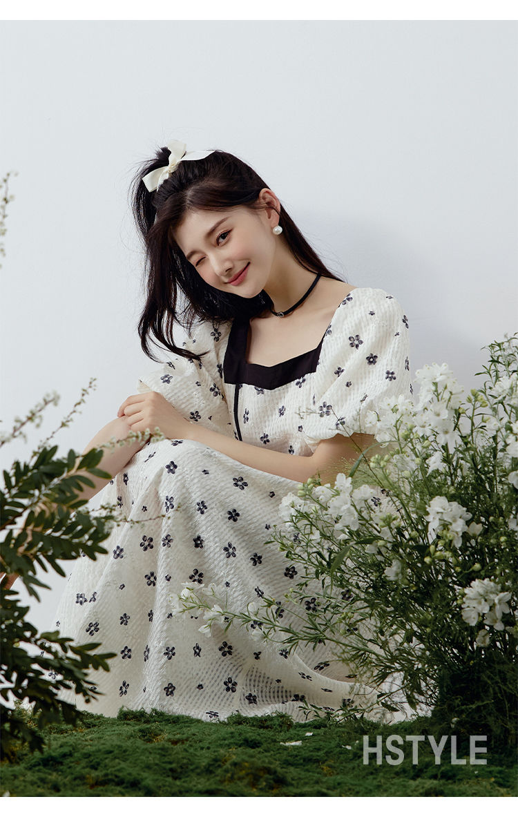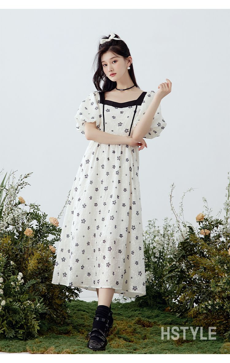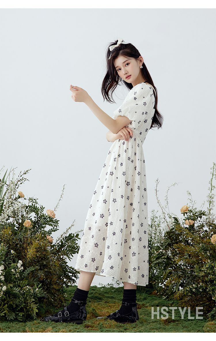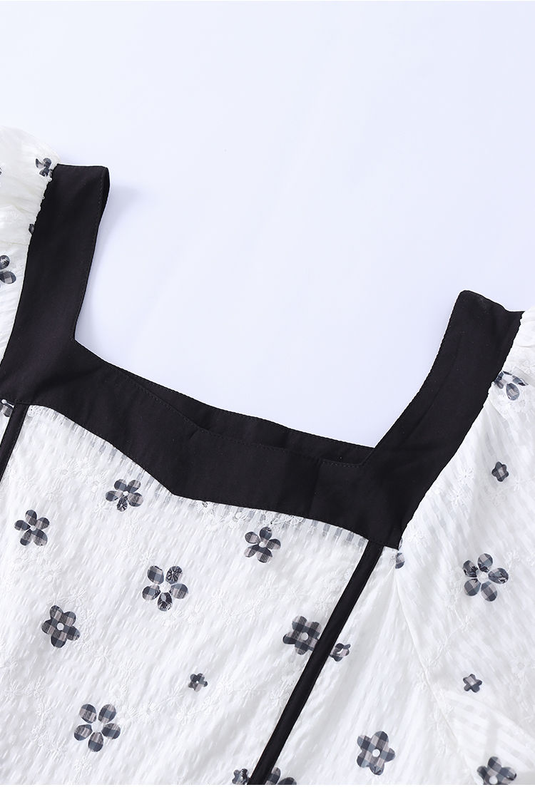 韩都衣舍方领连衣裙女薄款2023夏新款甜系收腰刺绣长裙子NFD0343