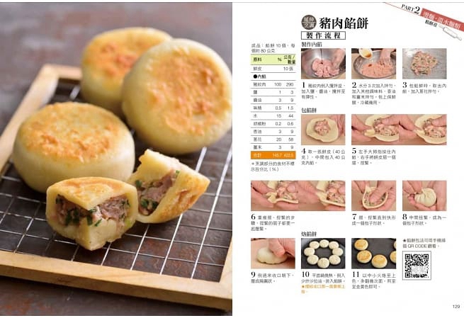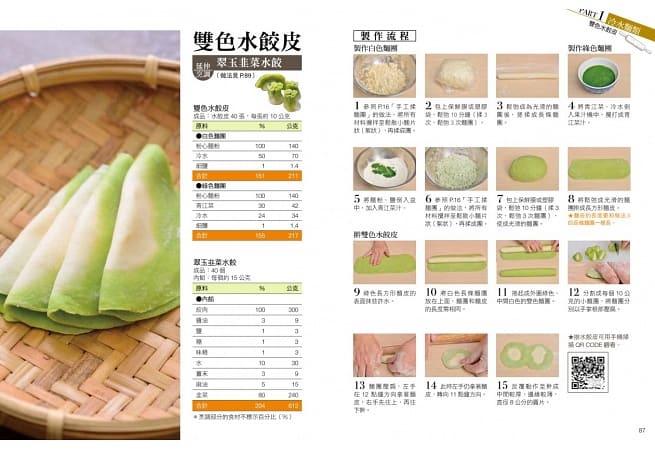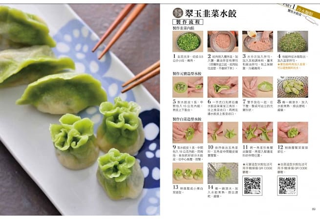 為了讓新手容易操作,劉妙華老師以「配方數字表格化」寫明食材;為了讓進階者能依據數量自行換算配方製作,每道麵點配方都附上百分比。此外,更將重點技法,例如:元寶造型、白菜造型、麥穂造型水餃,以及燒賣、小籠湯包、餡餅的包法,用QR CODE影片輔助說明,利用手機隨時可以看,以圖文加上影片,大大提升成功率。