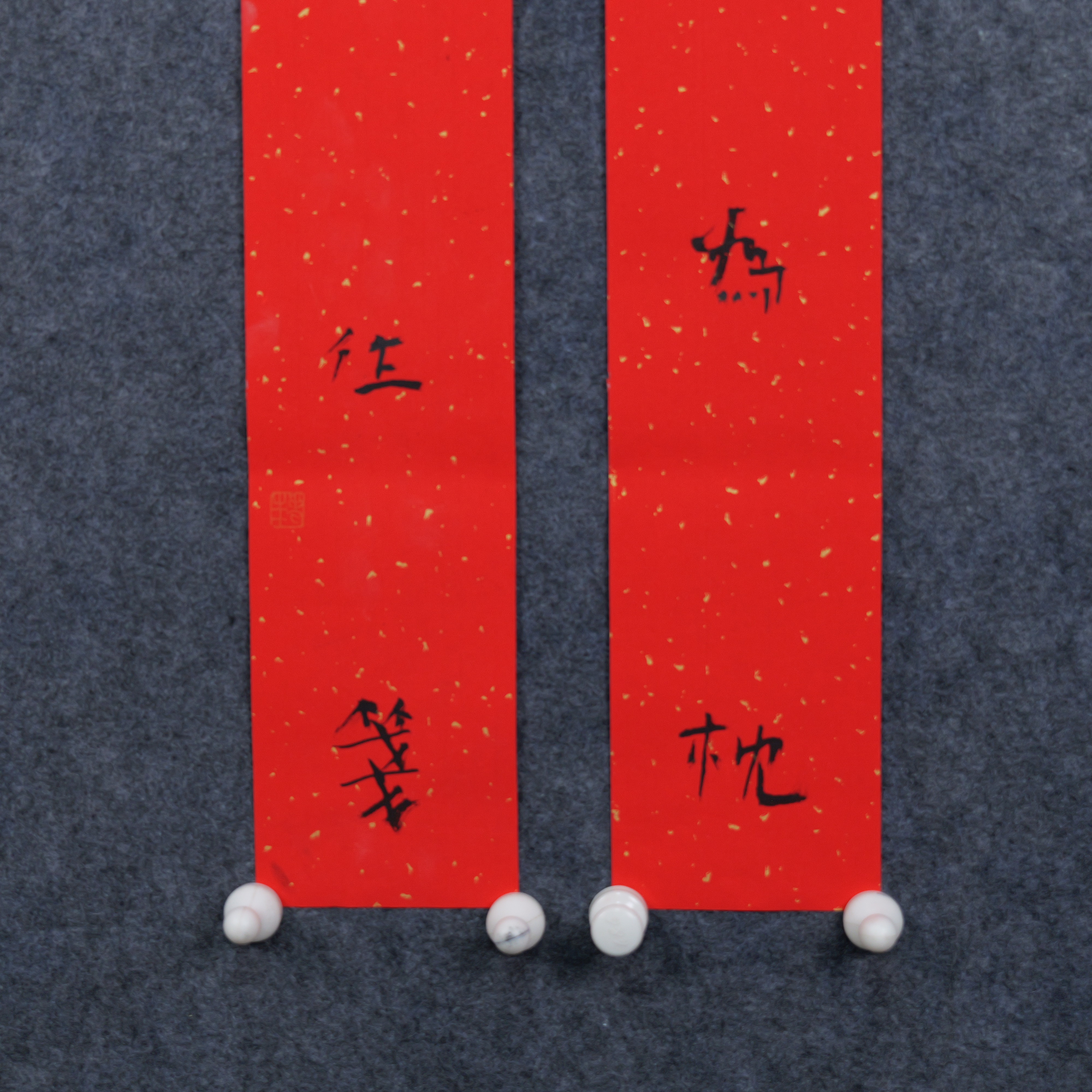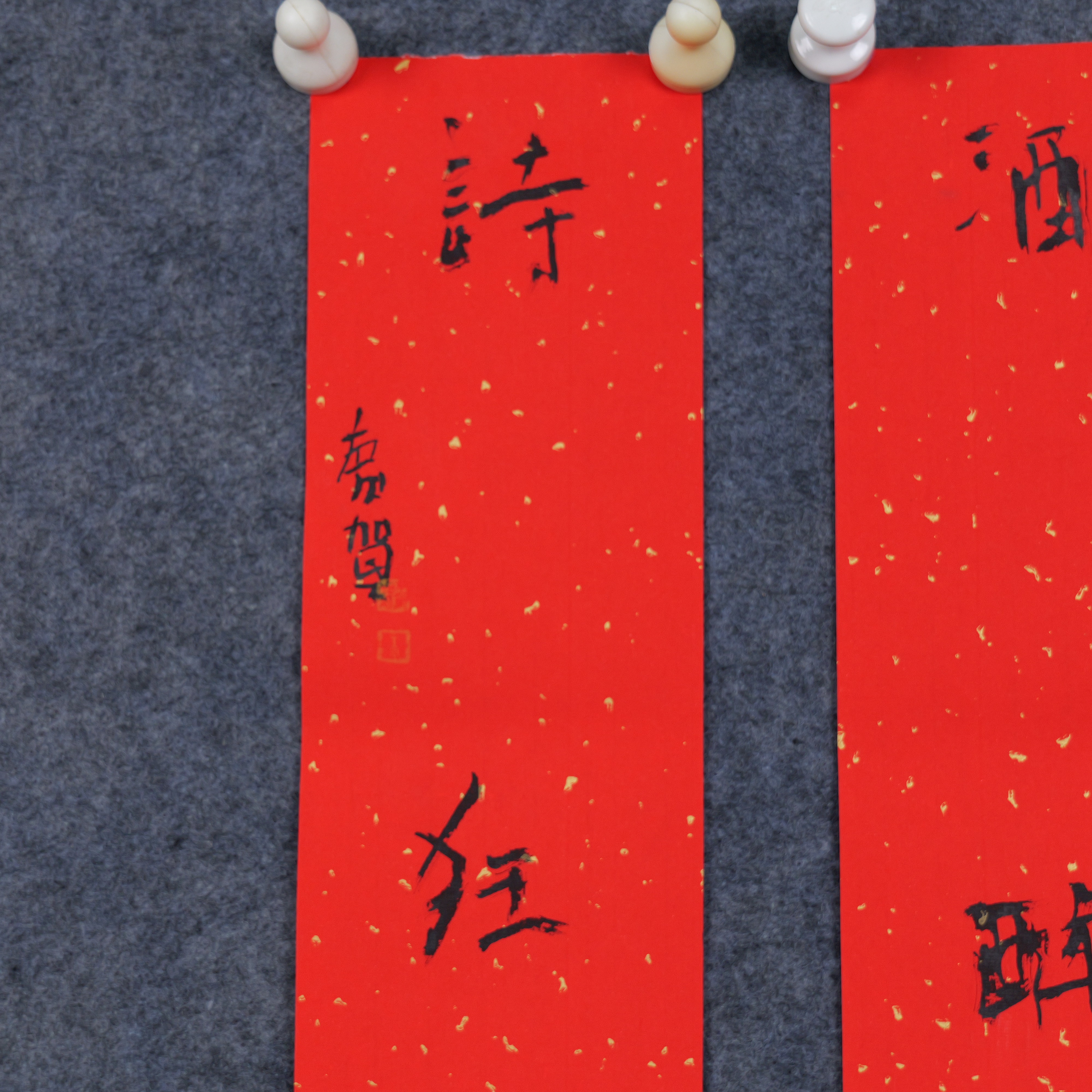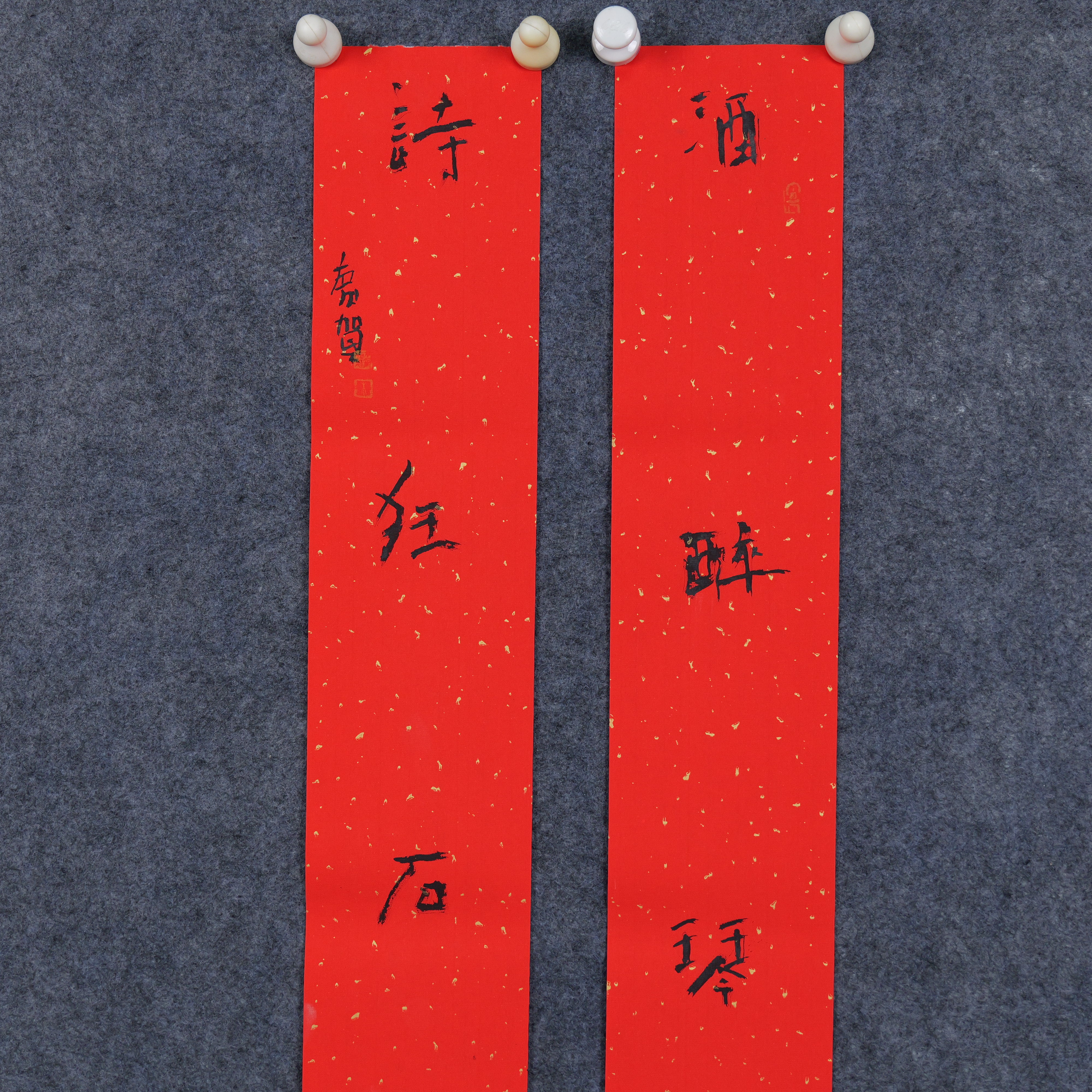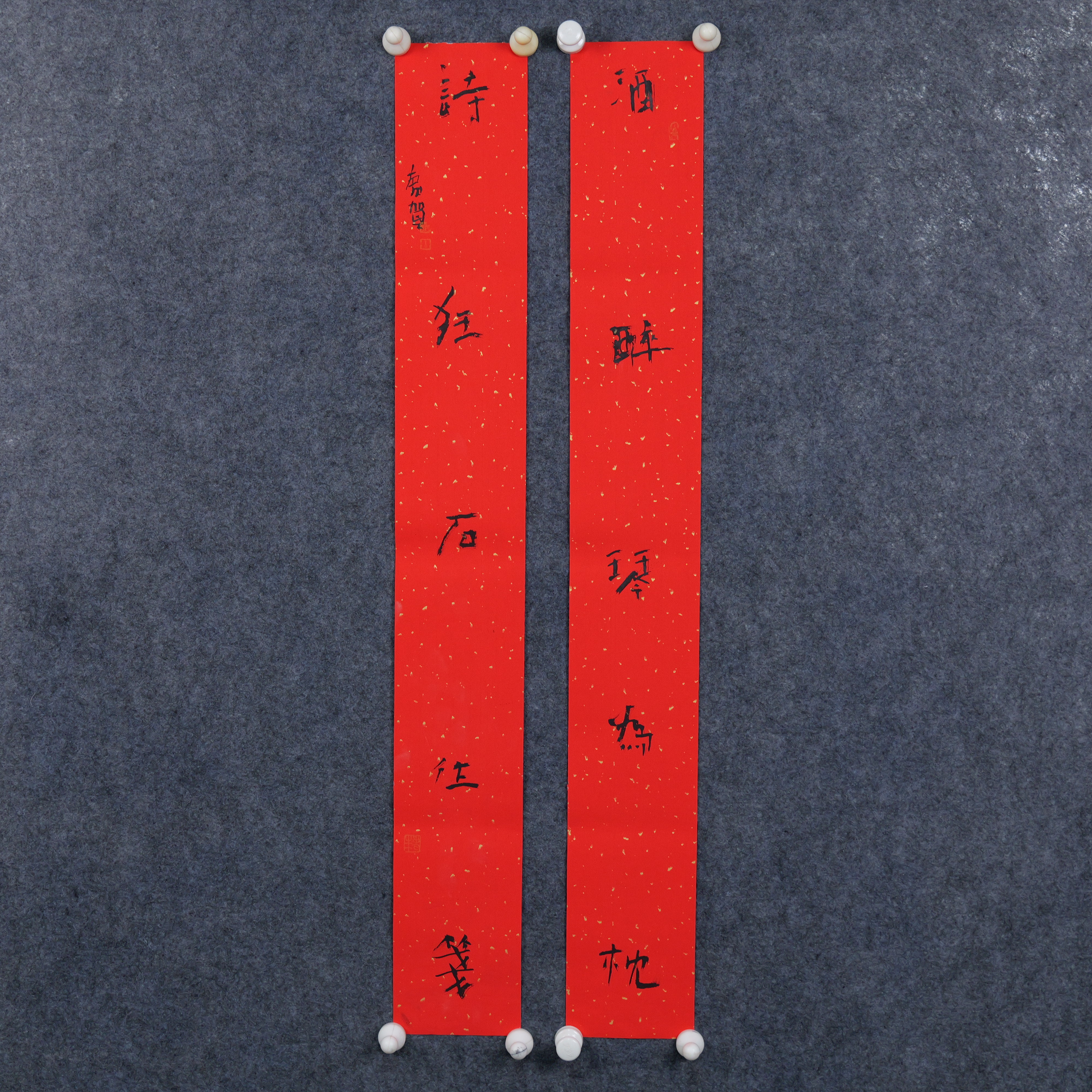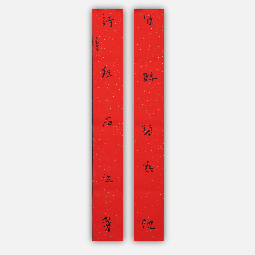 朱广贺《酒醉琴为枕 诗狂石往笺》88.5x11.5cmx2 手写纸本春联纸书法对联