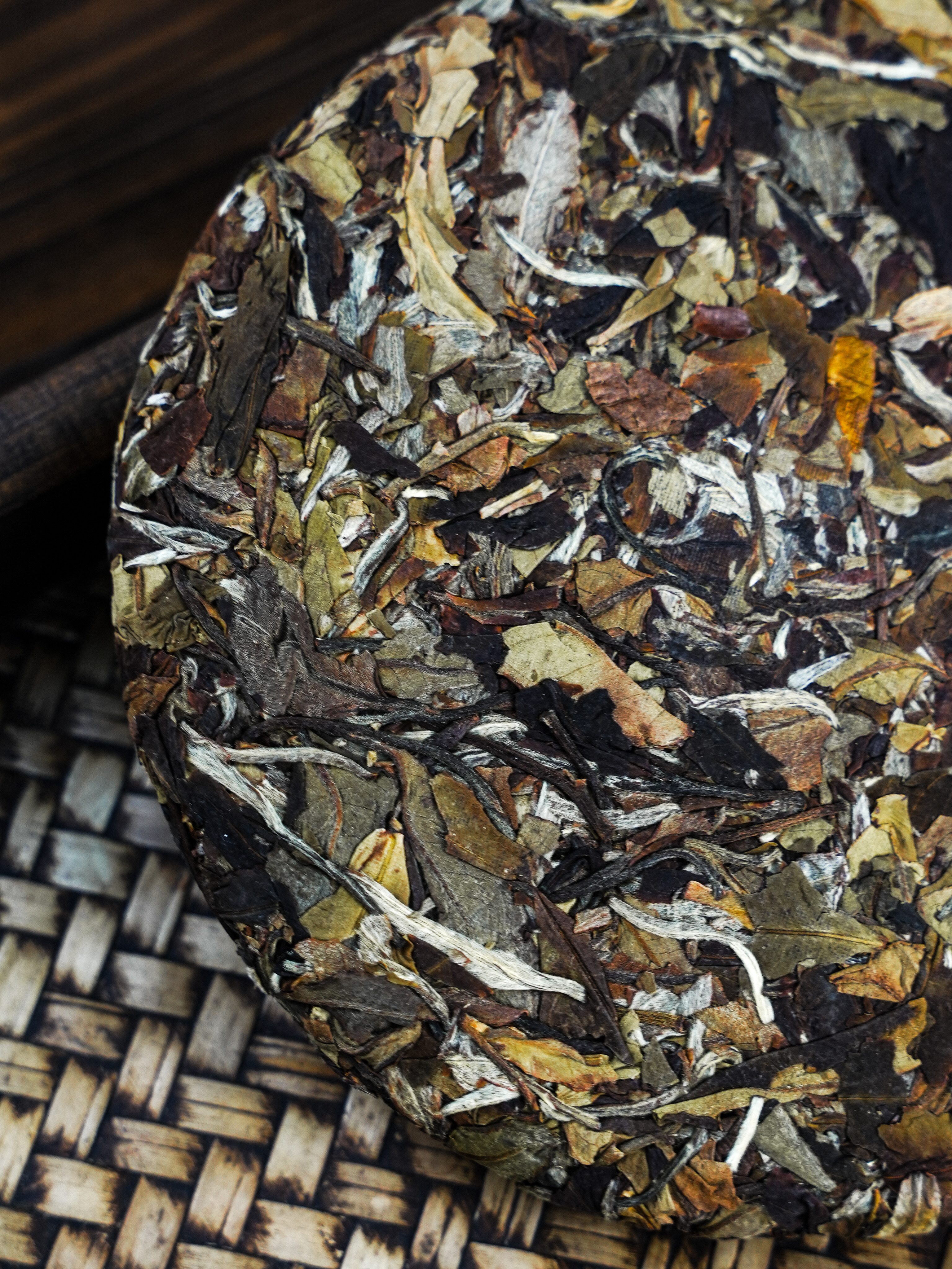 干茶赏鉴:饼形圆润周正,条索肥壮显毫,色泽由墨绿向黄褐自然过渡,银毫密布,如披星月。
