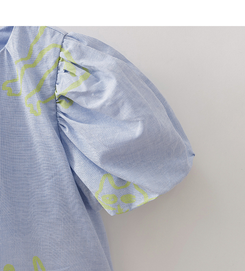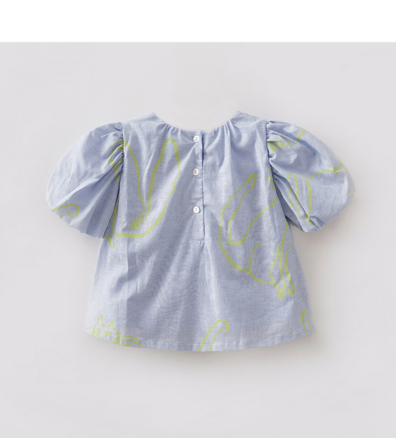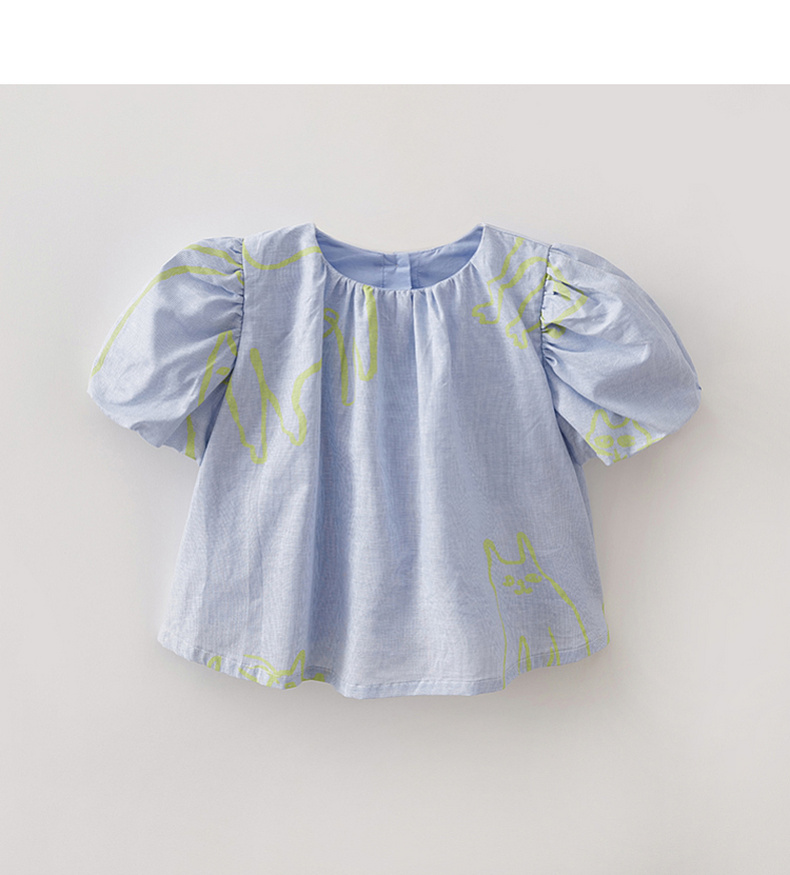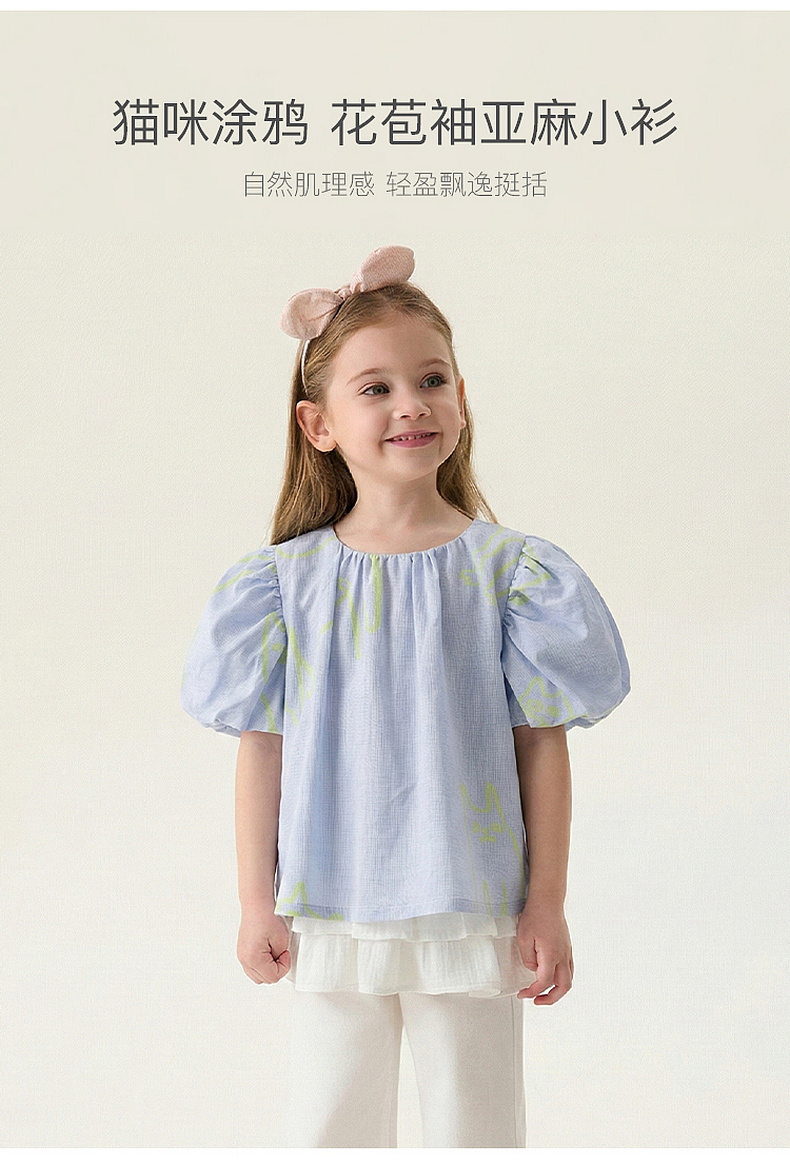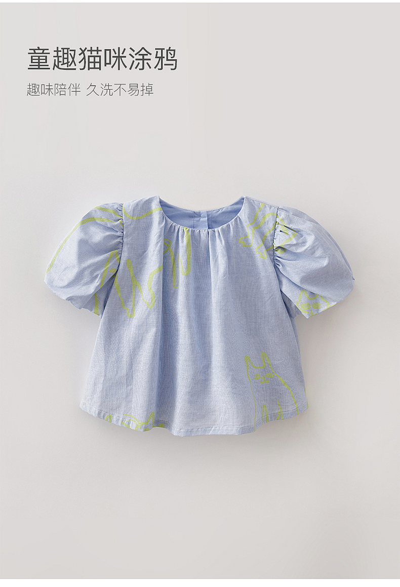 马克珍妮猫咪涂鸦女童花苞袖亚麻小衫2026年夏装新款561023