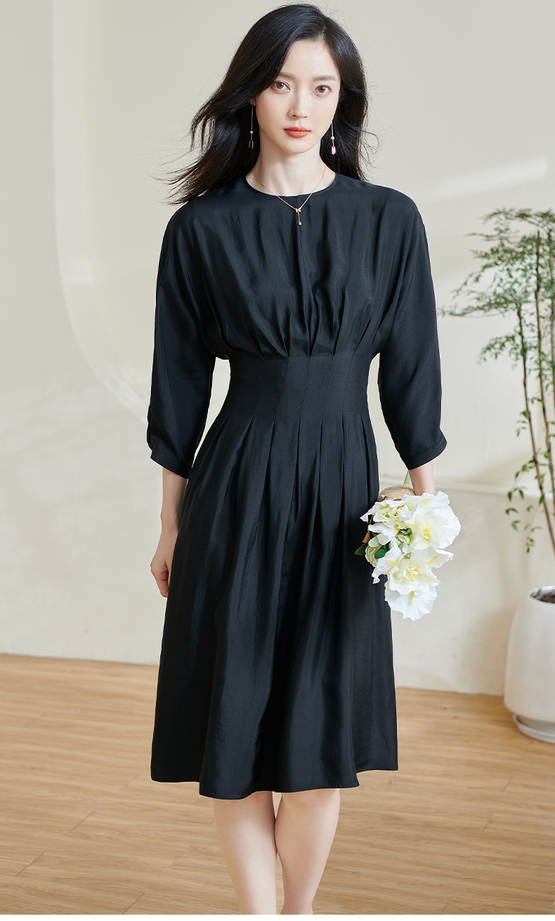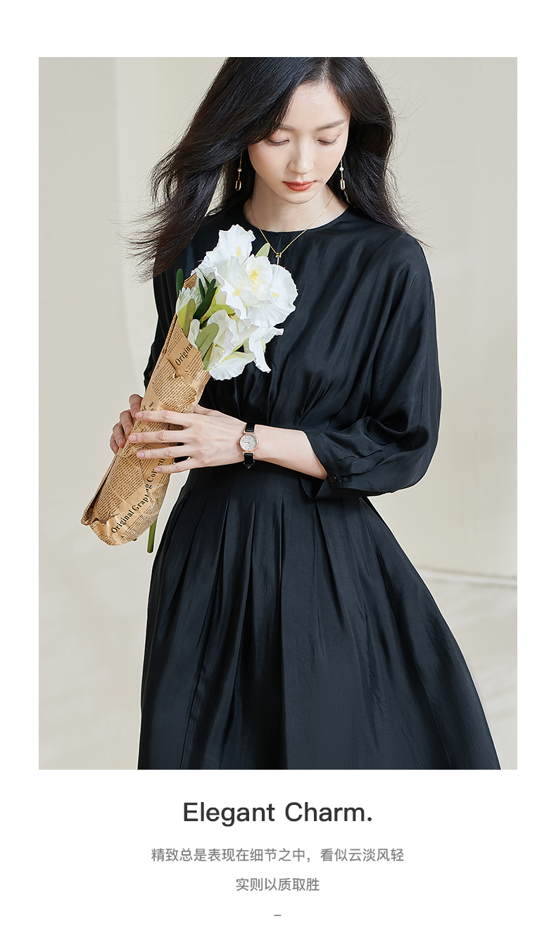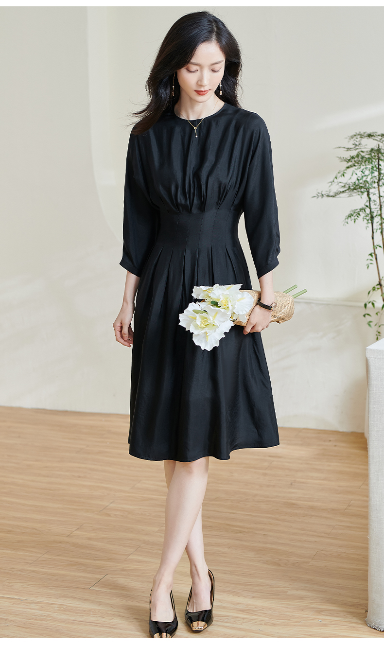 米思阳2026春季新款赫本风气质褶皱小黑裙收腰醋酸透气连衣裙0464