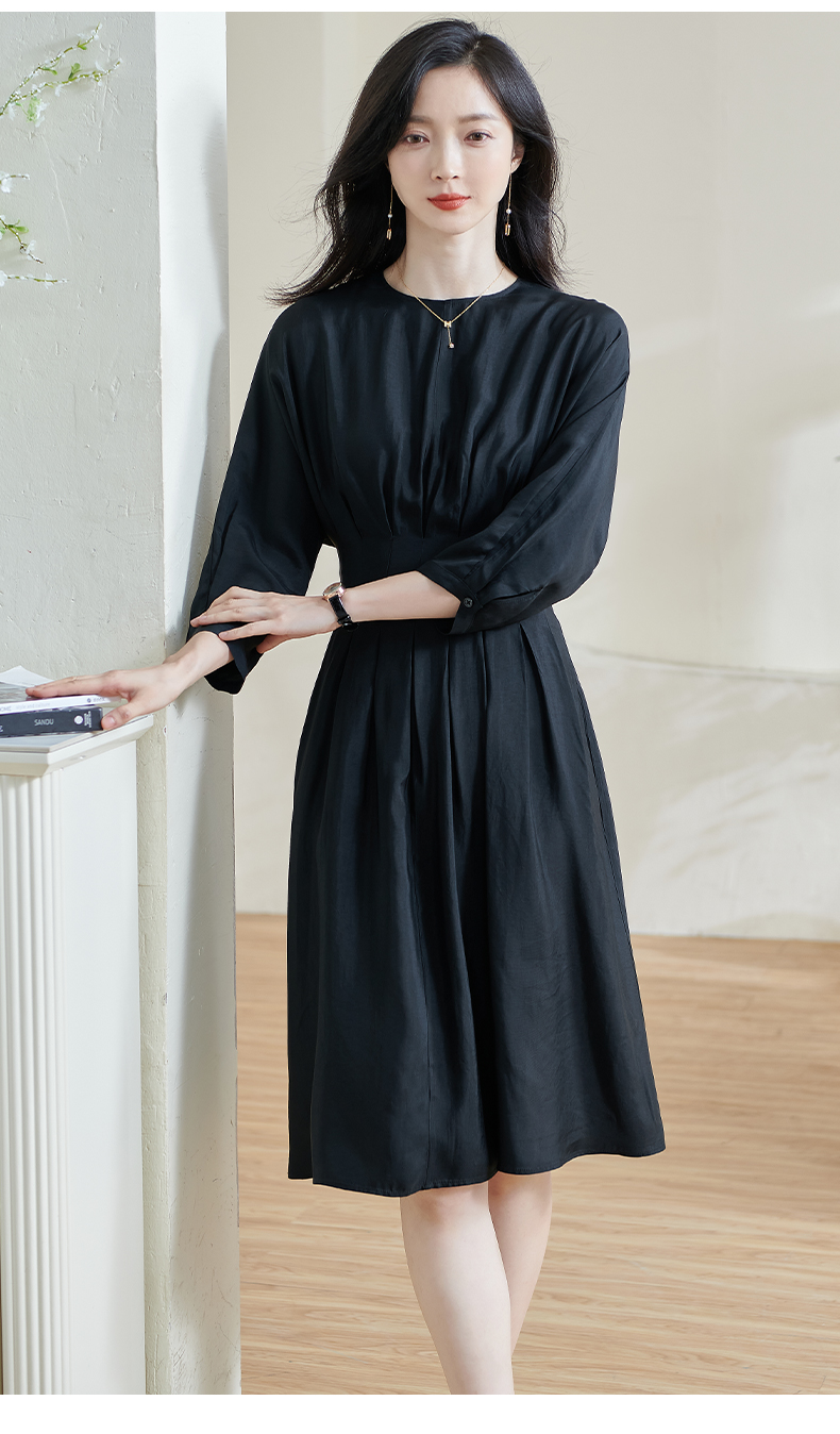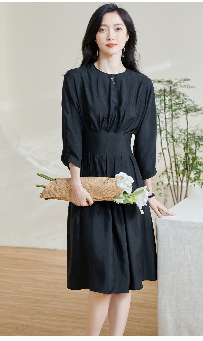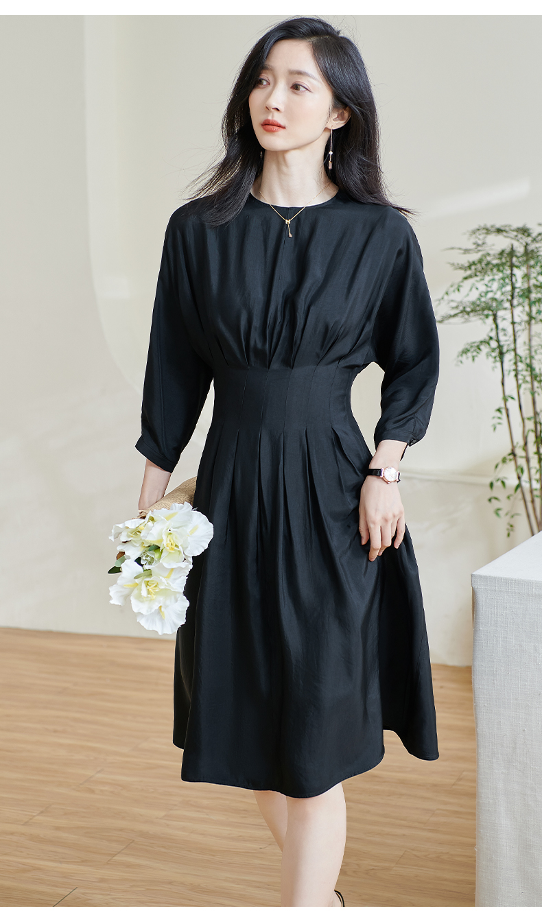 米思阳2026春季新款赫本风气质褶皱小黑裙收腰醋酸透气连衣裙0464