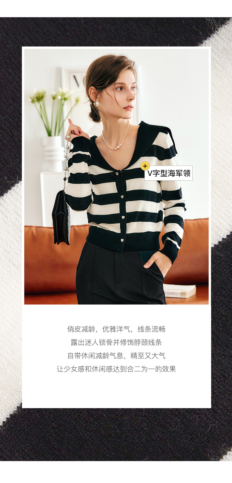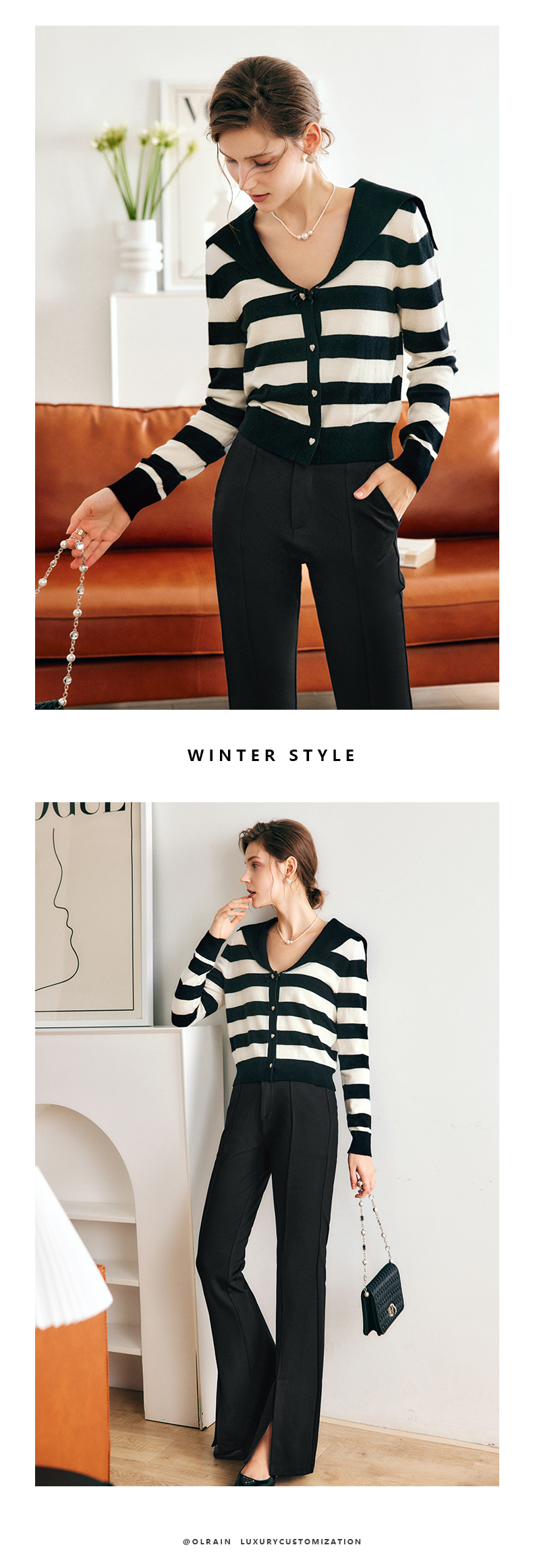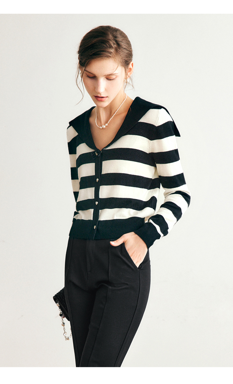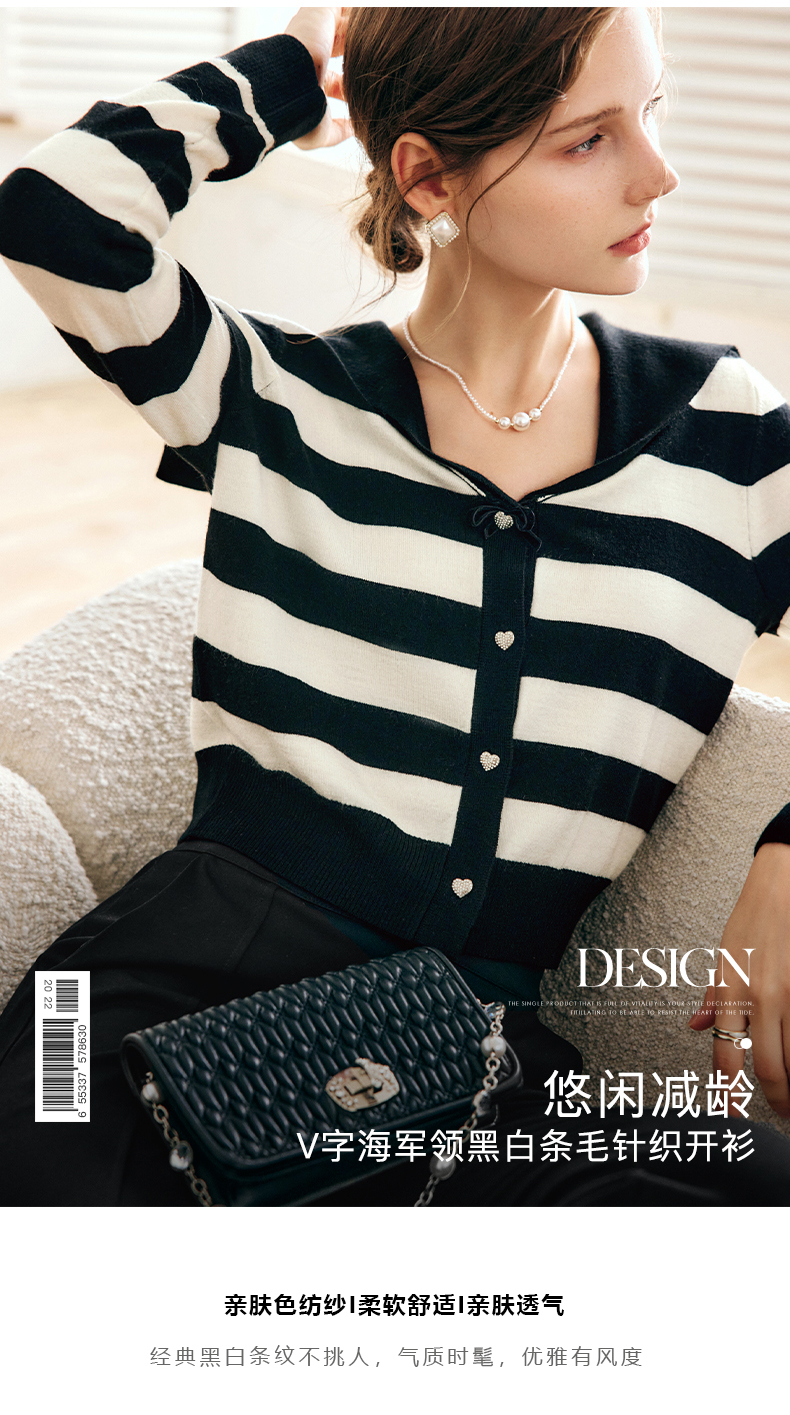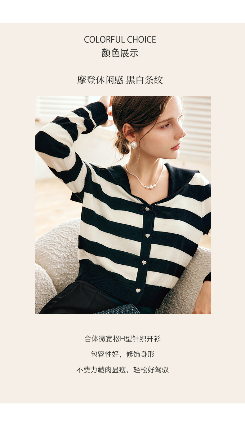 OLrain法式黑白条纹针织开衫女早秋2022年新款时尚修身海军领上衣