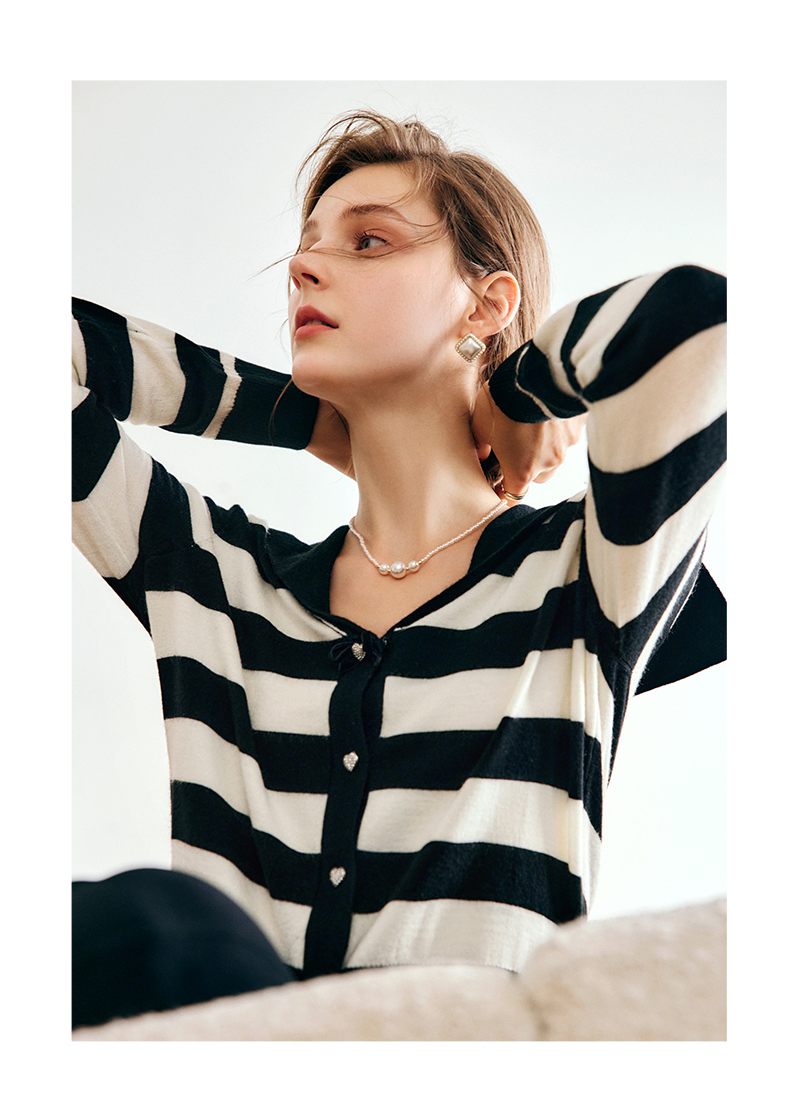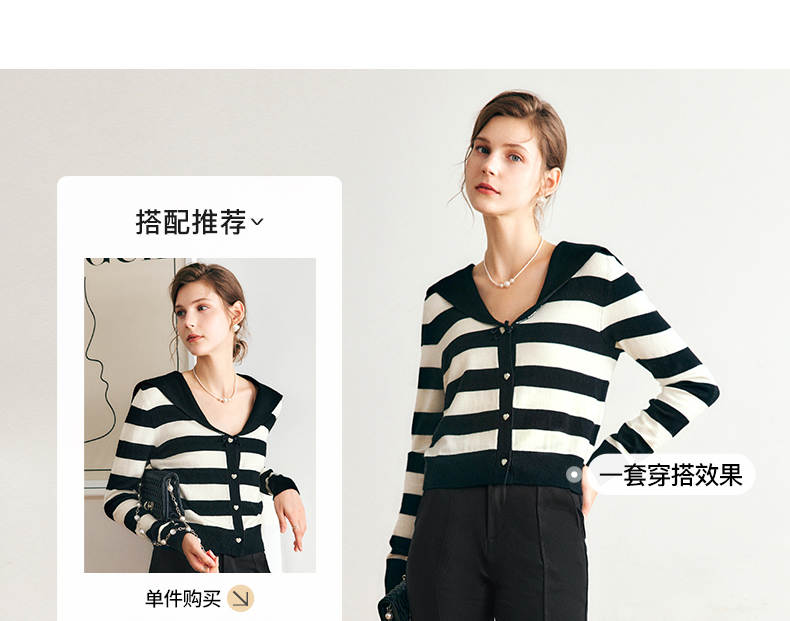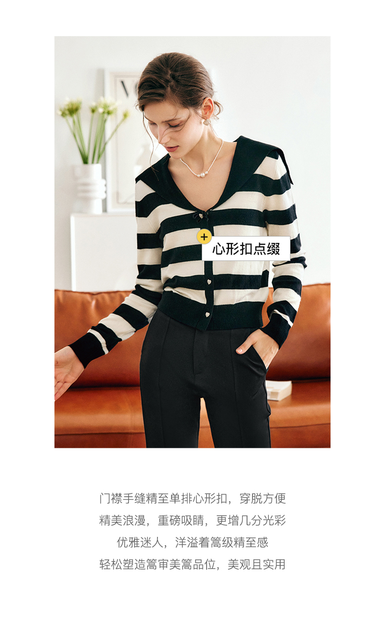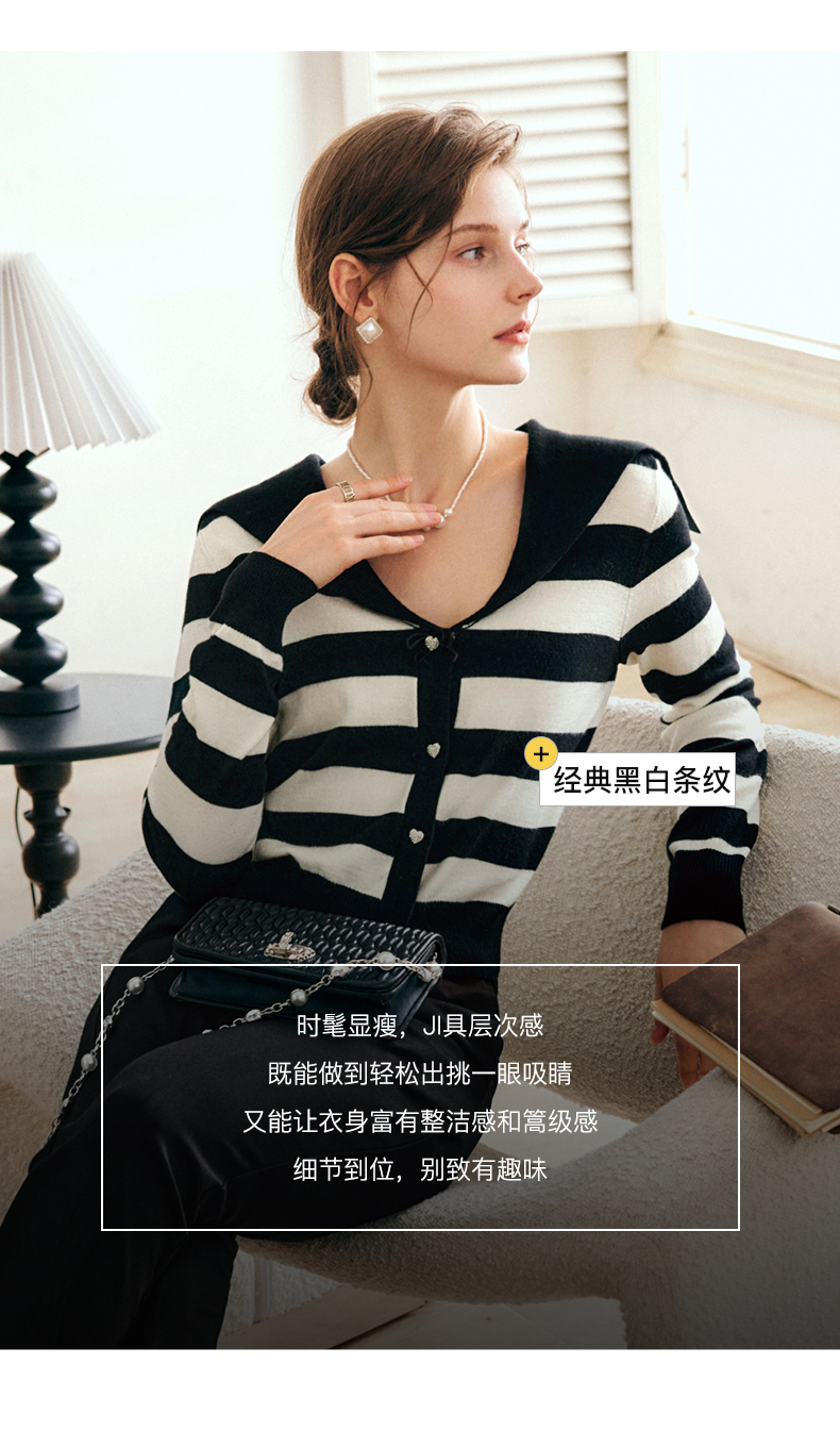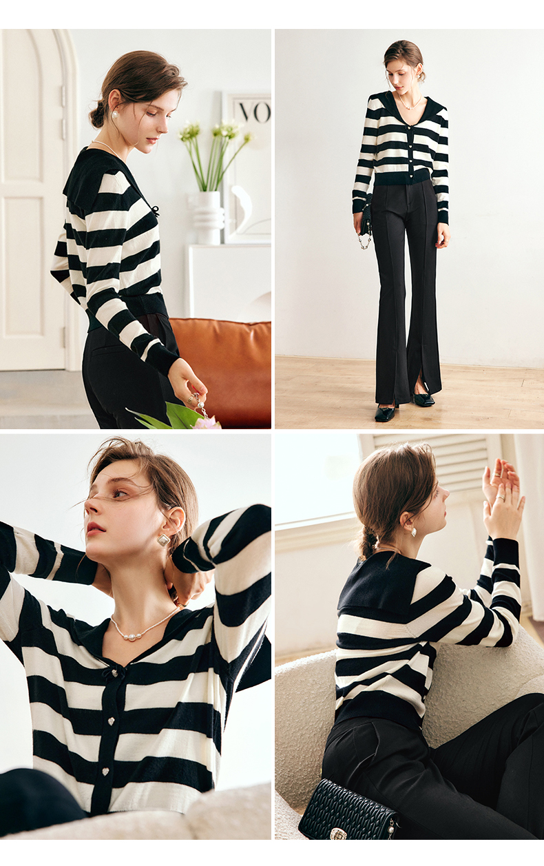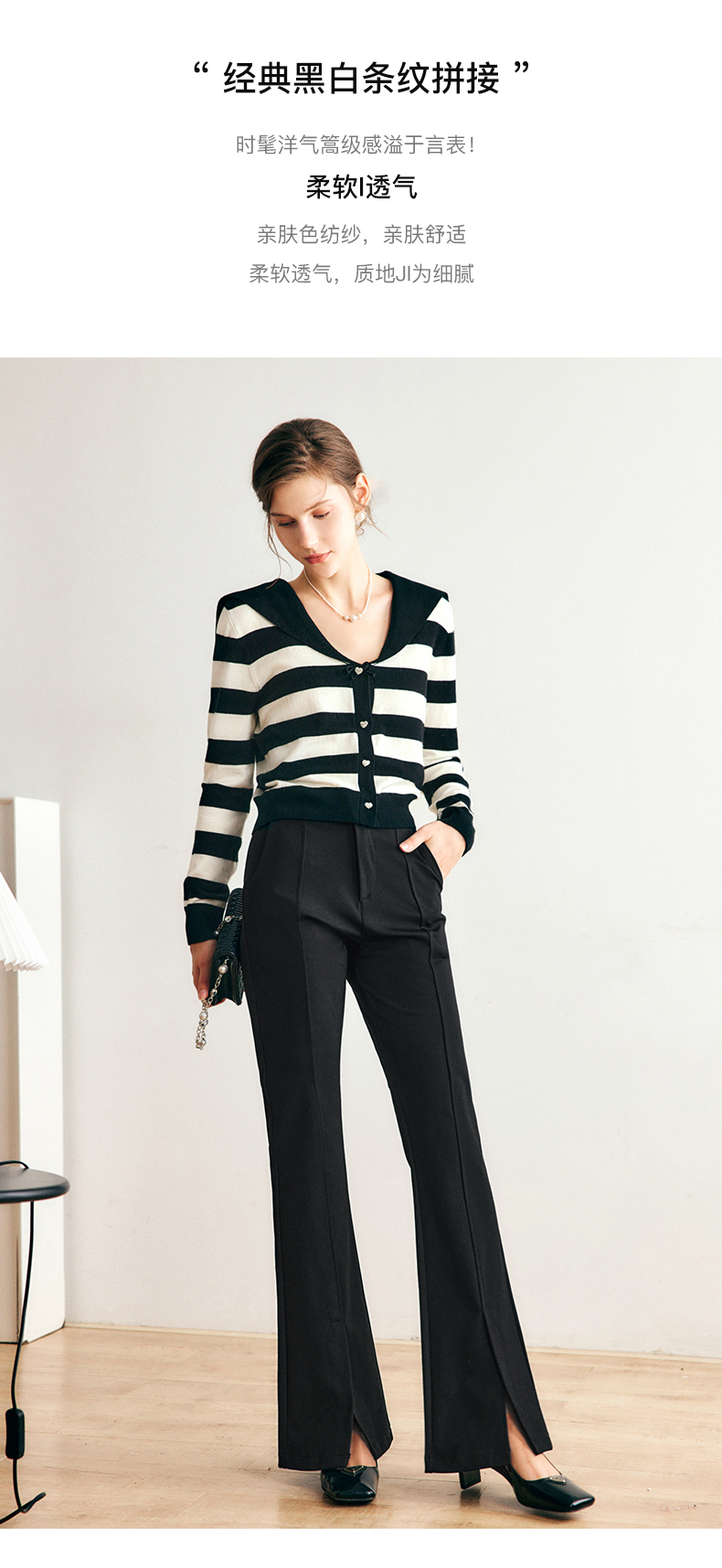 OLrain法式黑白条纹针织开衫女早秋2022年新款时尚修身海军领上衣