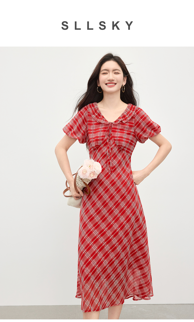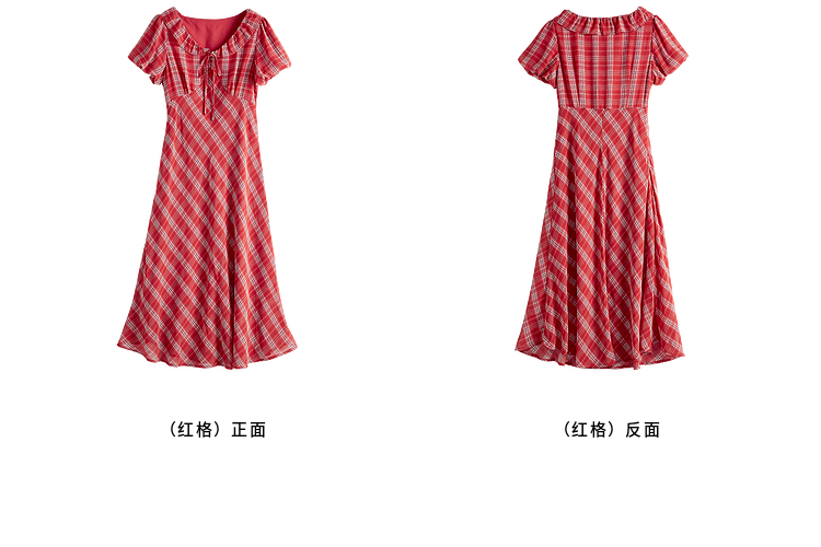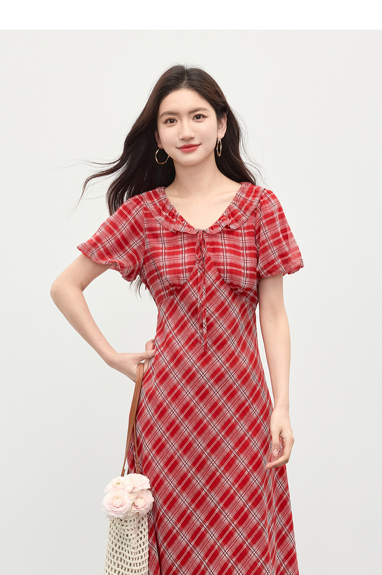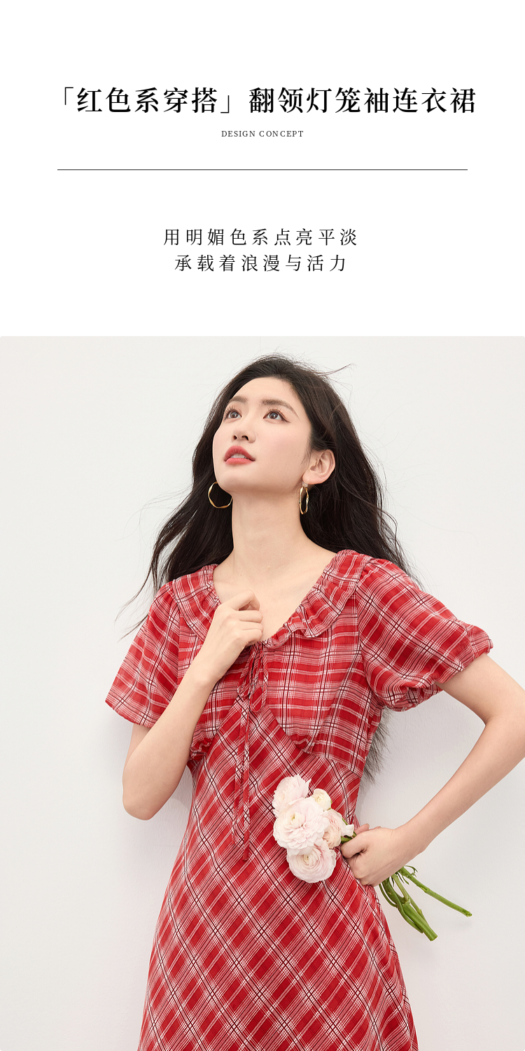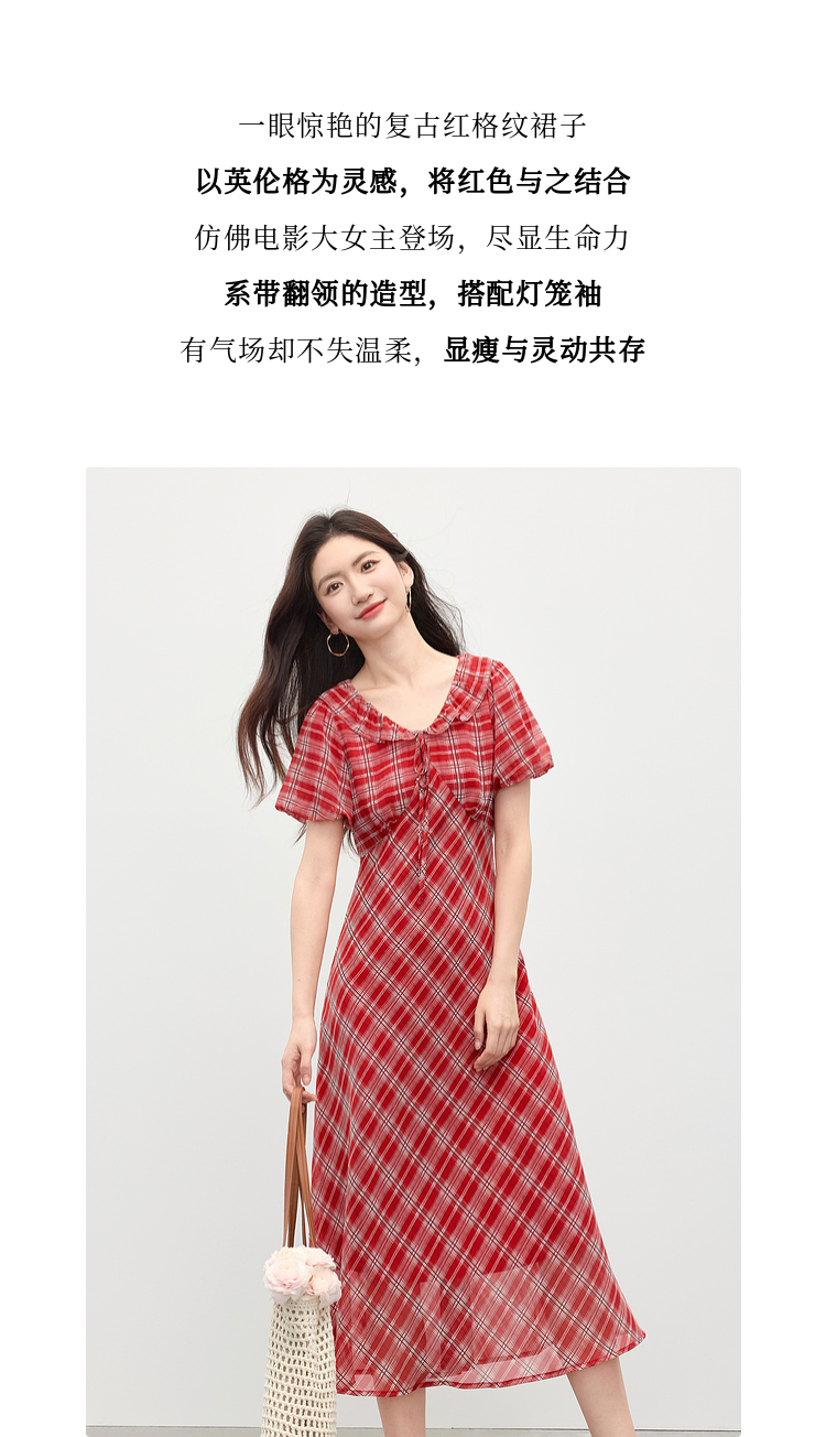 熙世界复古红色格纹连衣裙女高级感夏季气质灯笼袖海边度假长裙子