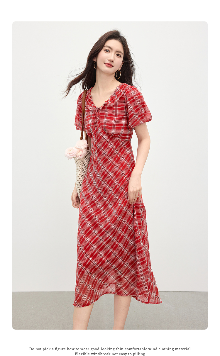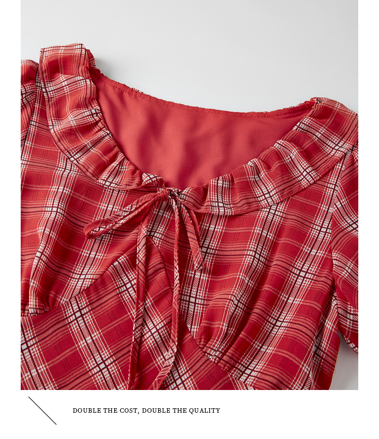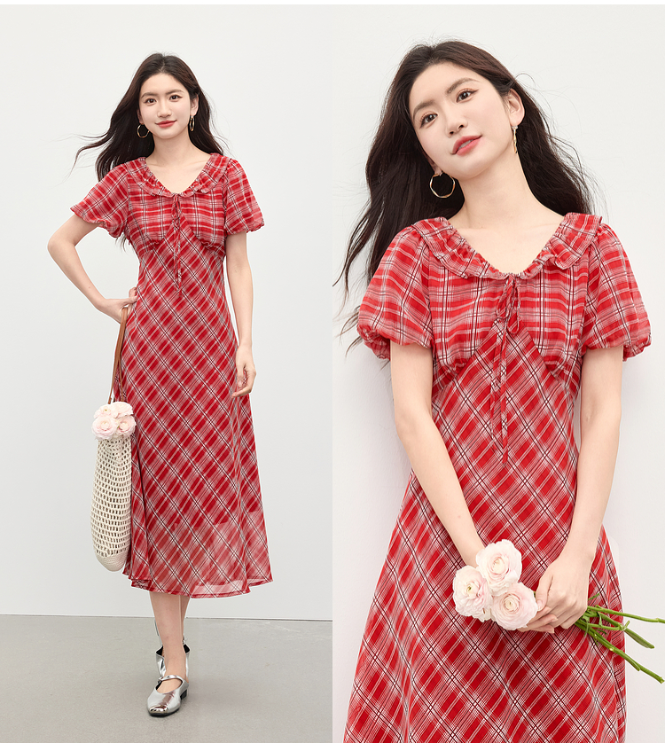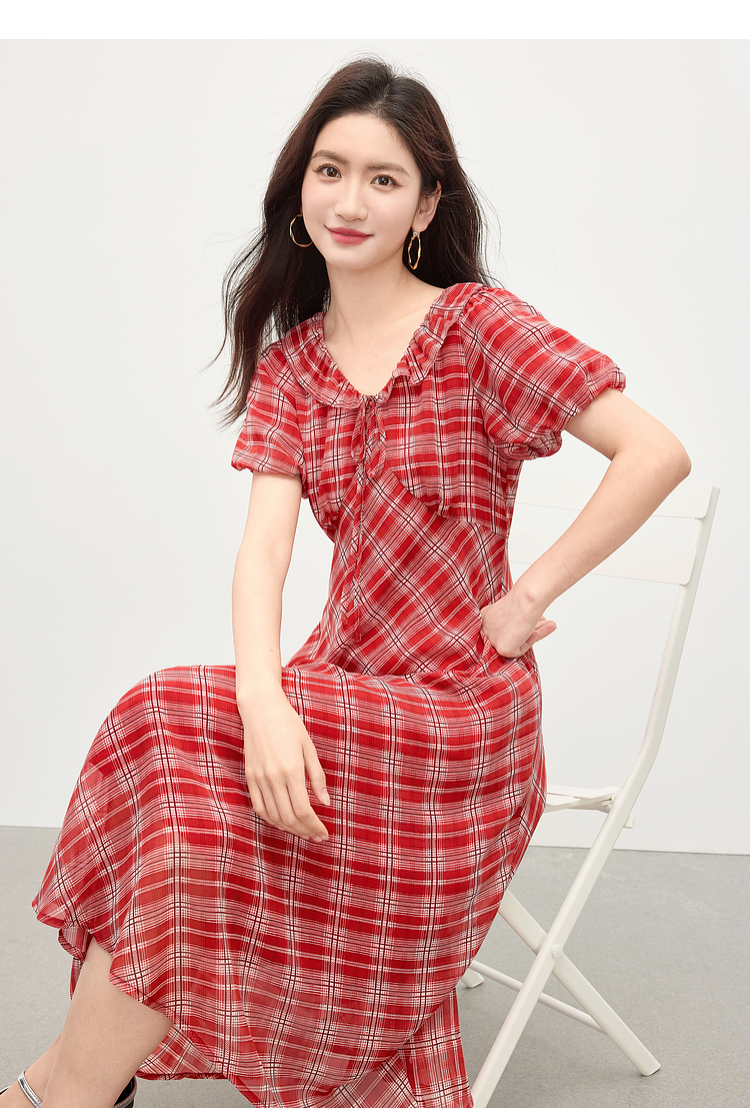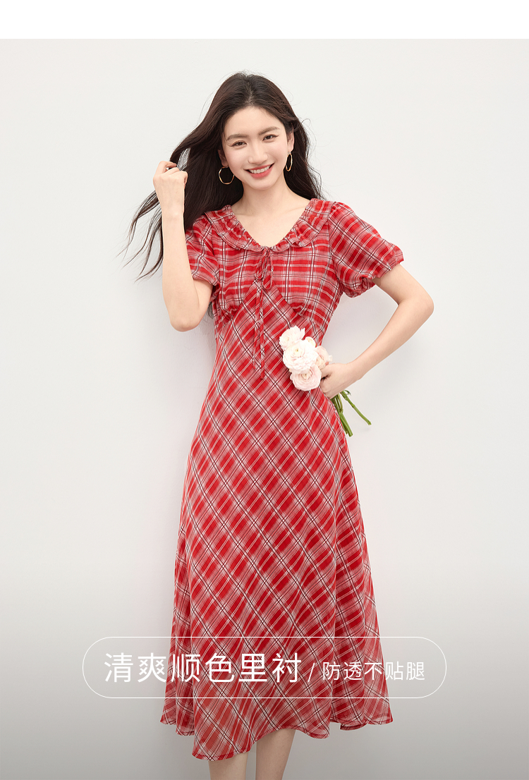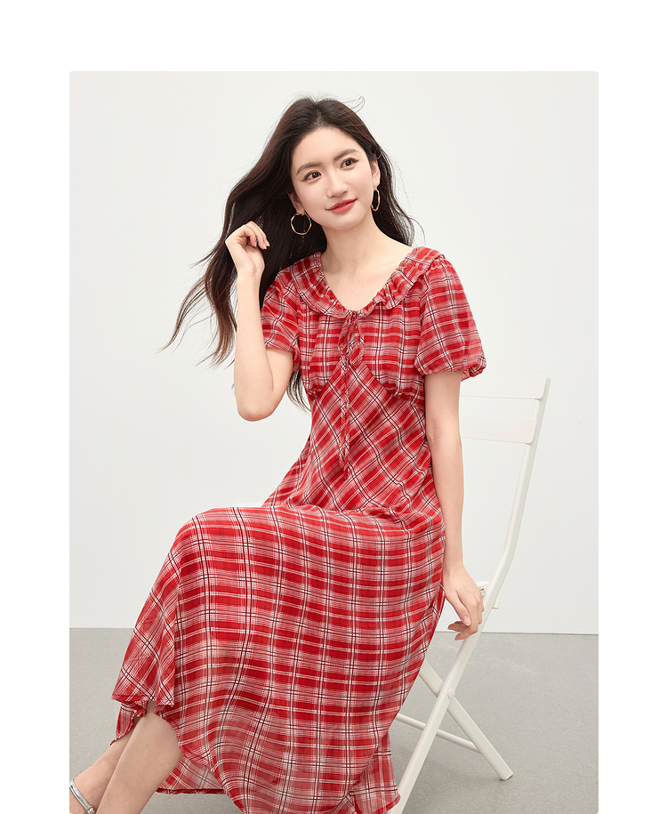 熙世界复古红色格纹连衣裙女高级感夏季气质灯笼袖海边度假长裙子