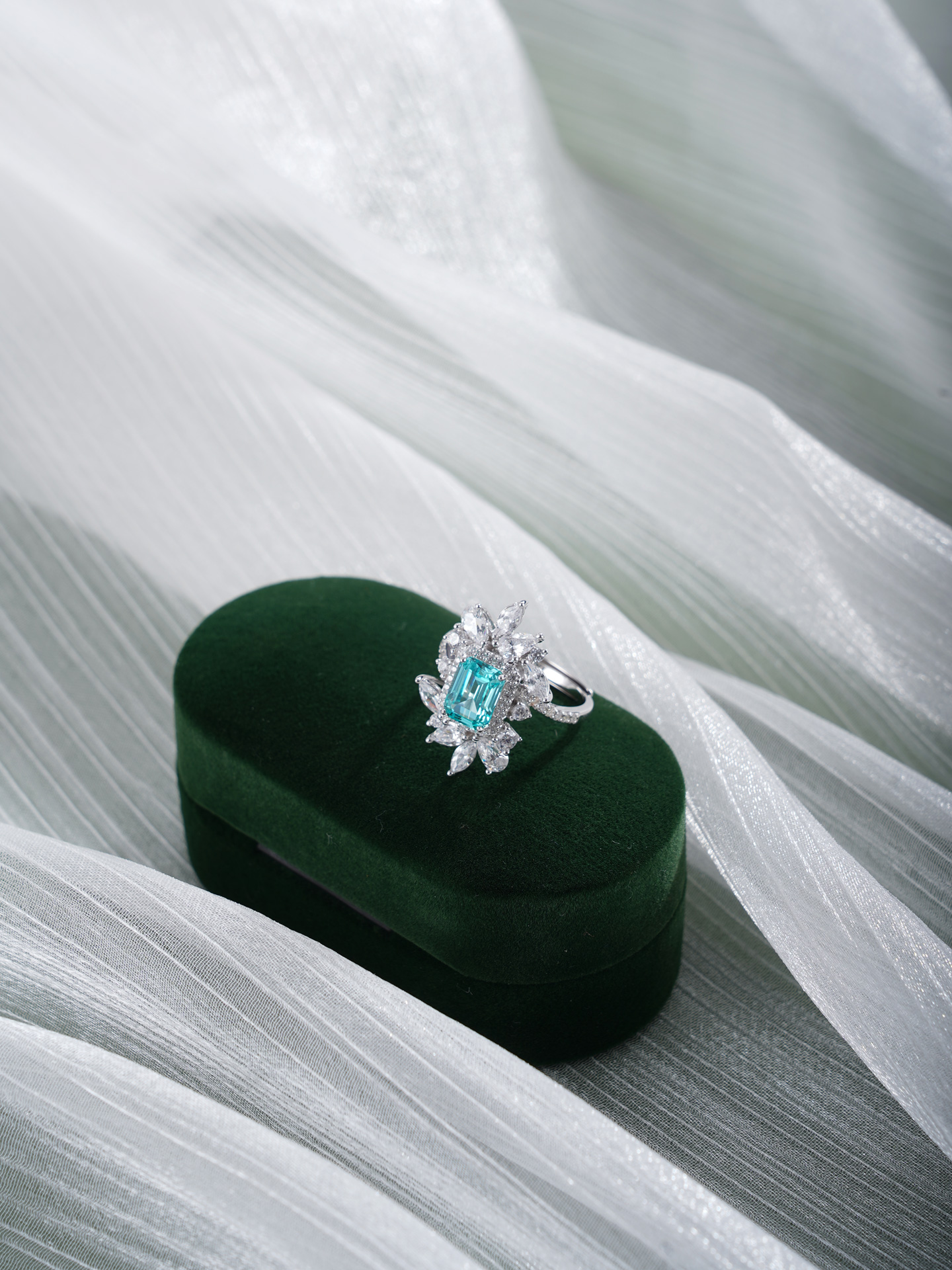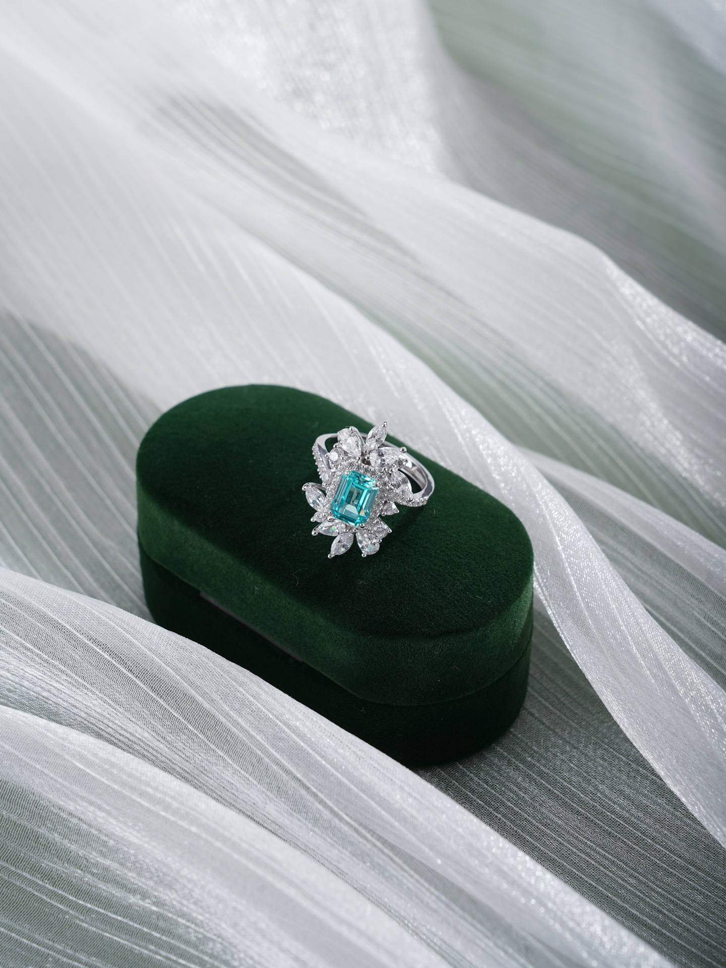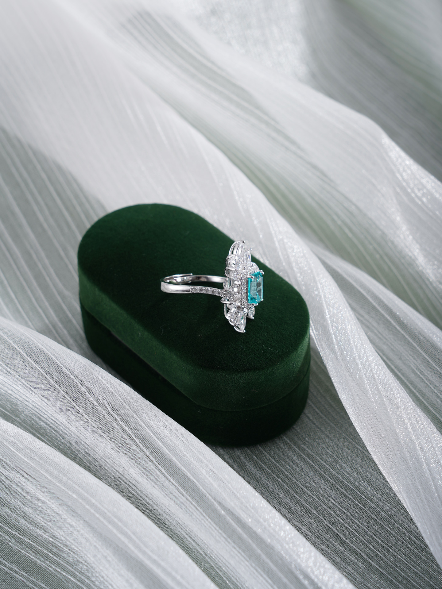 【寓意】:采用S925纯银为戒托,以锆石勾勒花瓣柔弧,碧玺镶嵌,如晴空下涟漪凝成的花影,象征芳华永驻,岁岁清欢。