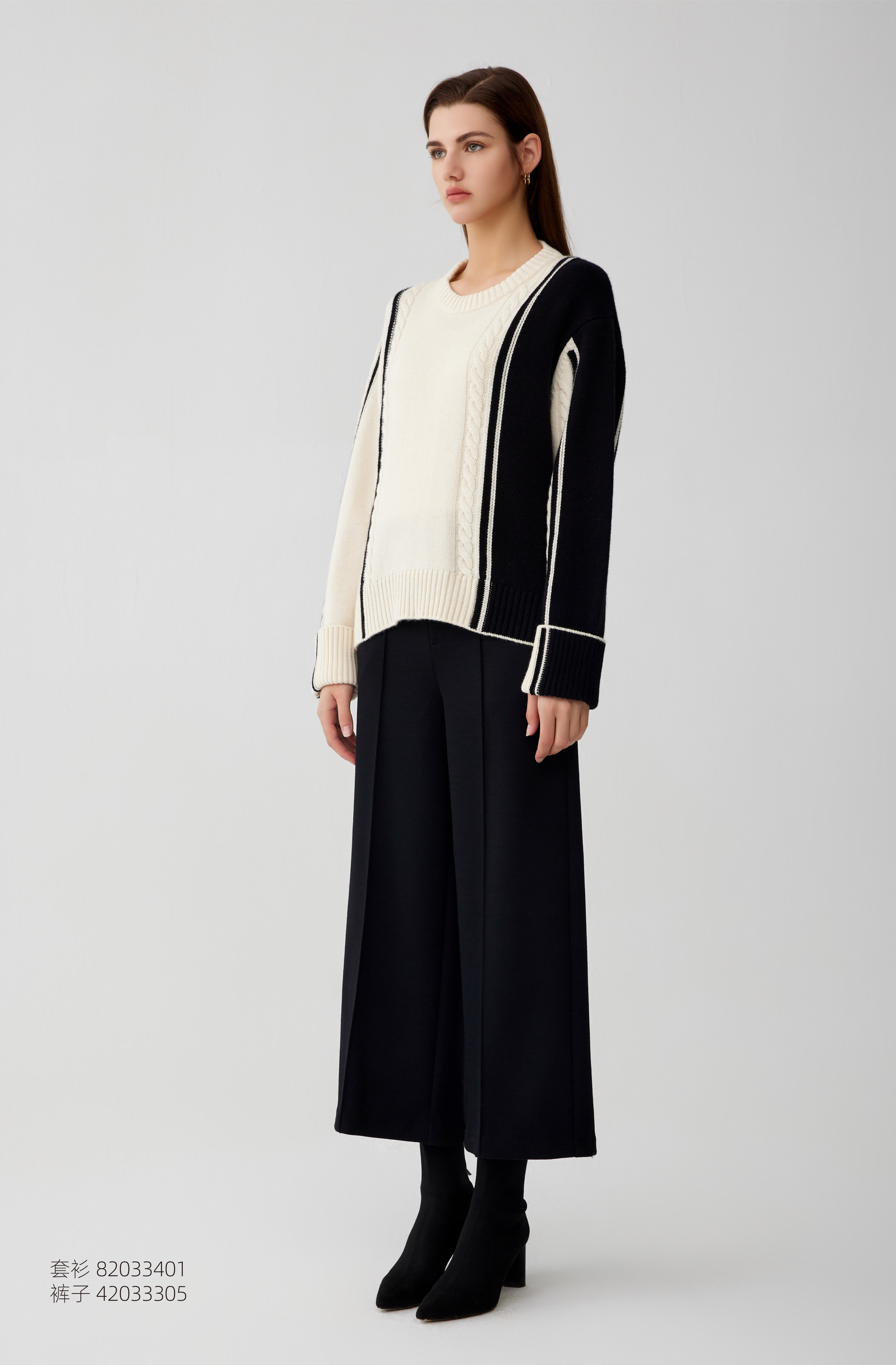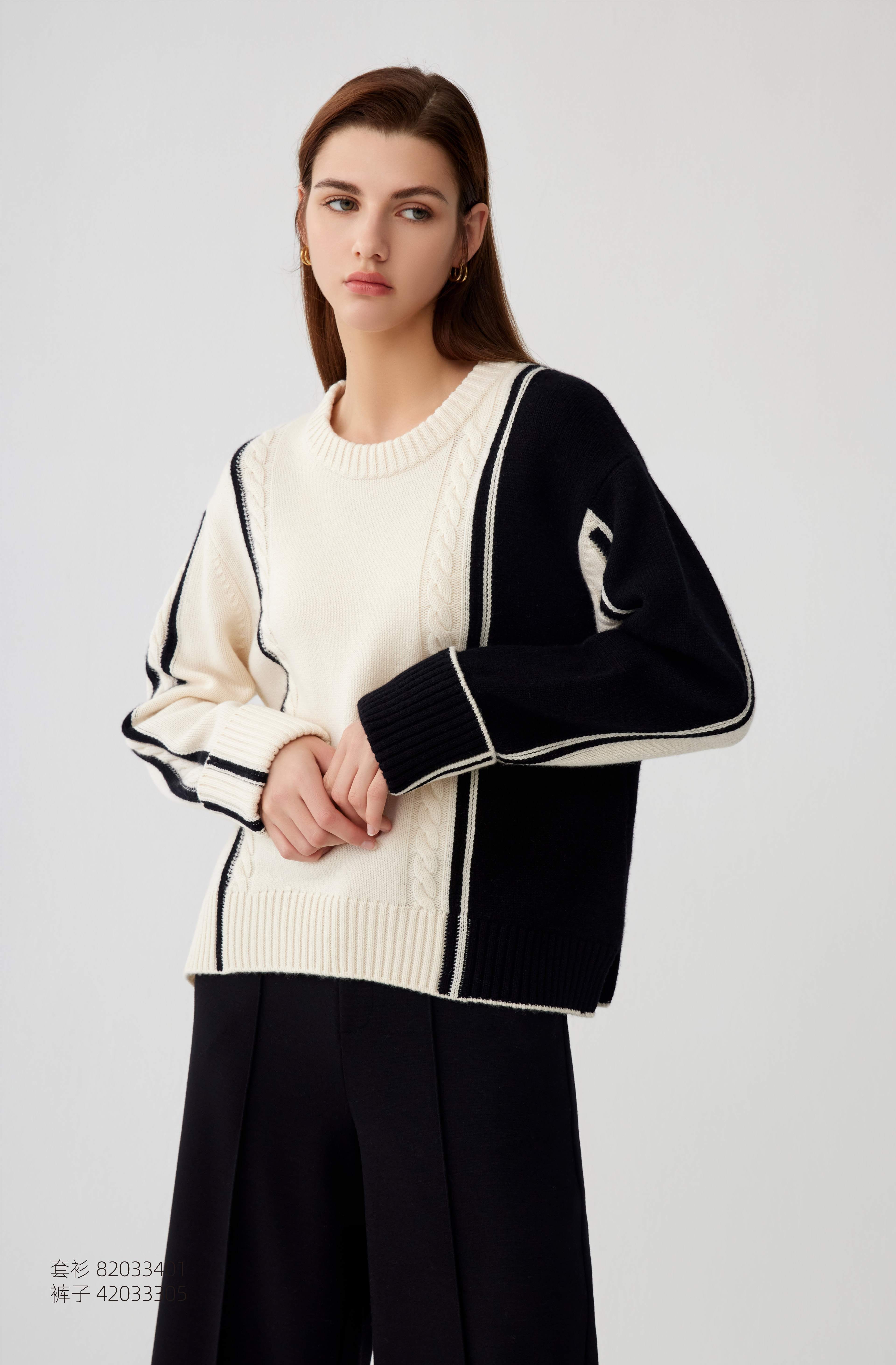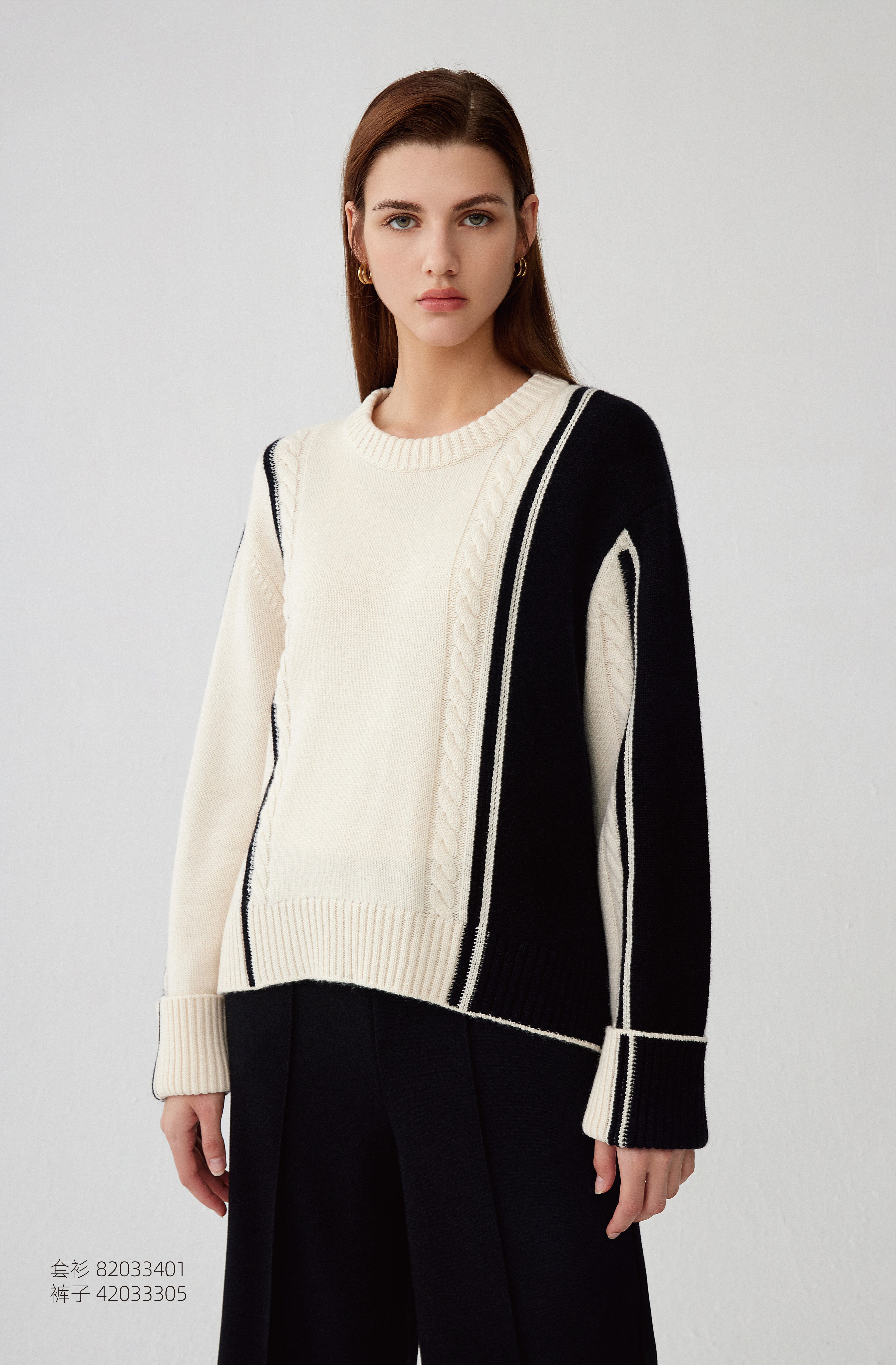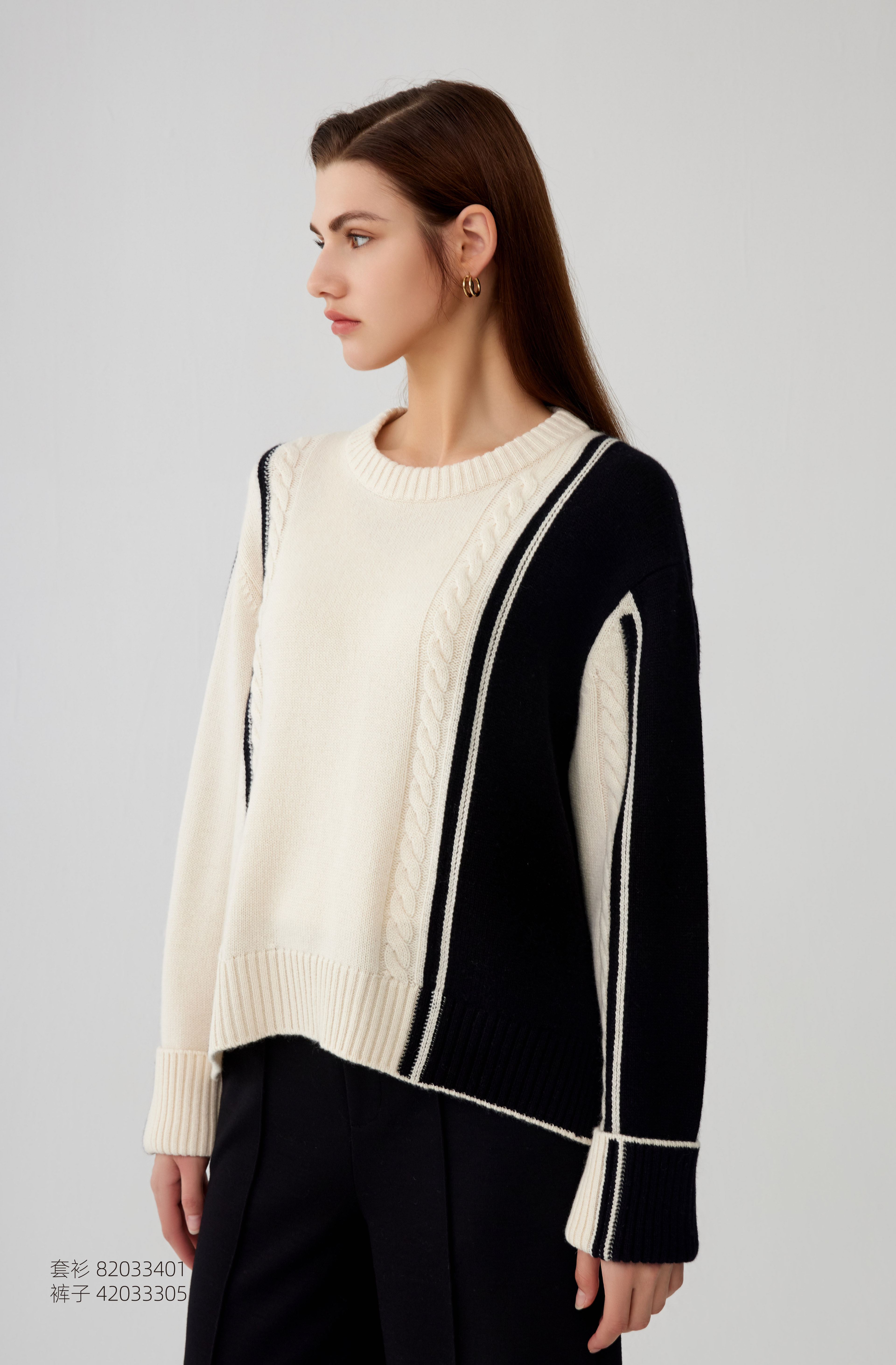 【黑白撞色绞花毛衣】羊绒世家秋冬新品女士100%山羊绒圆领内搭保暖针织毛衣