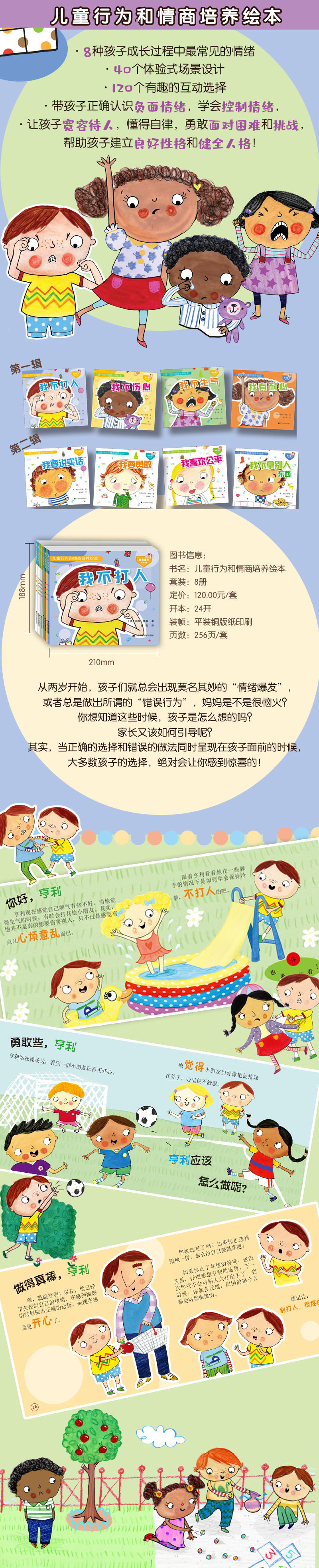 这套书一共有4本,适合家长和孩子一起阅读,也适合用作幼儿园早期基础教育书籍。四本书的四个主题涉及了儿童行为引导和情商培养的四个方面。每一本书里都会围绕主题举出很多孩子们生活中会真实遇到的问题场景,然后针对这个问题给孩子三个选择,让孩子做互动式的选择,其中有一个是正确的选择,其他两个,则是每个孩子都很容易做出的错误行为。作者通过这种引导,鼓励孩子做出正确的选择,并且告诉孩子为什么这种选择是对的。作者采用了最贴近孩子的插画手法,把孩子带入场景之中。互动式的阅读体验将在不知不觉中把正确的行为和好的情商教育种入孩子的心中。