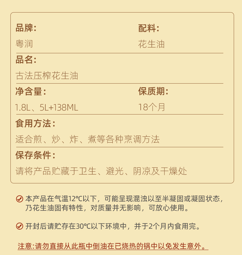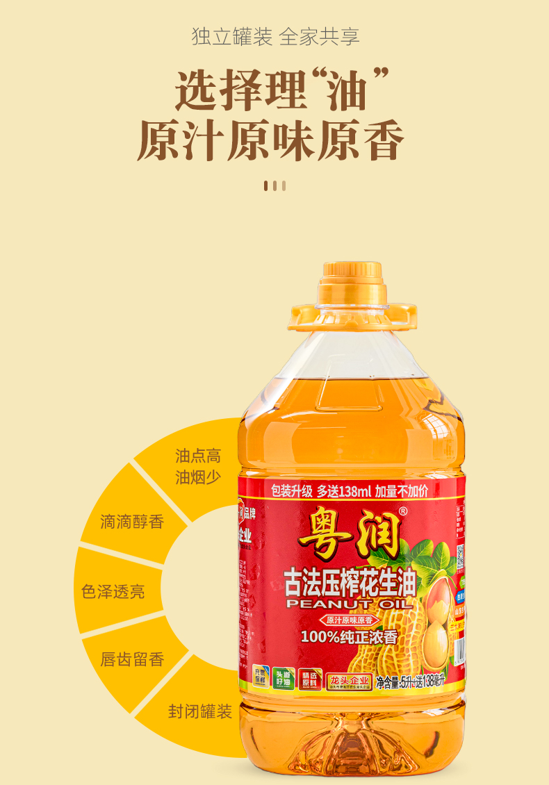 广东粤润古法压榨花生油(5L+138ml/桶)生产日期: 10月