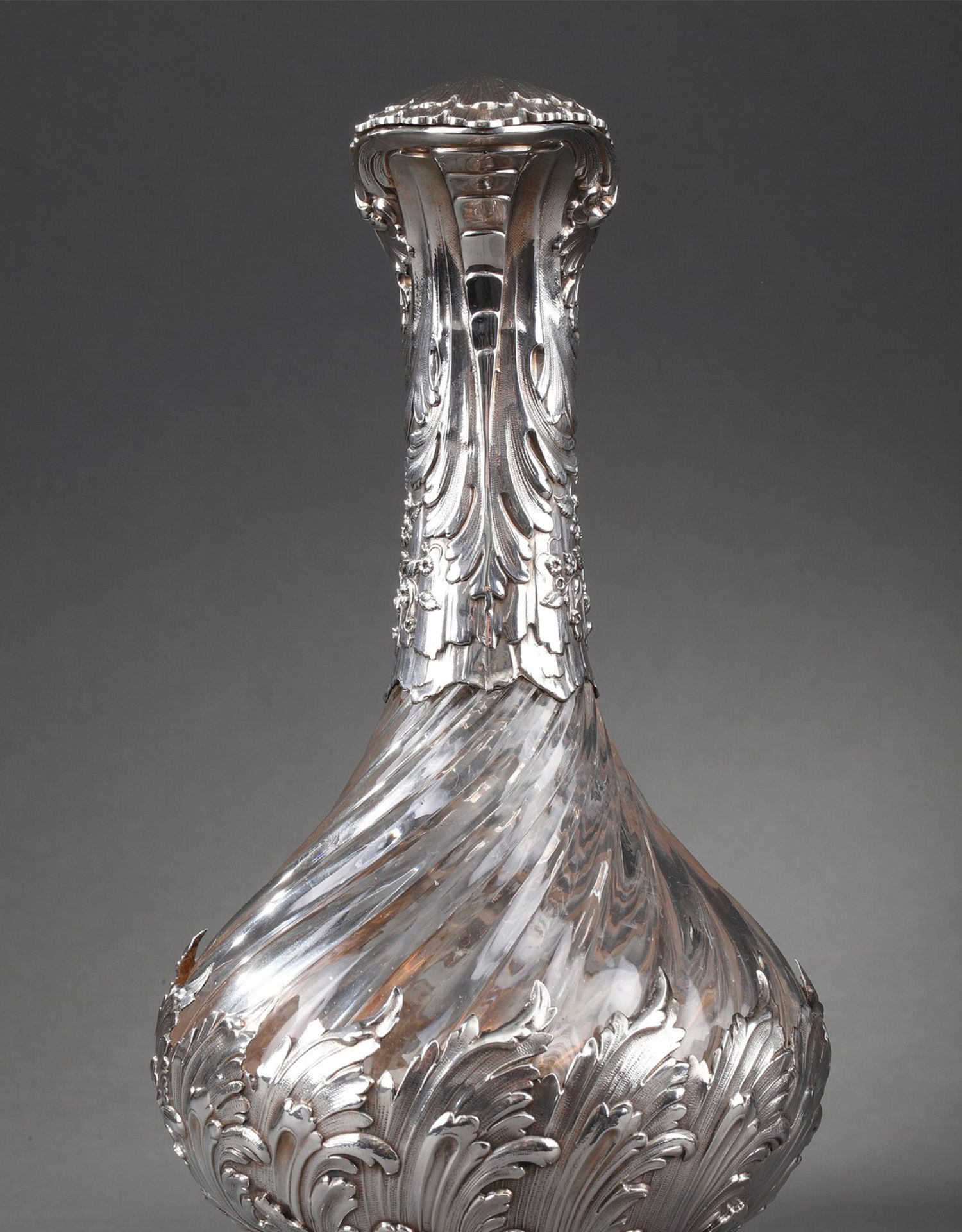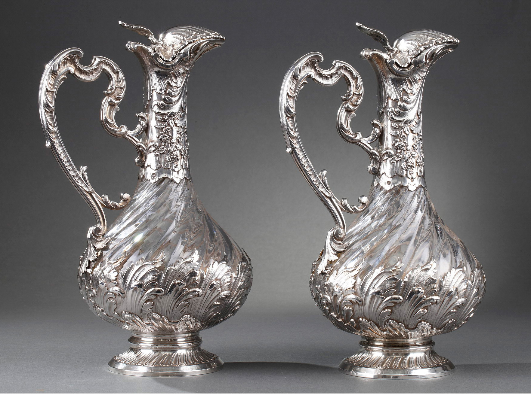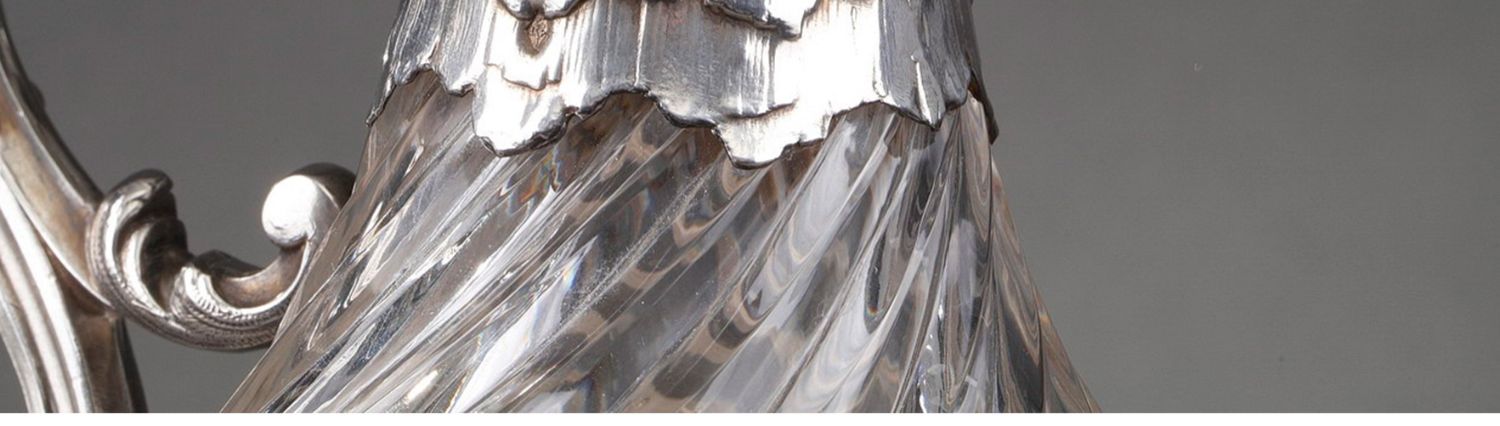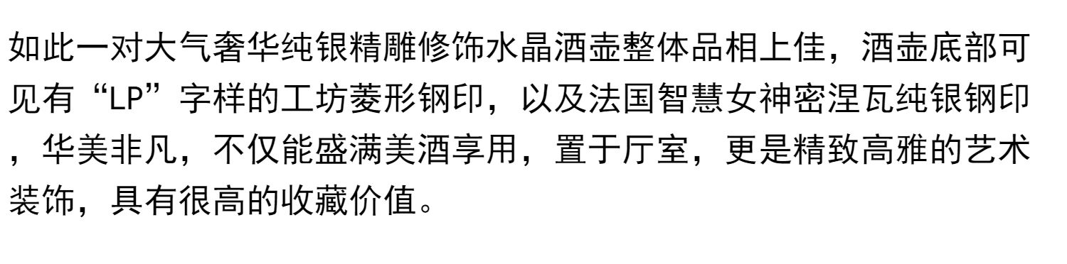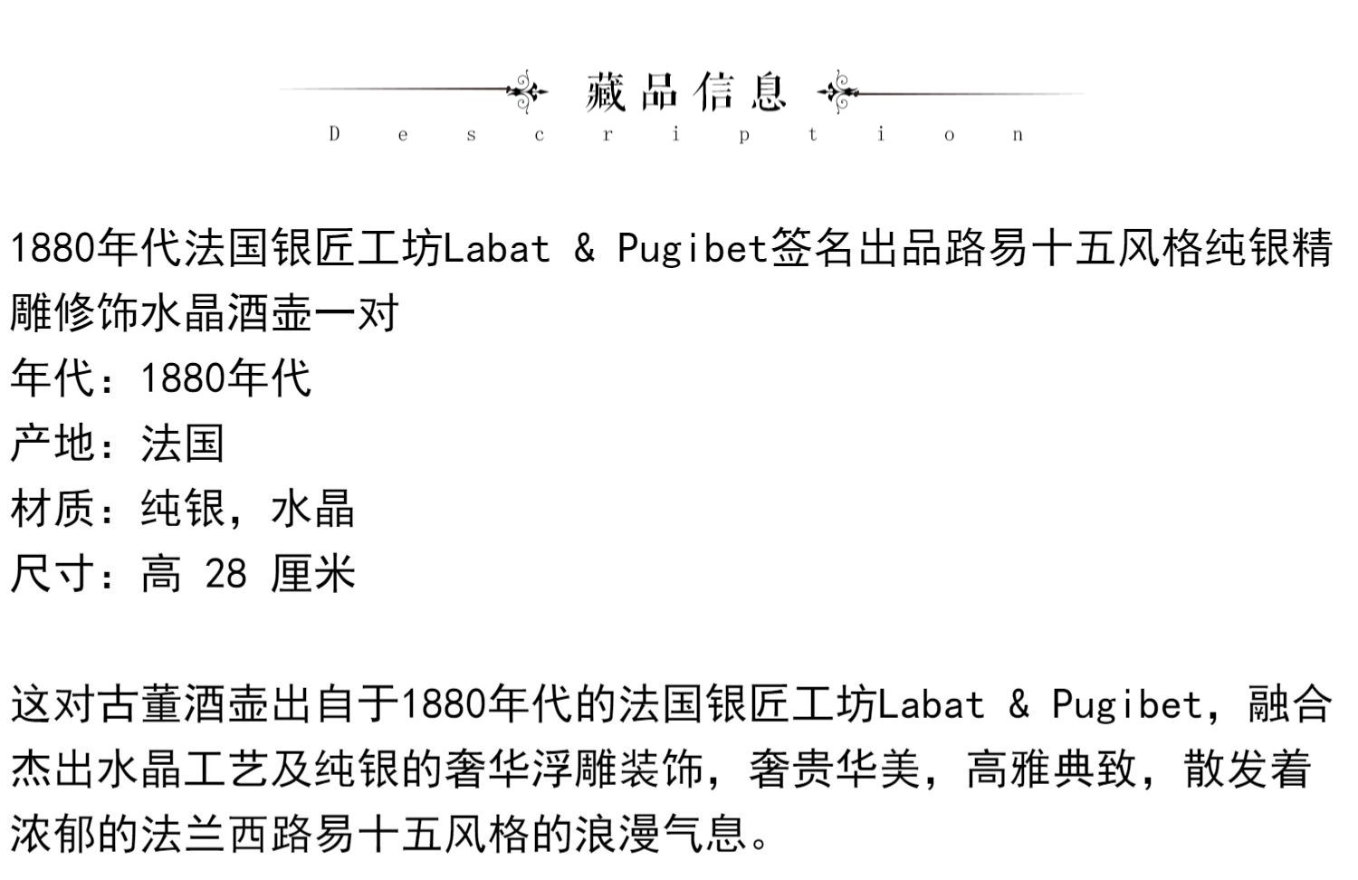 独角鹿西洋古董法国银匠工坊签名路易十五风纯银精雕水晶酒壶一对