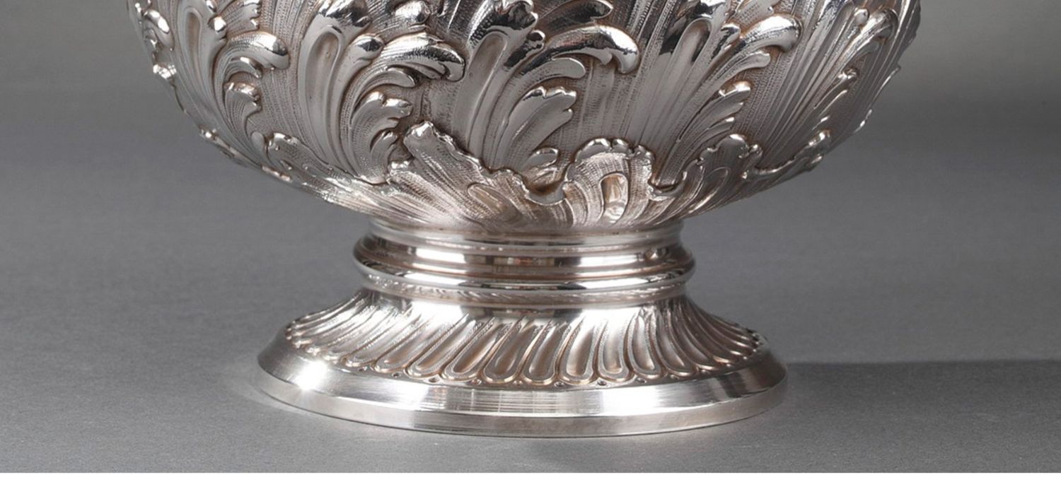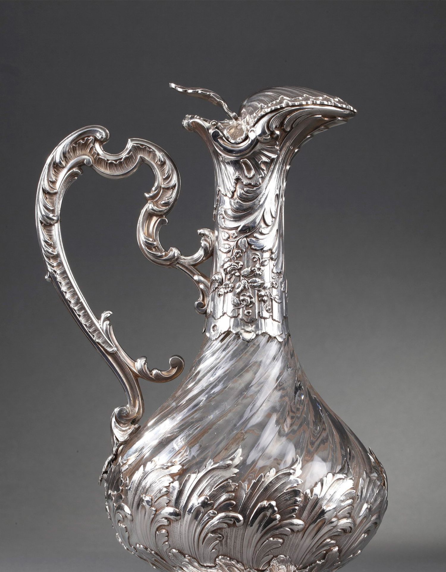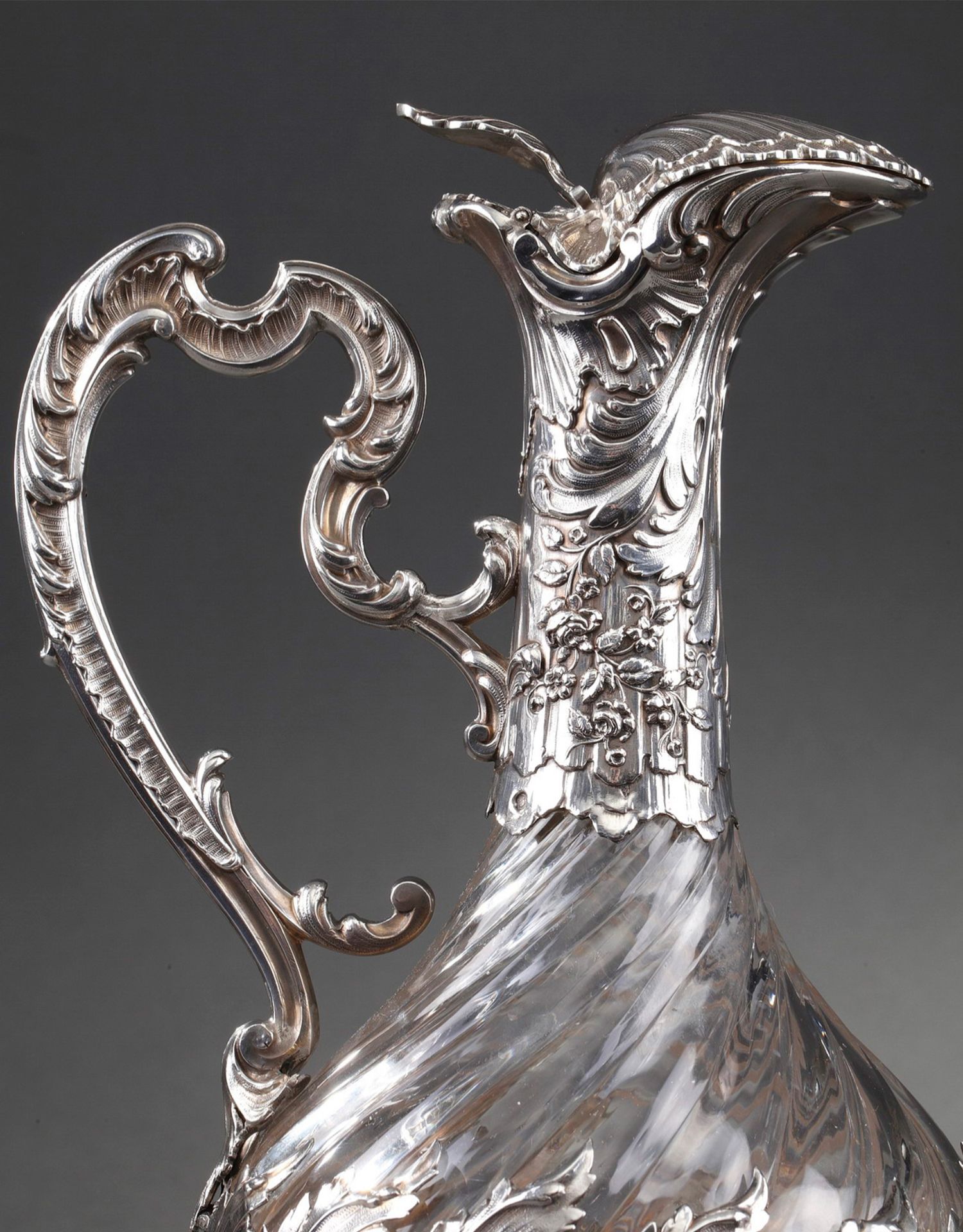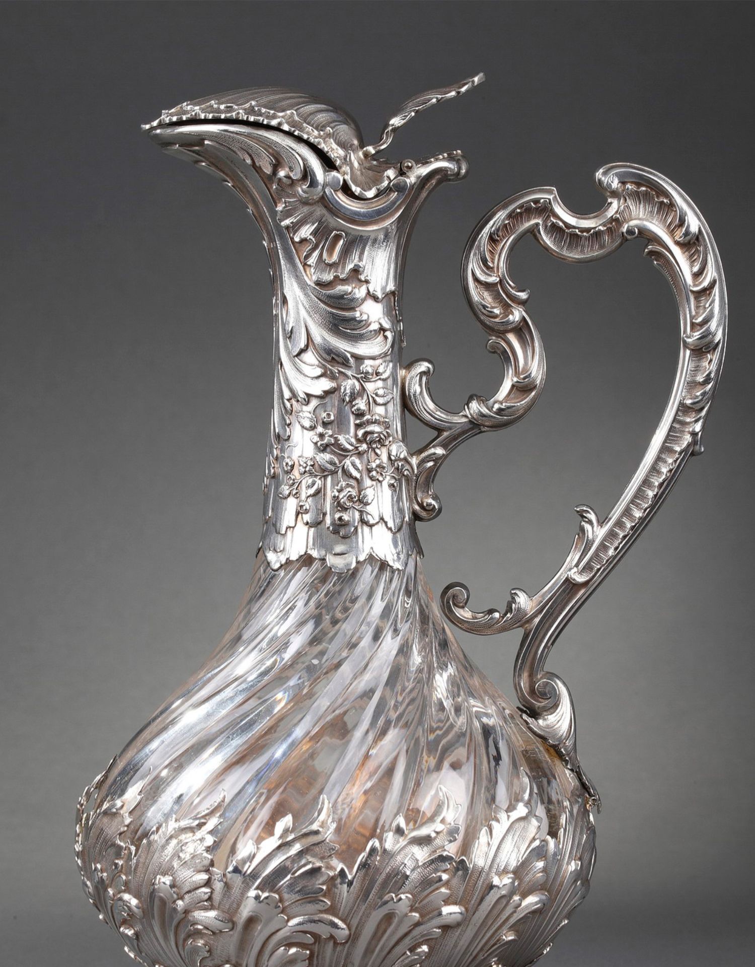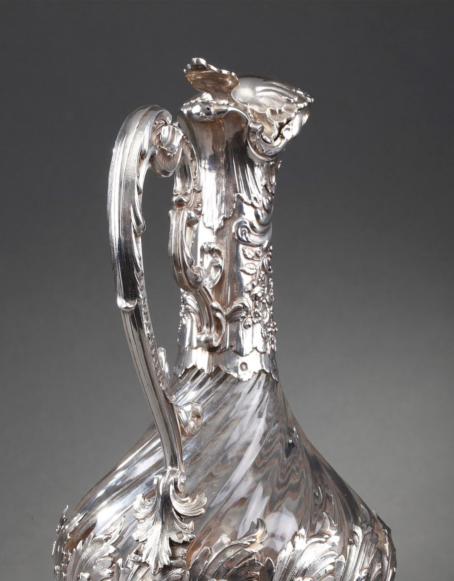 独角鹿西洋古董法国银匠工坊签名路易十五风纯银精雕水晶酒壶一对