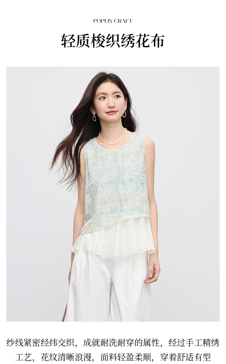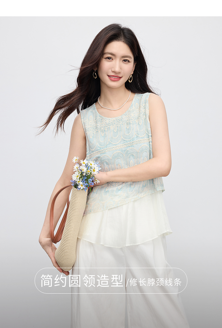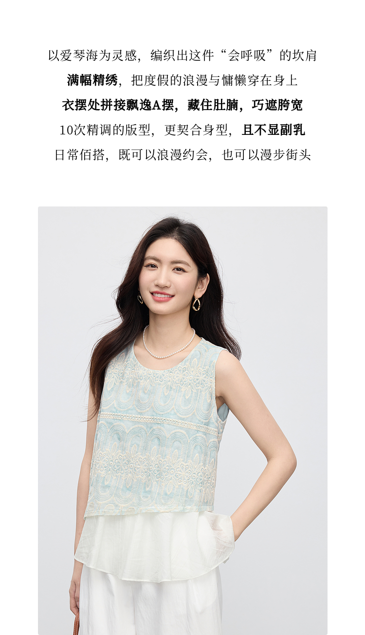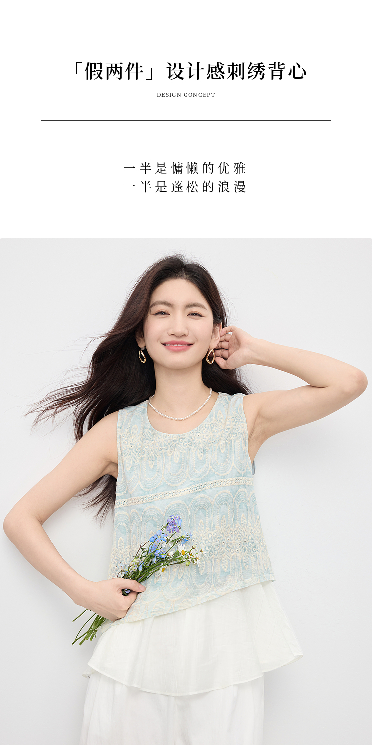 【07/23新品】熙世界设计感假两件无袖背心女夏季法式度假刺绣圆领衬衫坎肩上衣