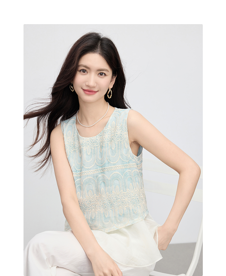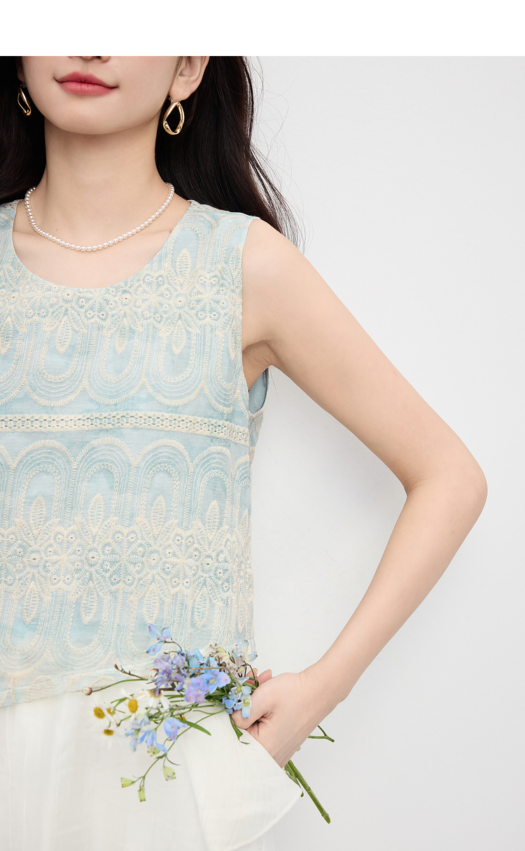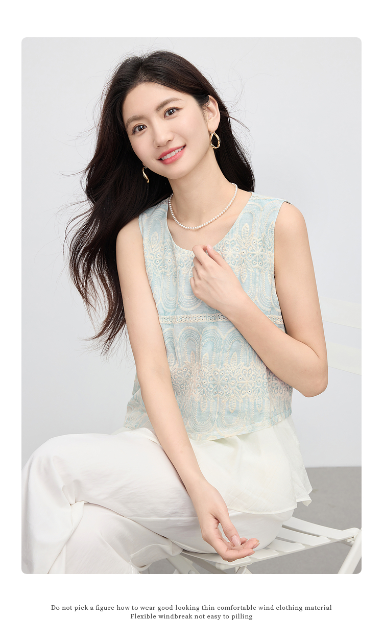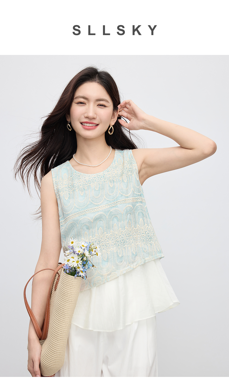 【07/23新品】熙世界设计感假两件无袖背心女夏季法式度假刺绣圆领衬衫坎肩上衣