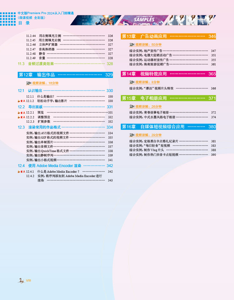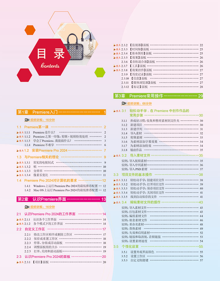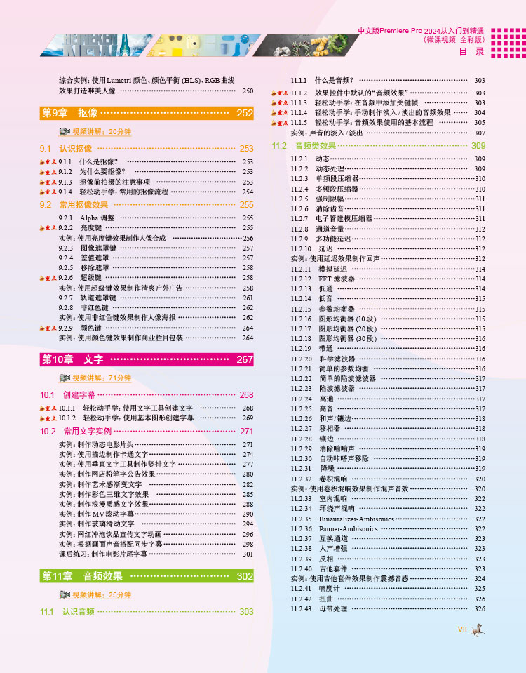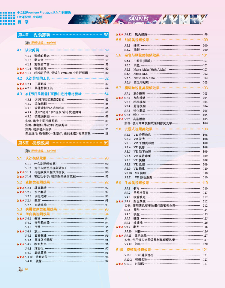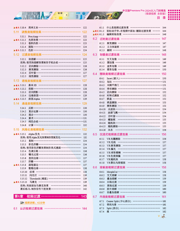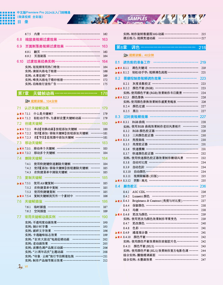 本书是一本Premiere软件基础教程,也是一本Premiere完全自学视频教程,详细介绍了Premiere Pro2024的使用方法和应用技巧。Premiere Pro2024作为一款优秀的非线性编辑软件,广泛应用于影视剪辑、广告制作和电视节目制作等领域。 本书内容详细,实例丰富,图文并茂,文字叙述通俗易懂。具体内容包括:Premiere入门、认识Premiere界面、Premiere常用操作、视频剪辑、视频效果、视频过渡、关键帧动画、调色、抠像、文字、音频效果和作品输出。学完这些内容,可以对视频编辑有一个完整的认识并能够了解Premiere在视频剪辑中的常用核心技术。为进一步提升读者的实战水平,本书最后特别提供了Premiere在广告动画、视频特效和电子相册等3个不同领域的12个大型综合案例供读者学习和操练。 本书的各类学习资源有: 1. 132集视频讲解+素材源文件+PPT课件+手机扫码看视频+在线交流。 2. 赠送《配色宝典》《构图宝典》《创意宝典》等设计师必备知识电子书以及各类设计素材。 3. 赠送《Photoshop基础视频》《After Effects基础视频》《3ds Max基础视频》。 本书适合Premiere零基础读者学习,也适合作为大中专院校和培训机构相关专业教材,有意从事各类型视频设计及任何对视频设计感兴趣的读者均可选择本书学习。本书以Premiere Pro 2024版本为基础讲解,使用Premiere Pro2020、Premiere Pro CC、Premiere Pro CS6等版本的读者也可参考本书学习。