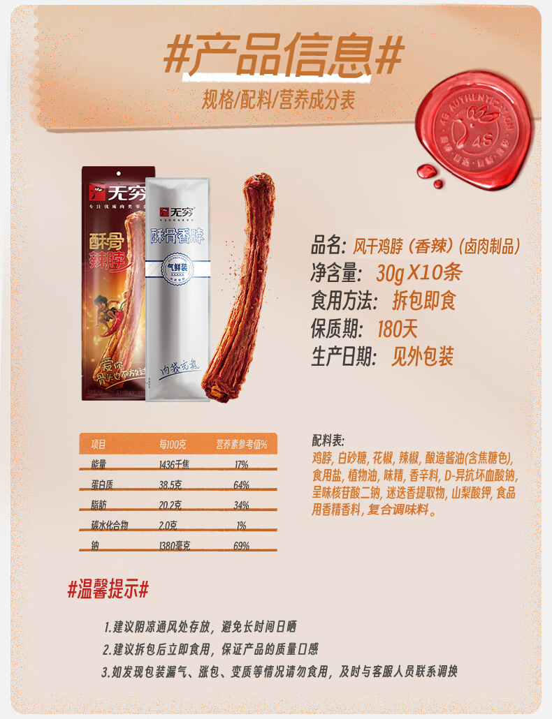 无穷-30g酥骨香脖/风干鸡脖(香辣)-开袋即食肉类零食30gx10袋