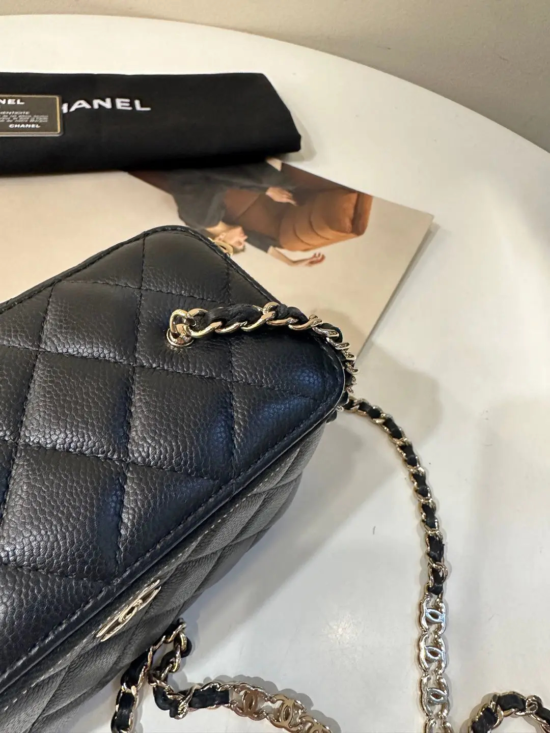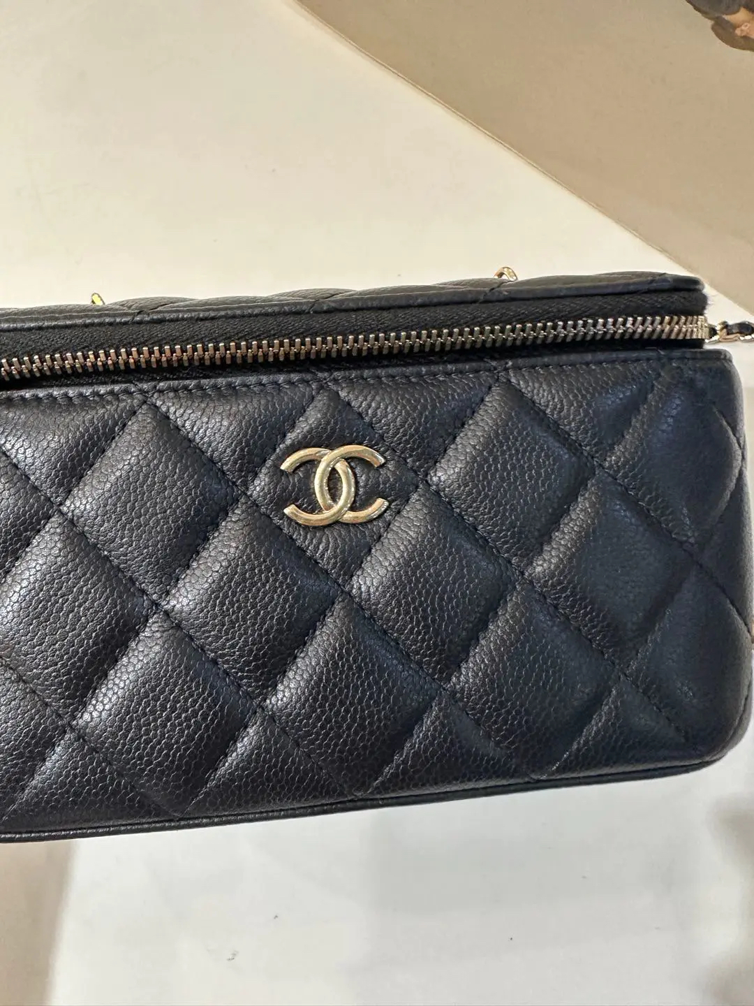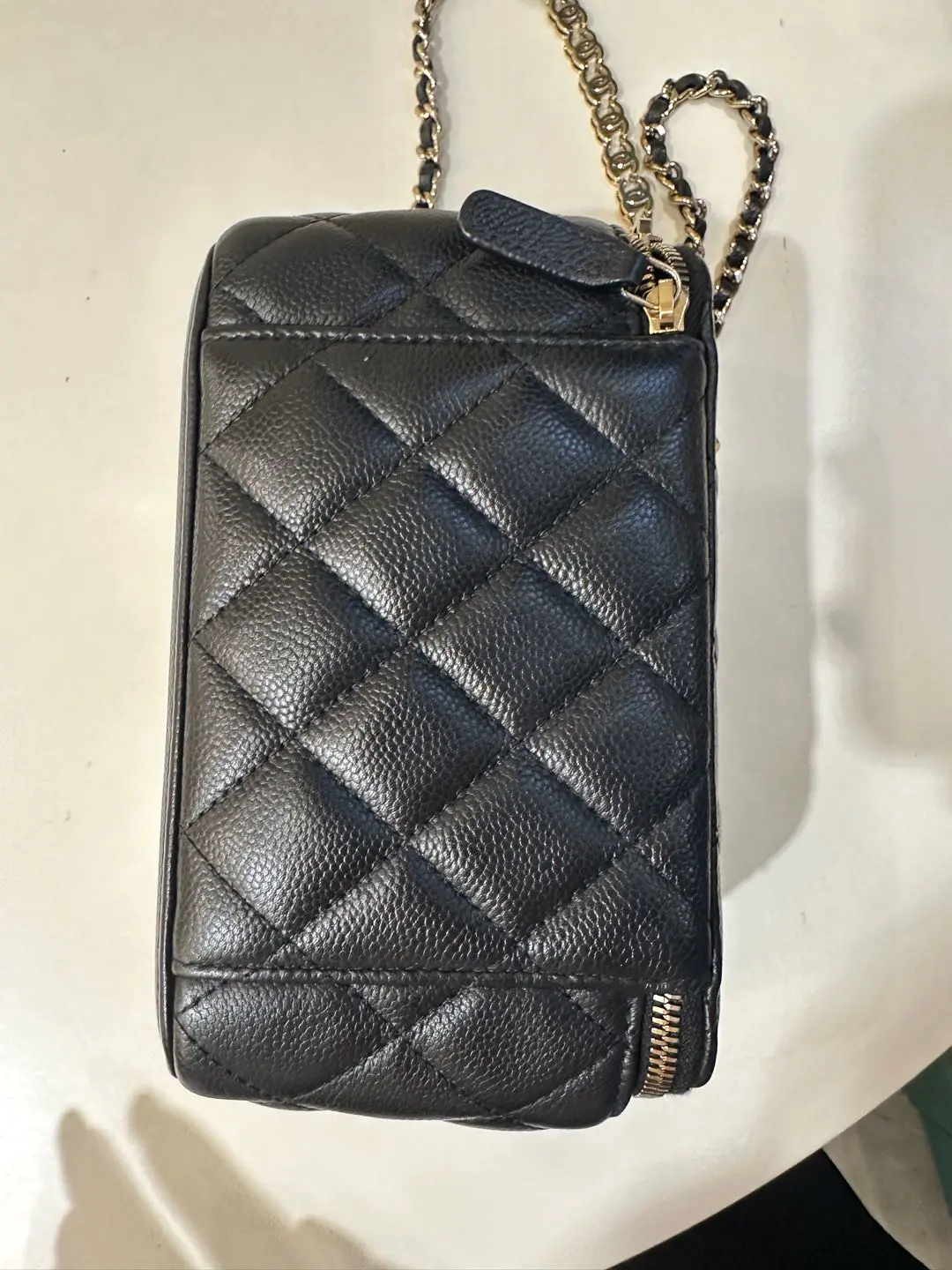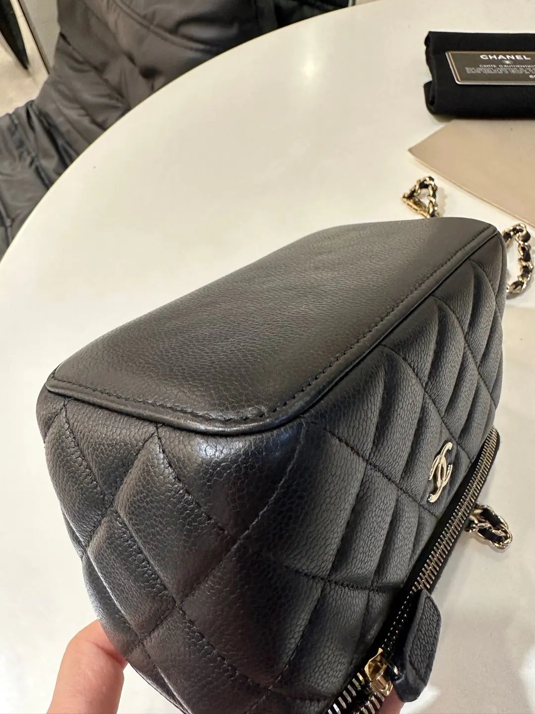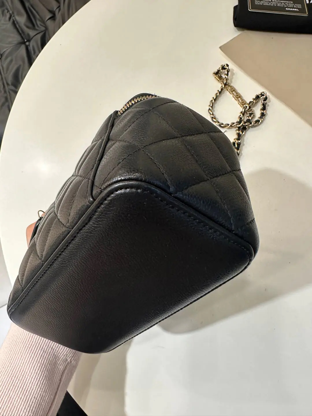 【商品详情】正品二手 Chanel 22p 黑金 荔枝纹牛皮 长盒子 化妆包🤩95新 16*10 镭射31开 配件:卡 防尘袋。内里正常使用感。怎么搭都不出错