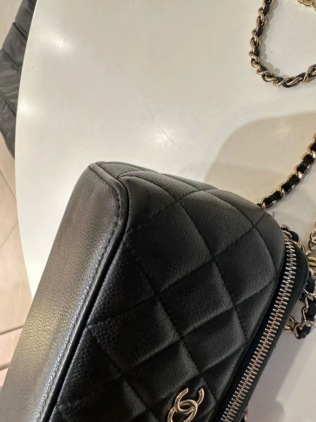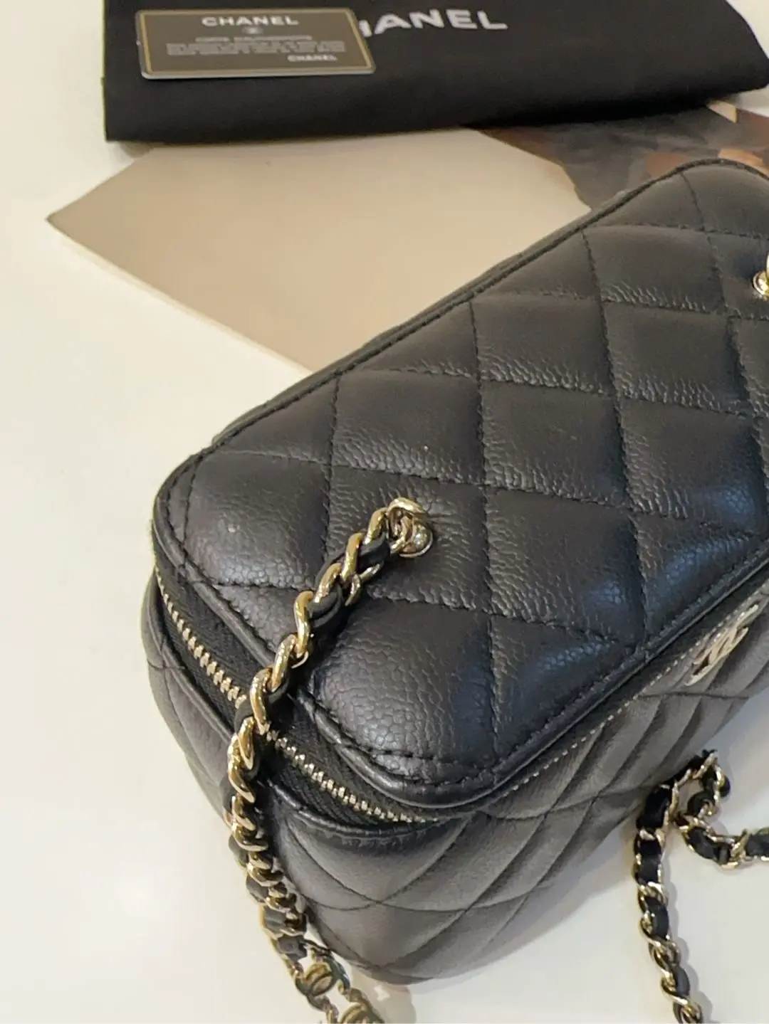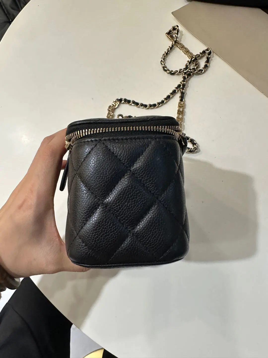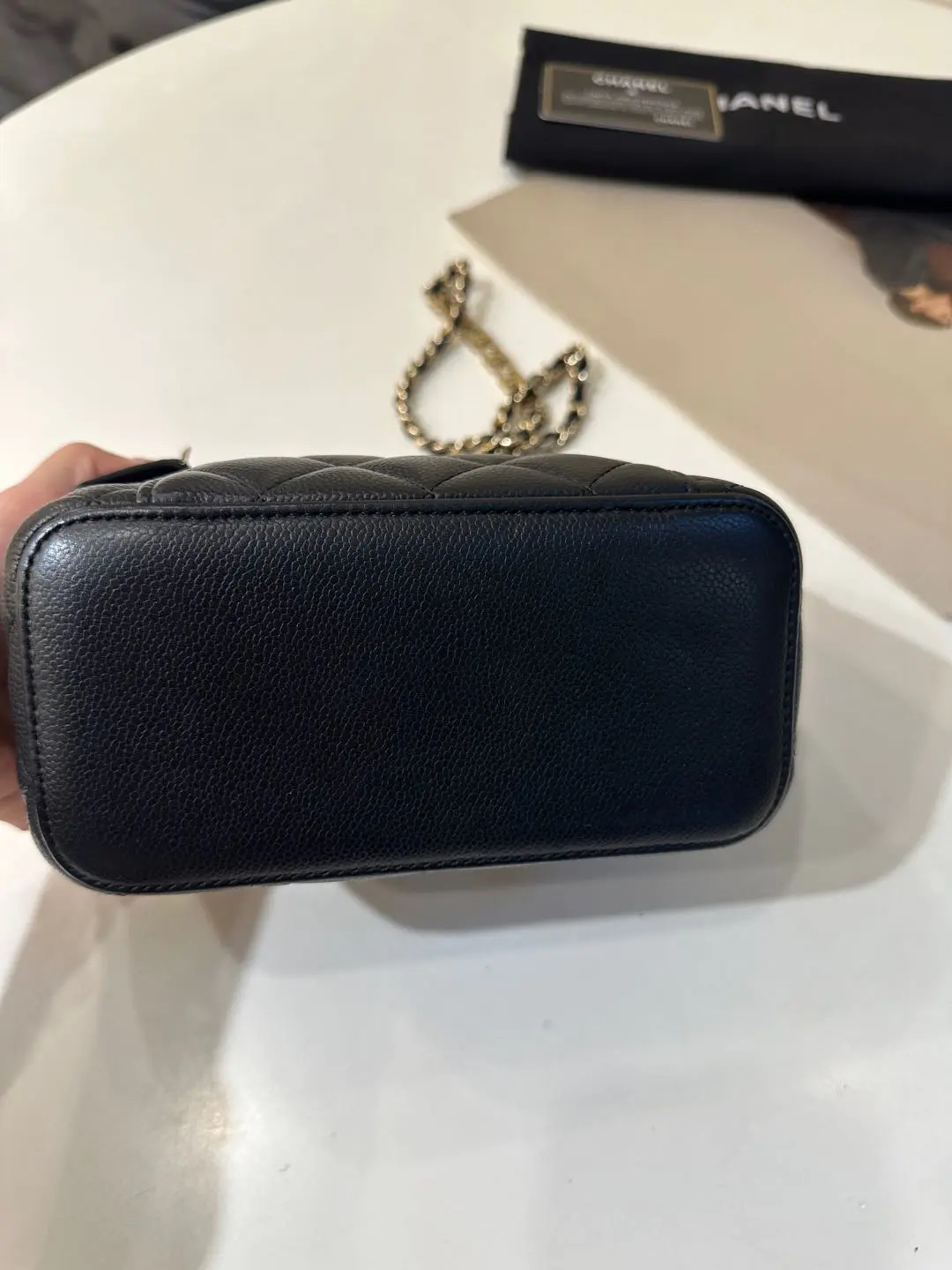 【商品详情】正品二手 Chanel 22p 黑金 荔枝纹牛皮 长盒子 化妆包🤩95新 16*10 镭射31开 配件:卡 防尘袋。内里正常使用感。怎么搭都不出错