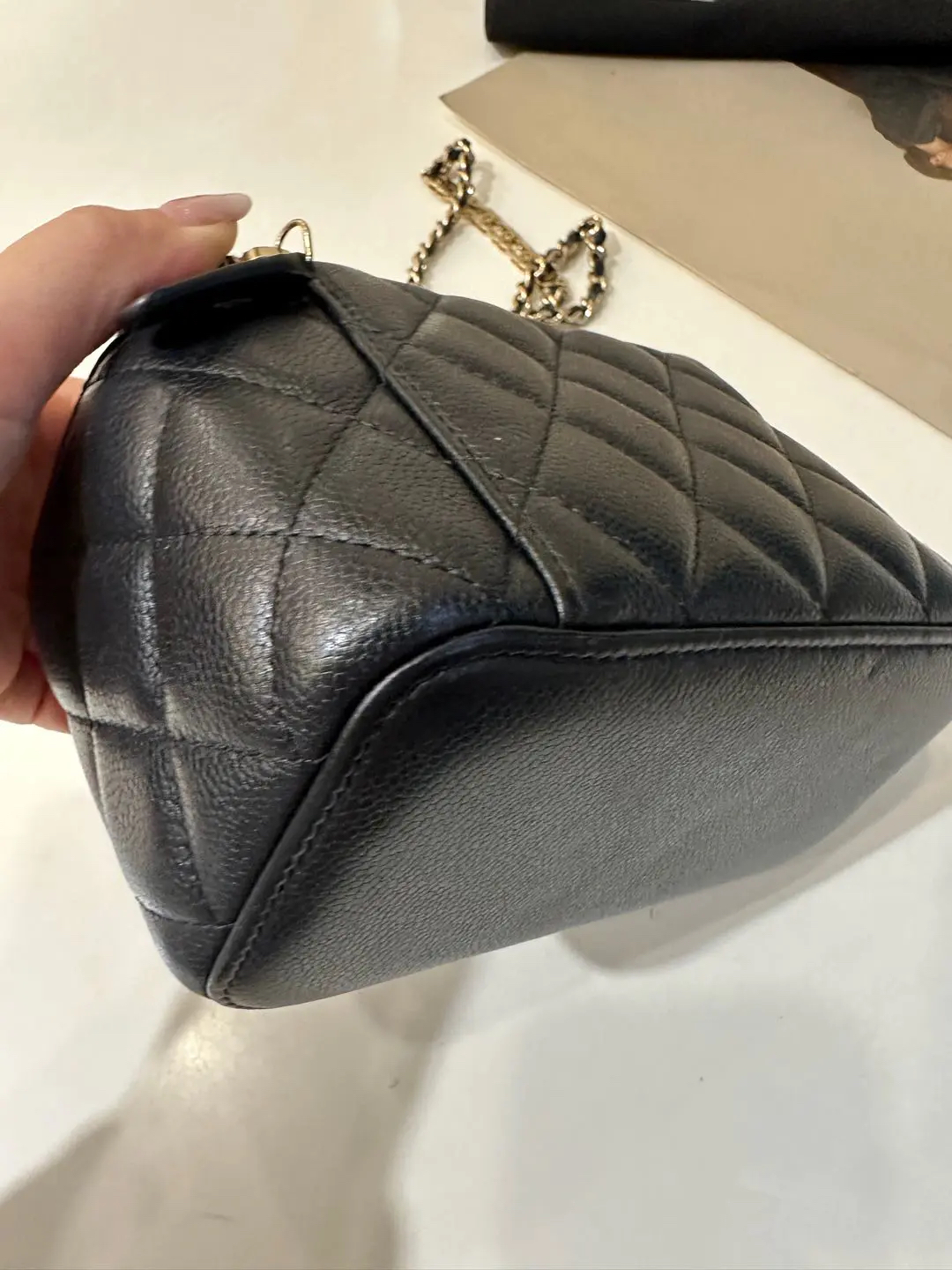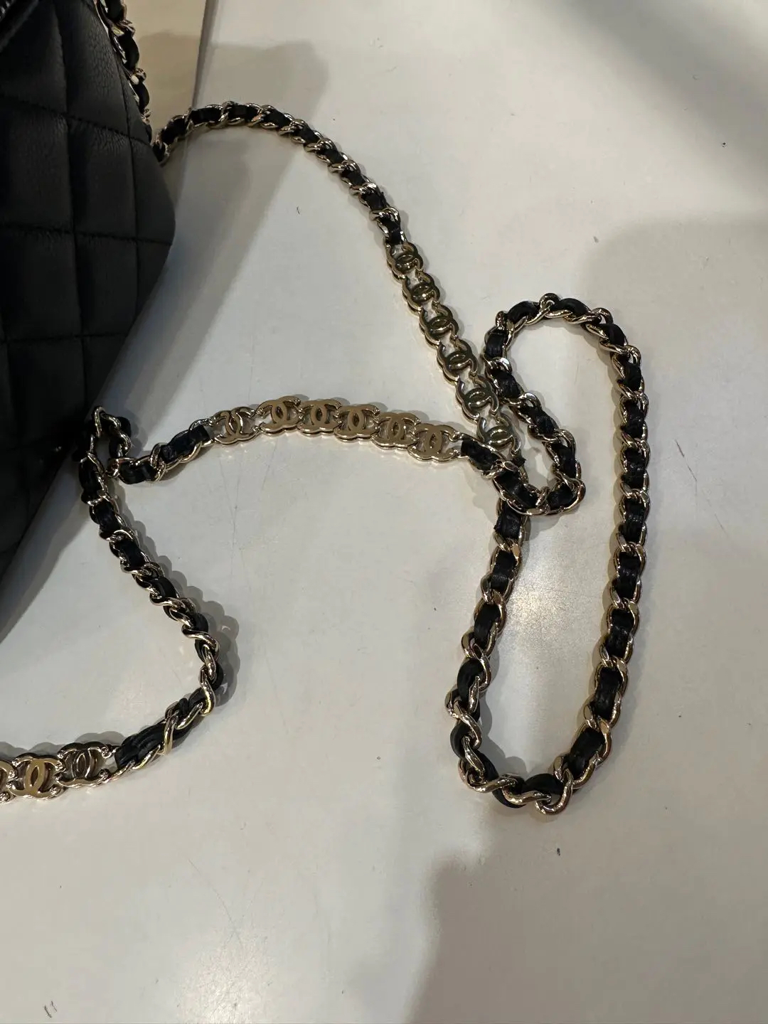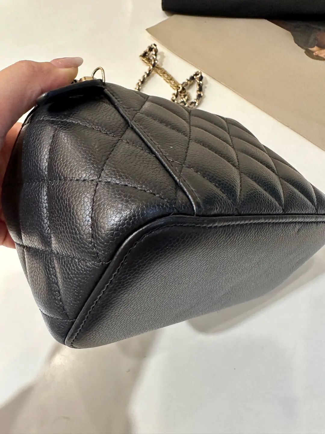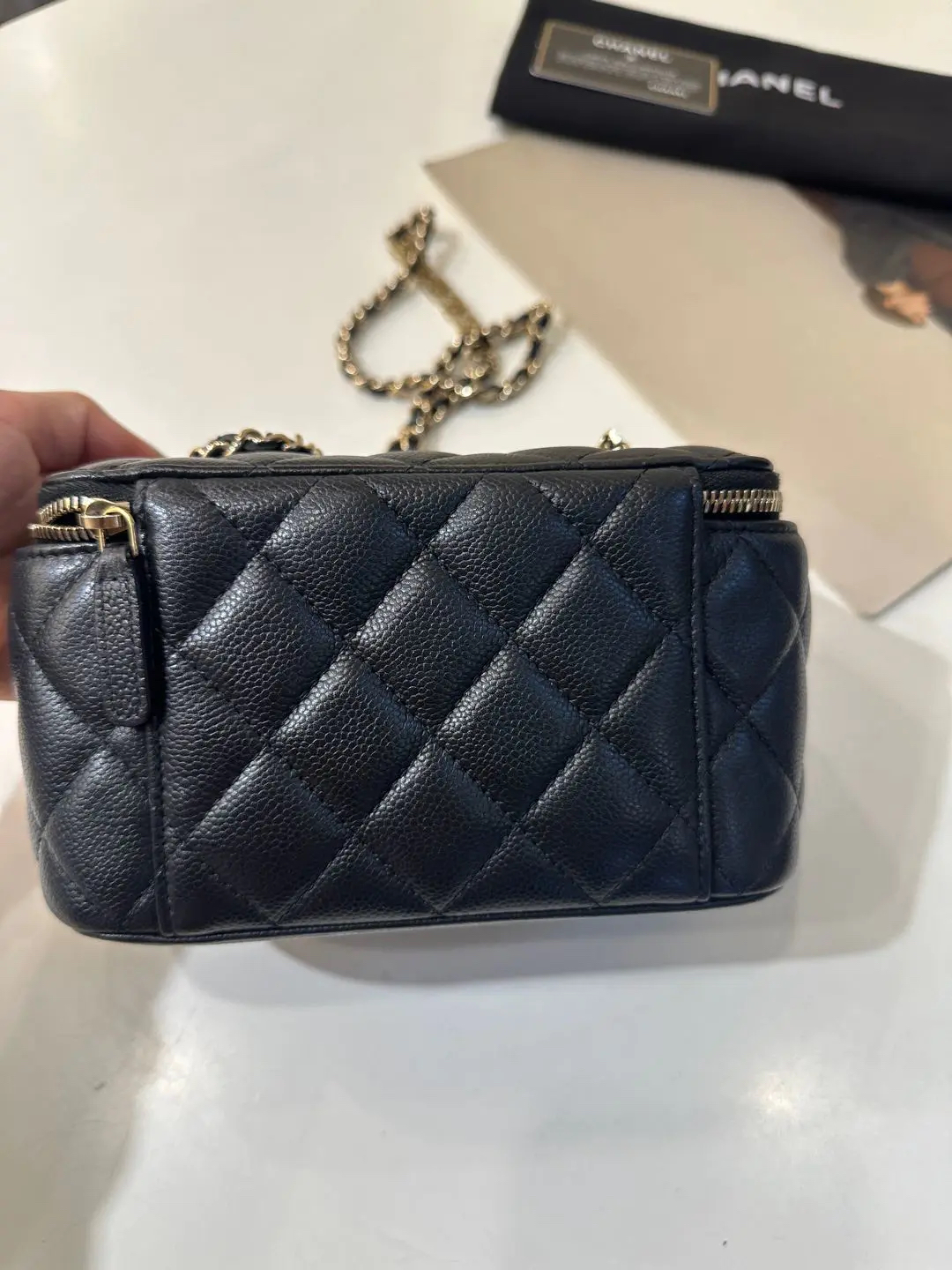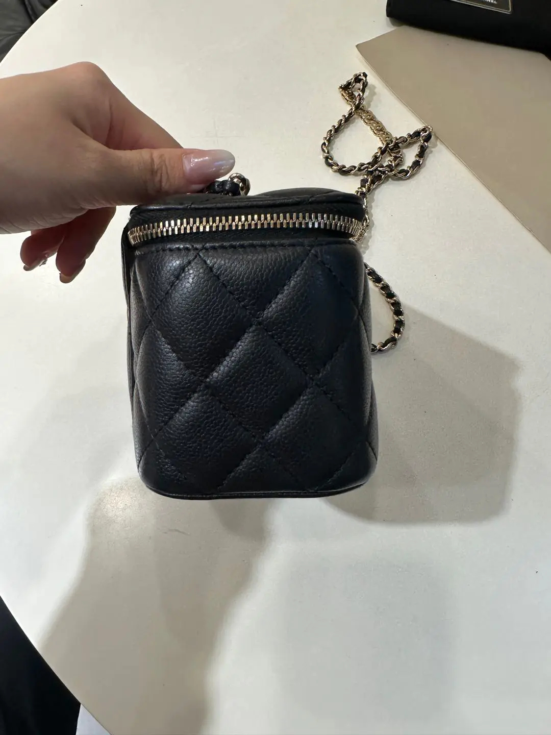 【商品详情】正品二手 Chanel 22p 黑金 荔枝纹牛皮 长盒子 化妆包🤩95新 16*10 镭射31开 配件:卡 防尘袋。内里正常使用感。怎么搭都不出错