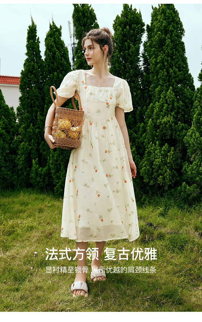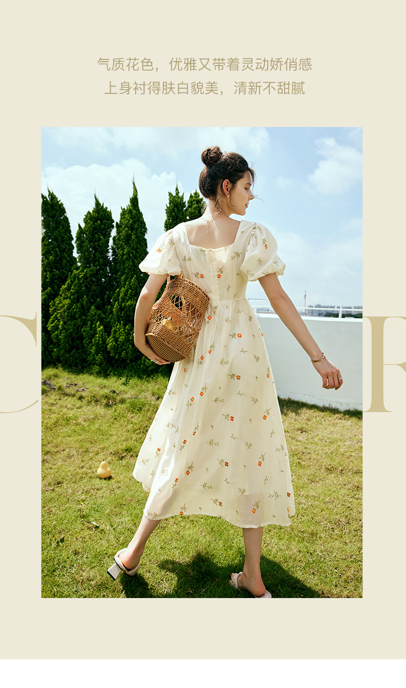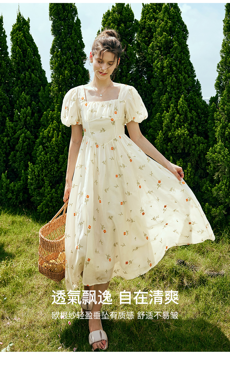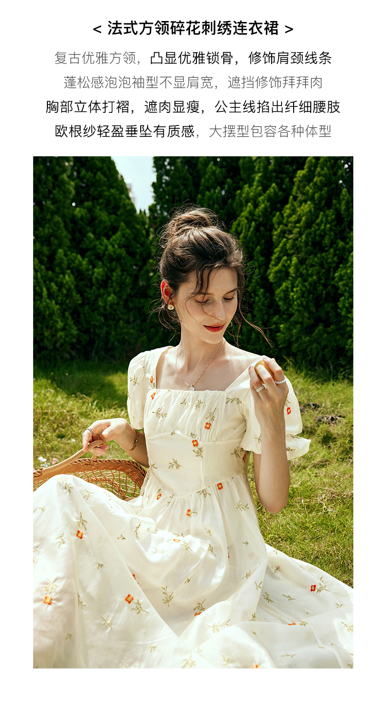 OLrain欧芮儿法式方领碎花连衣裙女夏季2023年新款收腰欧根纱裙子