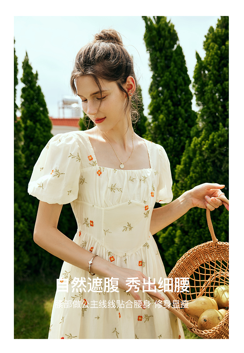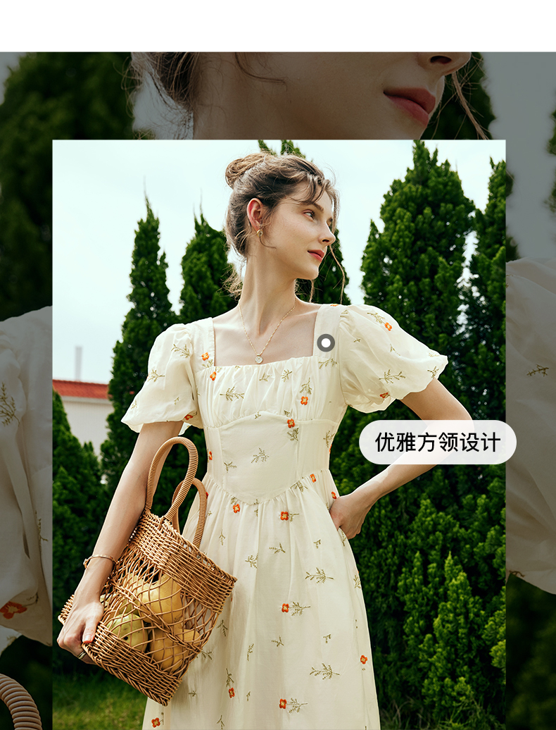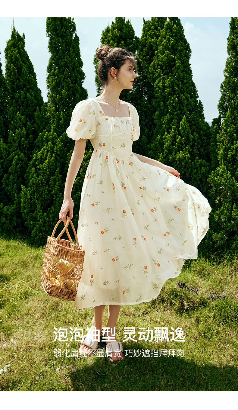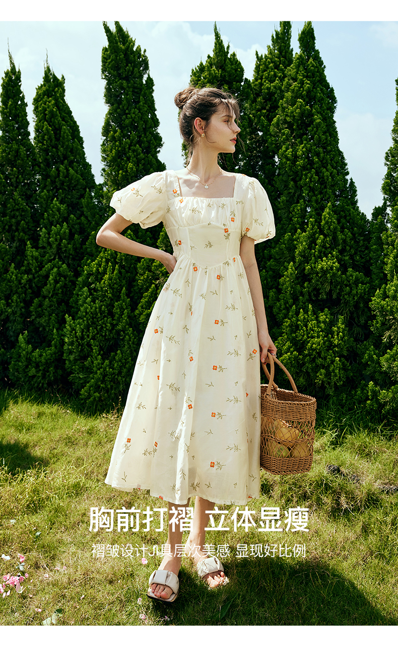 OLrain欧芮儿法式方领碎花连衣裙女夏季2023年新款收腰欧根纱裙子