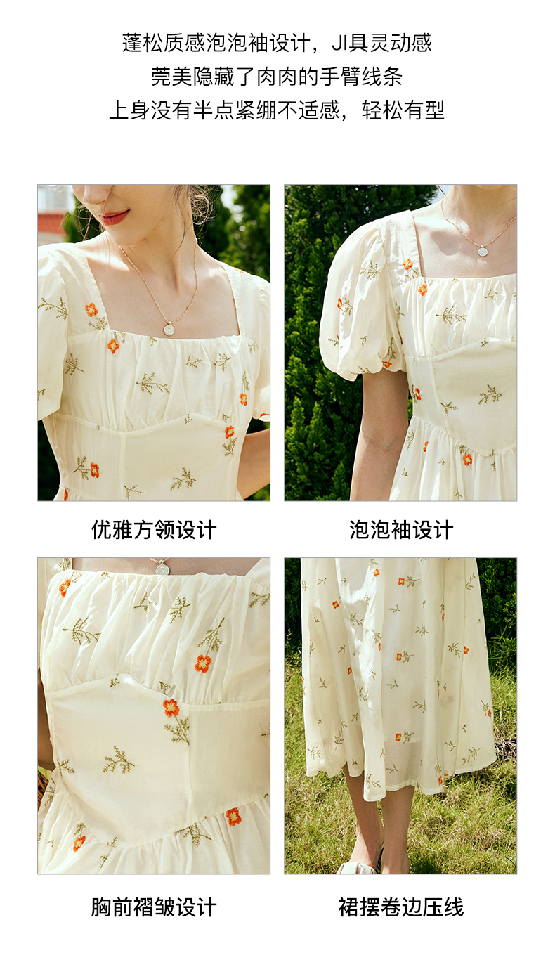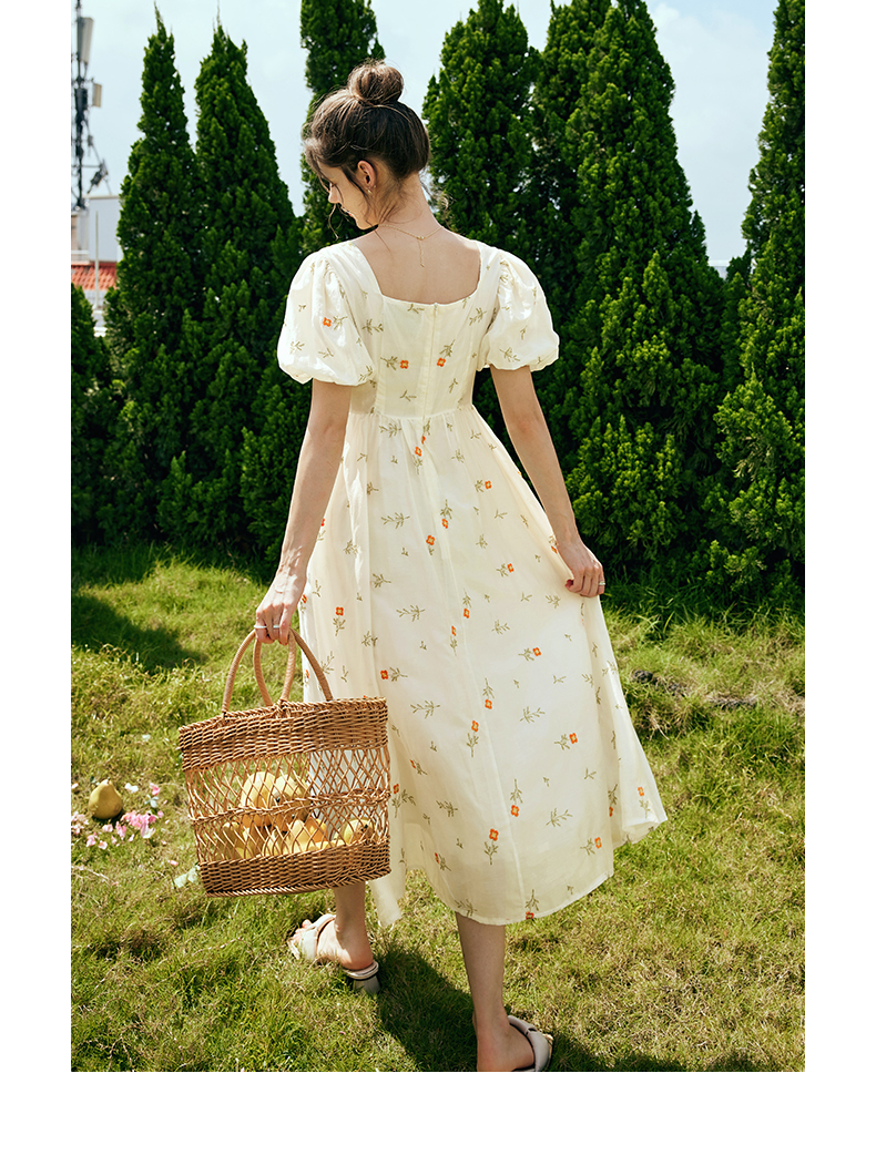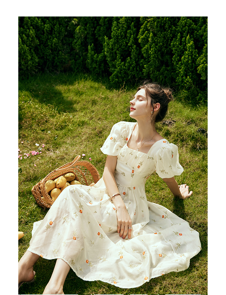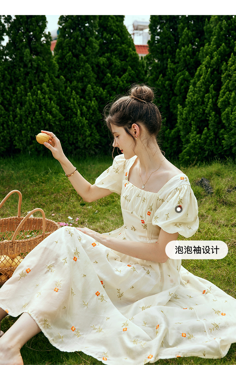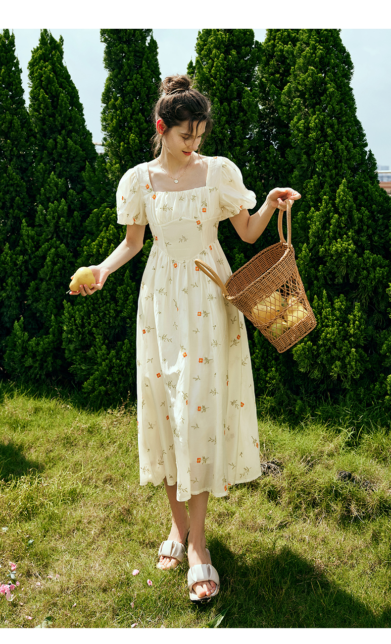 OLrain欧芮儿法式方领碎花连衣裙女夏季2023年新款收腰欧根纱裙子