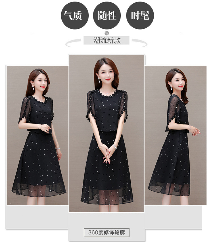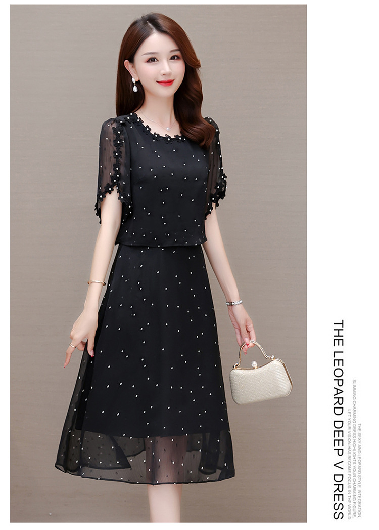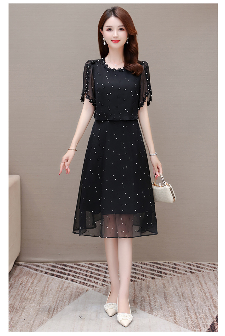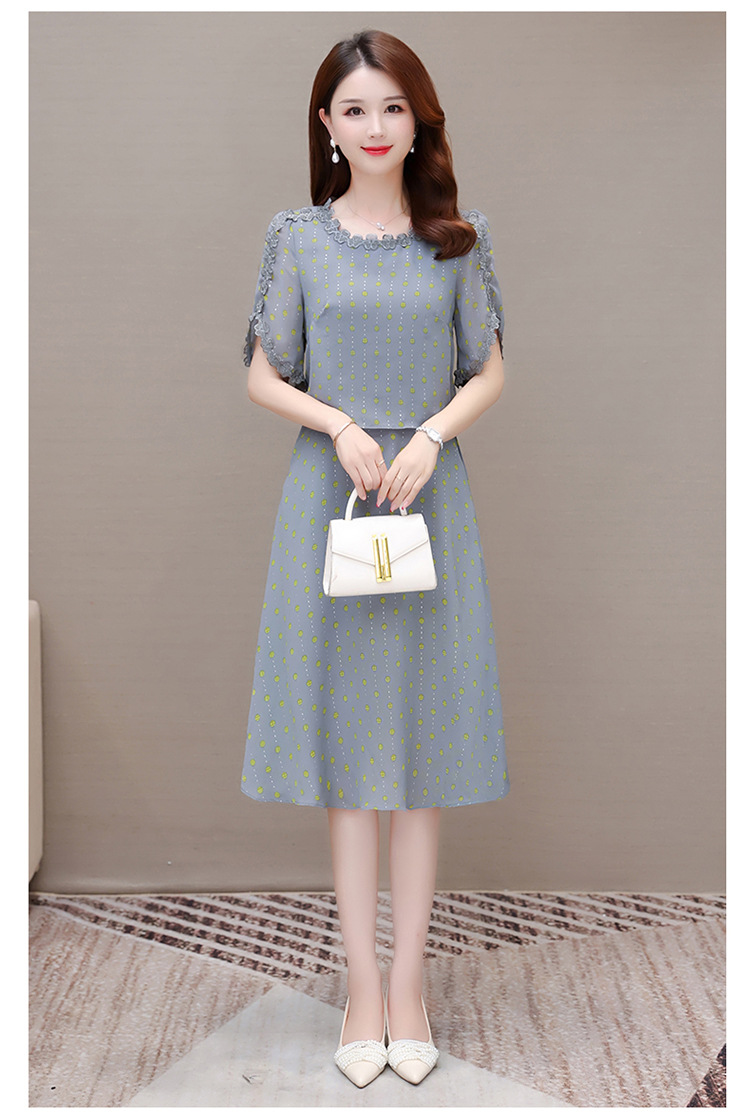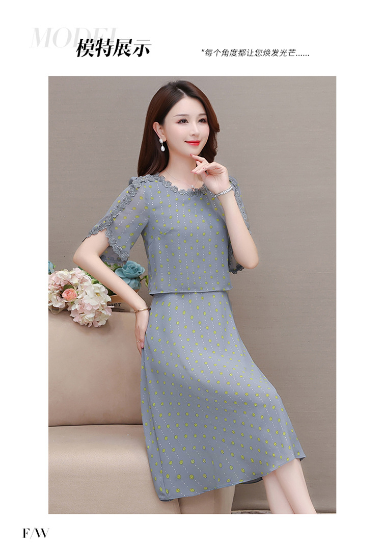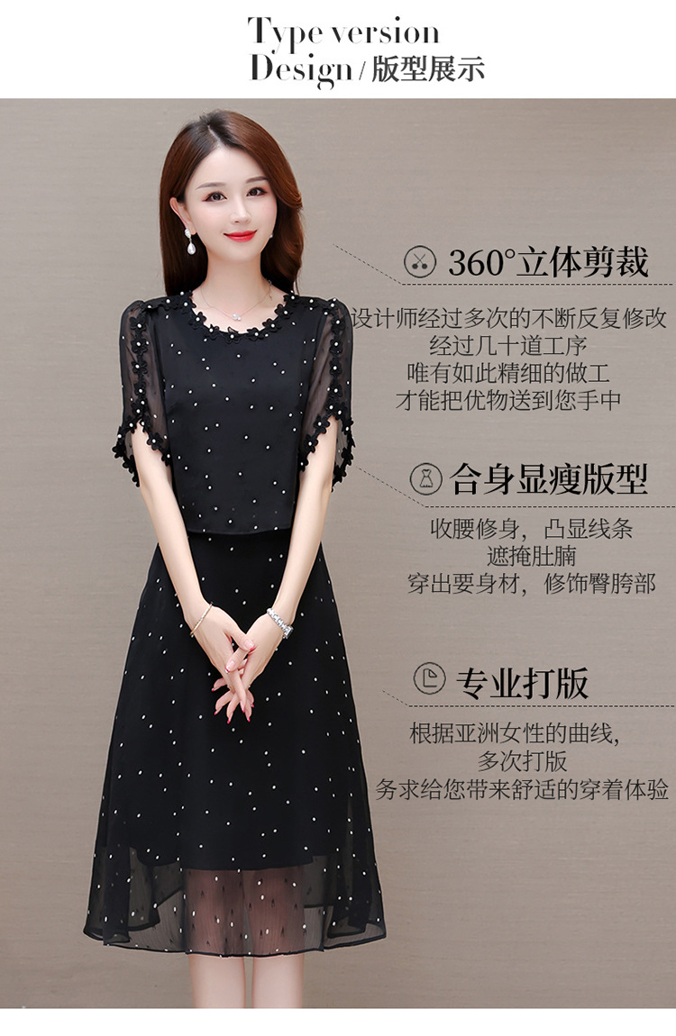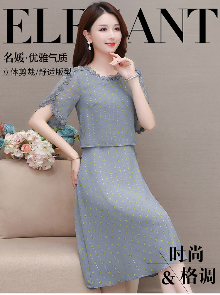 修身时尚,简约中长款雪纺裙夏款圆领短袖气质妈妈装连衣裙QYM-XQD-58B8982-2-L