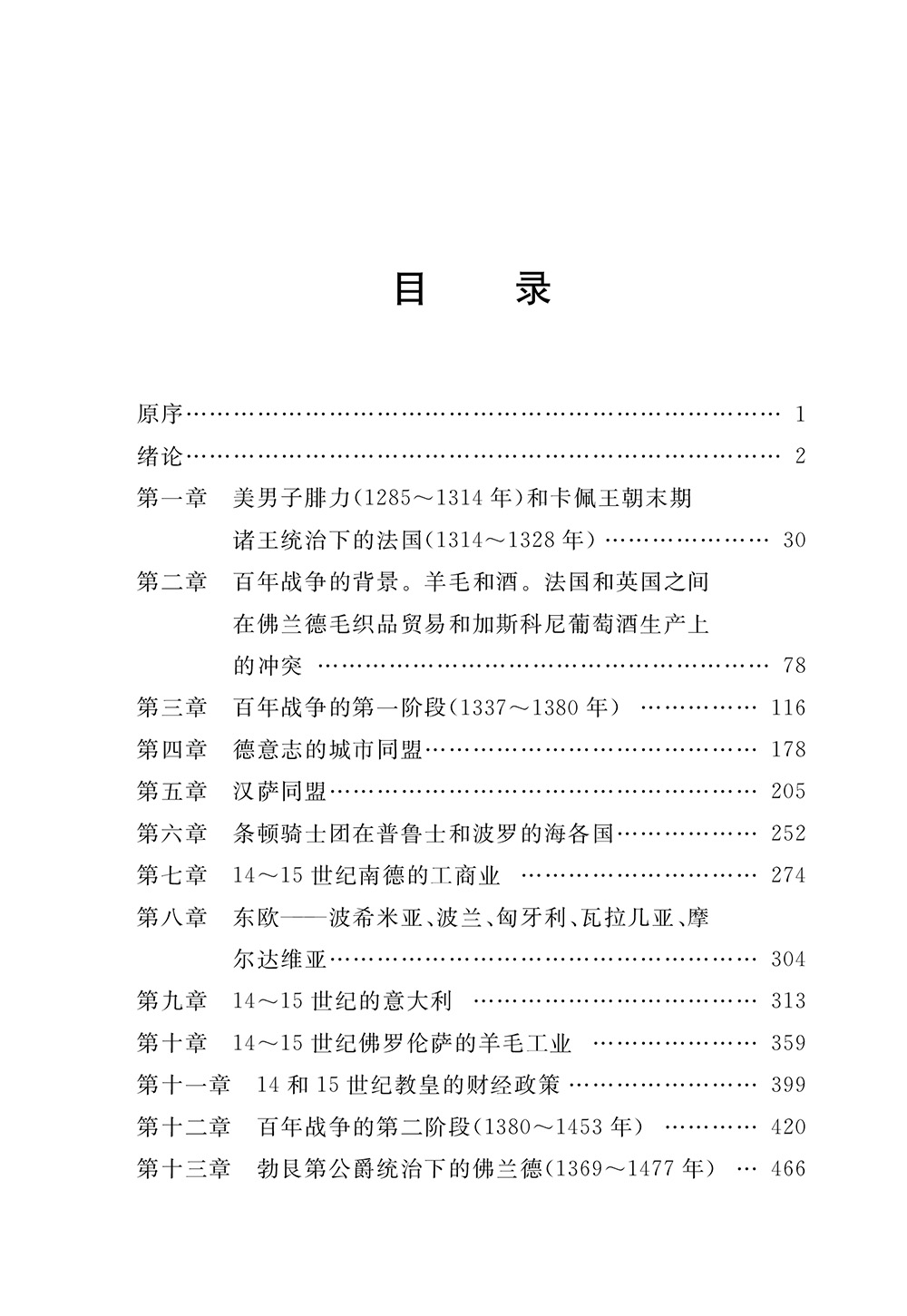 原序绪论章 美男子腓力(1285-1314年)和卡佩王朝末期诸王统治下的法国(1314-1328年)第二章 百年战争的背景。羊毛和酒。法国和英国之间在佛兰德毛织品贸易和加斯科尼葡萄酒生产上的冲突第三章 百年战争的阶段(1337-1380年)第四章 德意志的城市同盟第五章 汉萨同盟第六章 条顿骑士团在普鲁士和波罗的海各国第七章 14-15世纪南德的工商业第八章 东欧——波杀米亚、波兰、匈牙利、瓦利几亚、摩尔达维亚第九章 14-15世纪的意大利第十章 14-15世纪佛罗伦萨的羊毛工业第十一章 14和15世纪教皇的财经政策第十二章 百年战争的第二阶段(1380-1453年)第十三章 勃艮第公爵统治下的佛兰德(1369-1477年)第十四章 14和15世纪的西班牙第十五章 巴尔干半岛、希腊和利凡特第十六章 黑死病第十七章 行会与城市贵族的形成。无产阶级和阶级斗争第十八章 文艺复兴时期的银行业第十九章 现代经营方法的起源第二十章 中世纪末期的法国(1461-1515年)第二十一章 中世纪末期的法国、意大利和西班牙第二十二章 近代社的开端译后记人名译名对照表 地图目次公元1300年时中世纪欧洲的经济地图中世纪的低地国家德意志和意大利间的商路13至15世纪汉萨同盟辖地从柯尼斯堡到诺夫哥罗德间东北德意志商路中世纪欧洲的商路北意大利的商路远东的商路公元1500年的欧洲