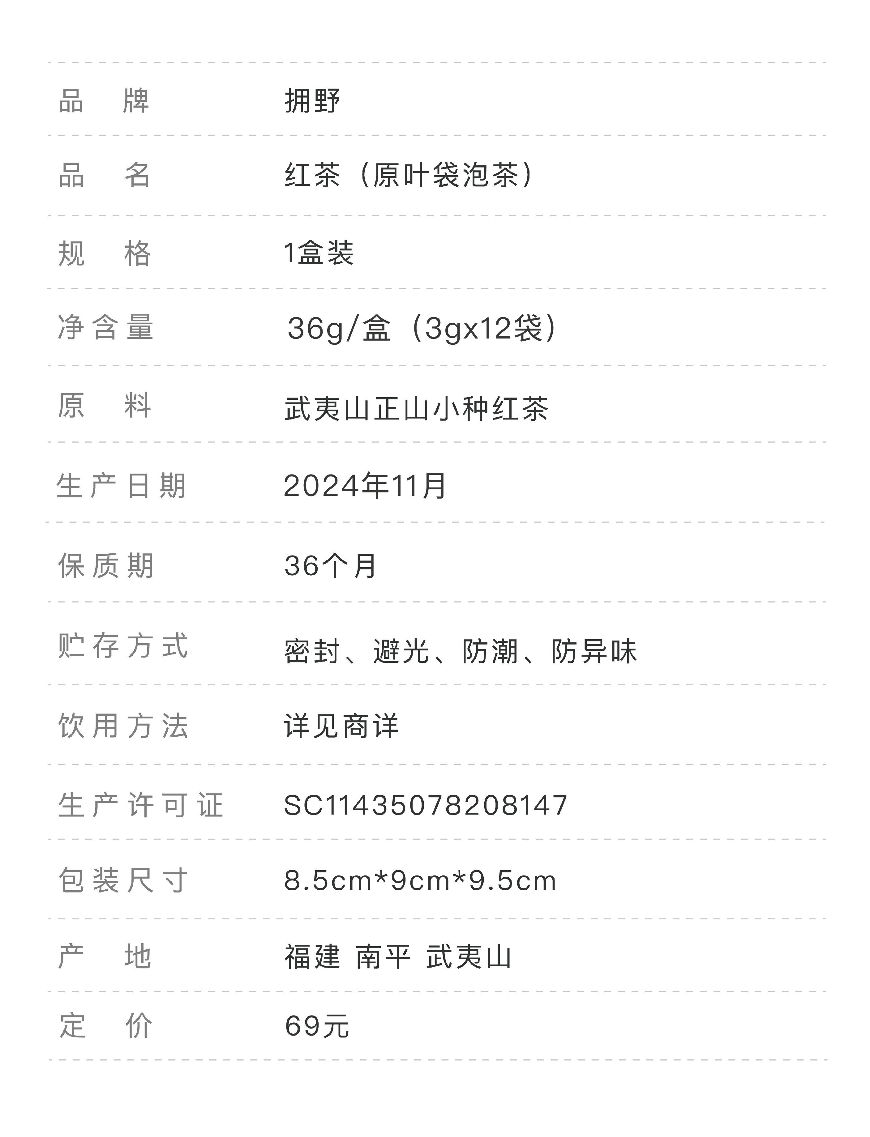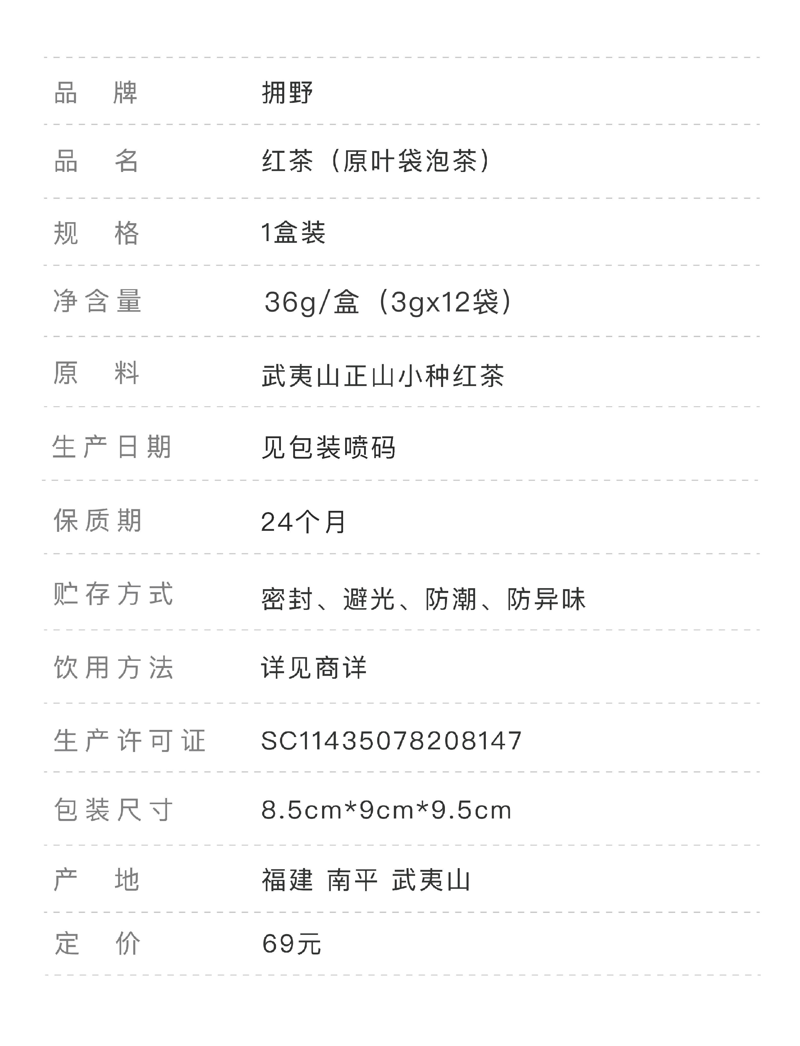 拥野·武夷山正山小种红茶原叶袋泡茶 3gx12袋/盒