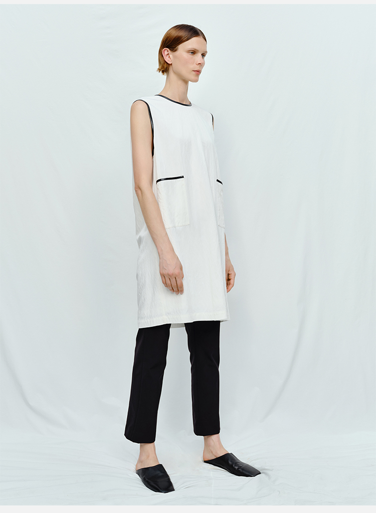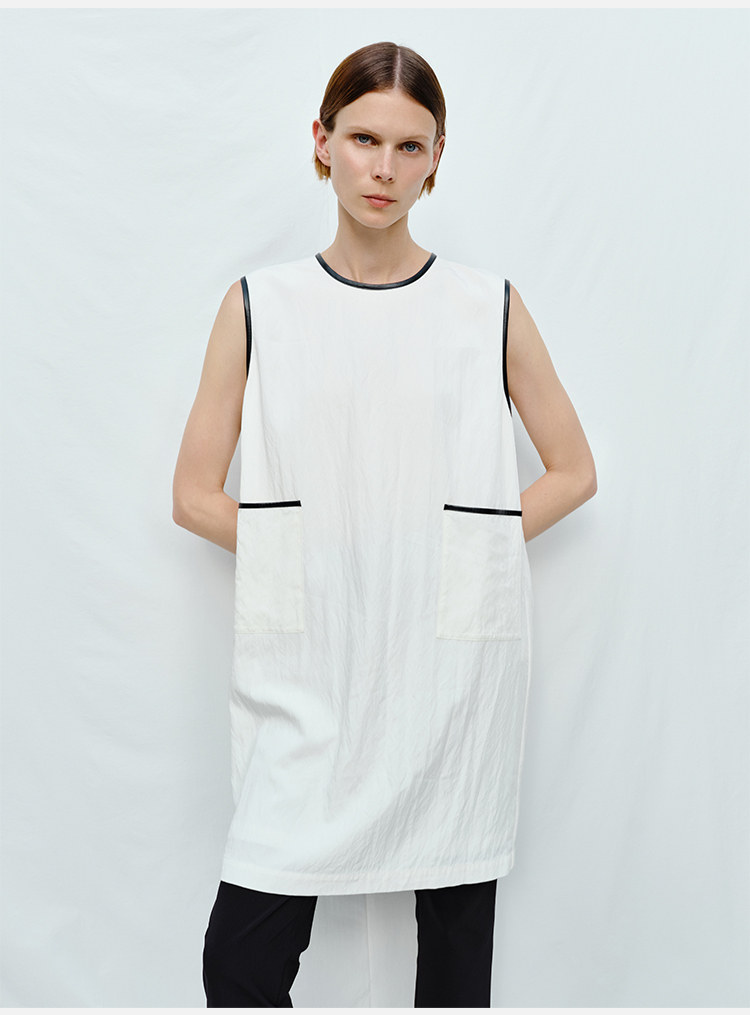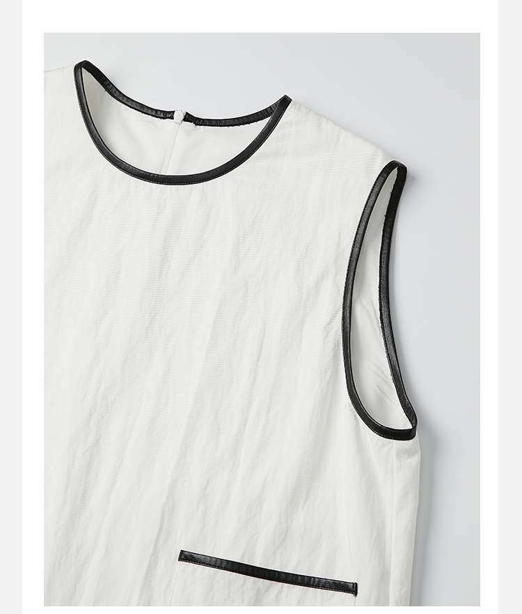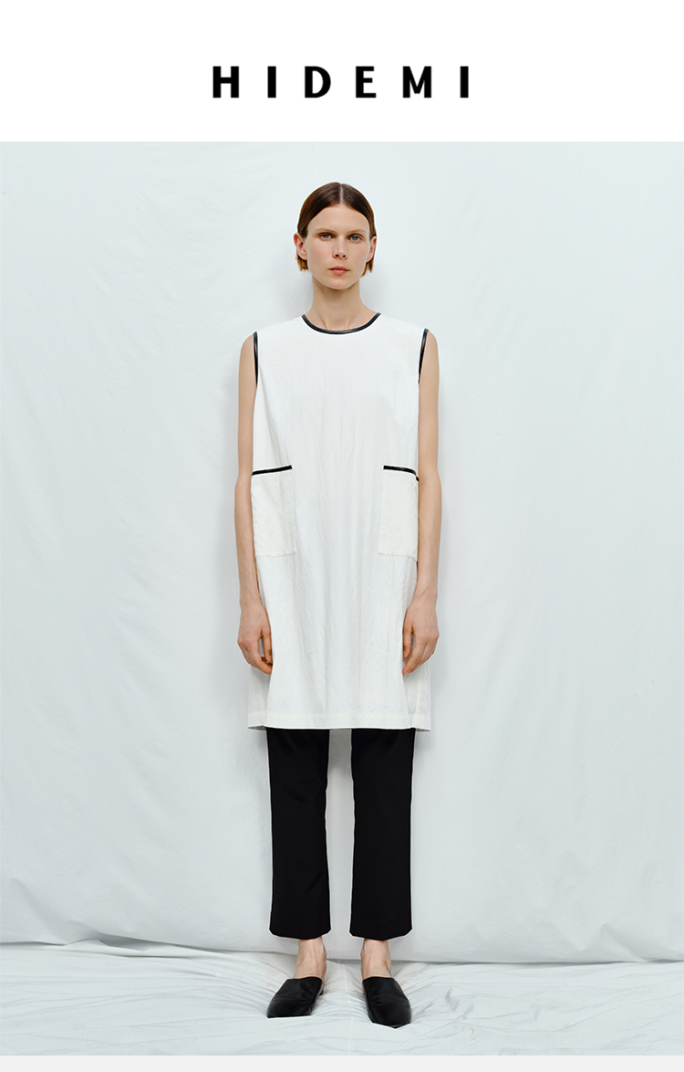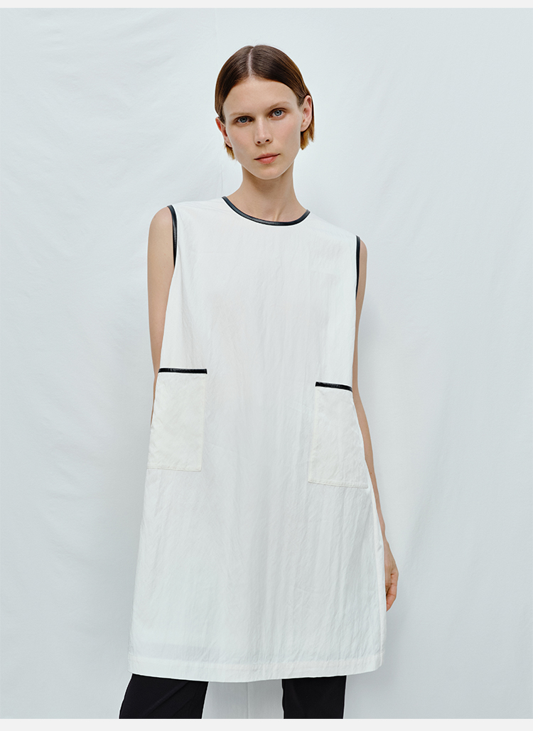 HIDEMI 皮边镶嵌包边工艺极简圆领口袋连衣裙 黑色/白色