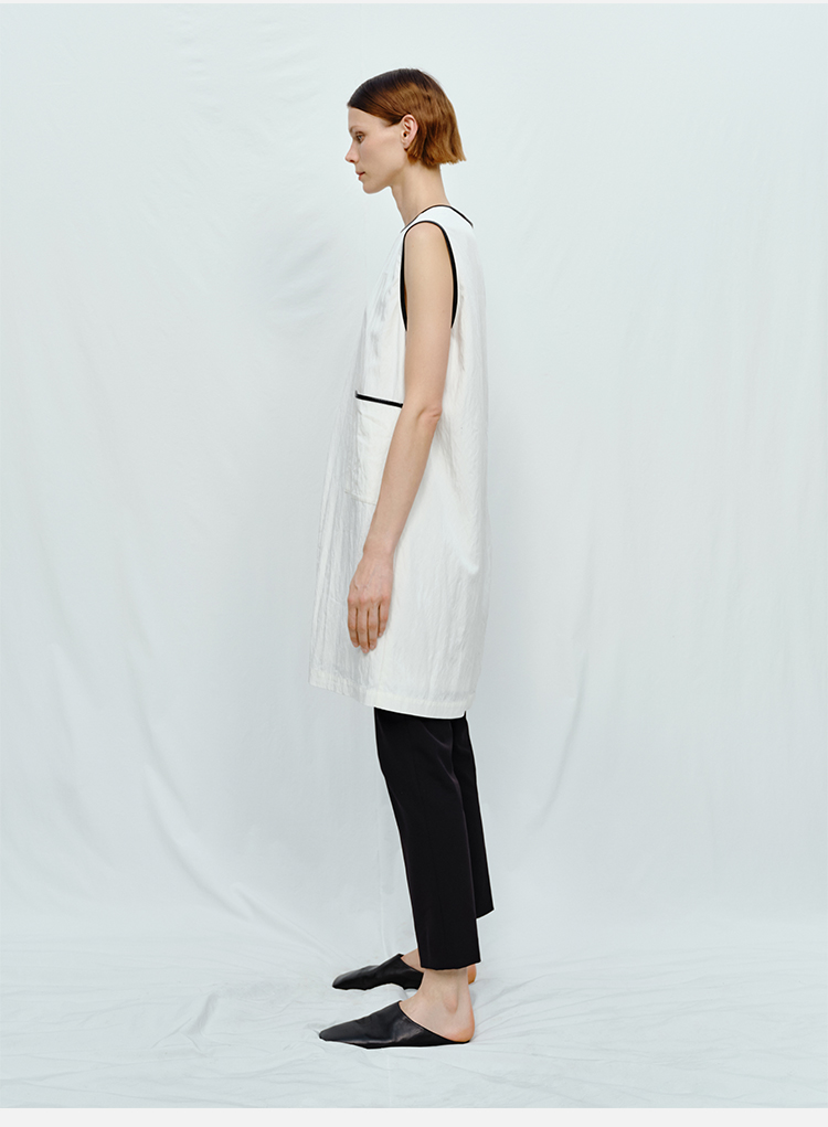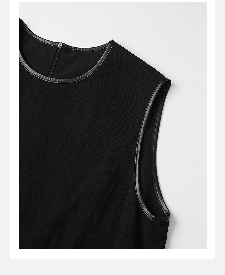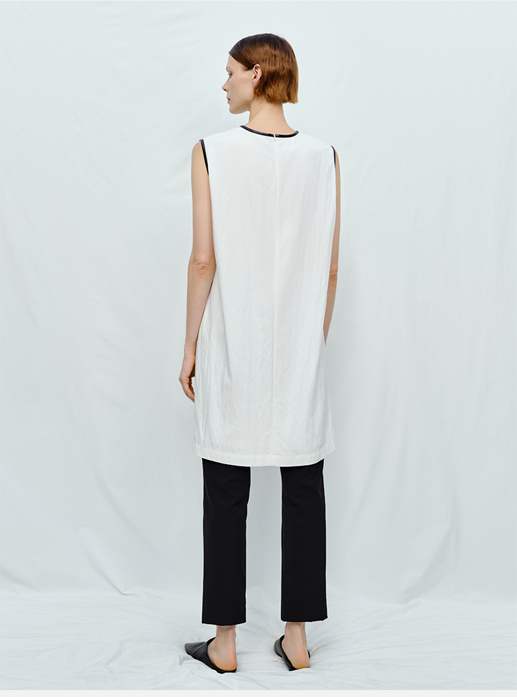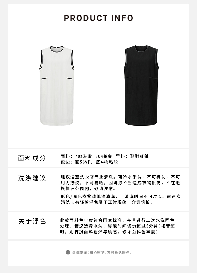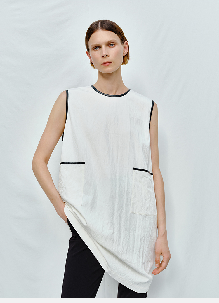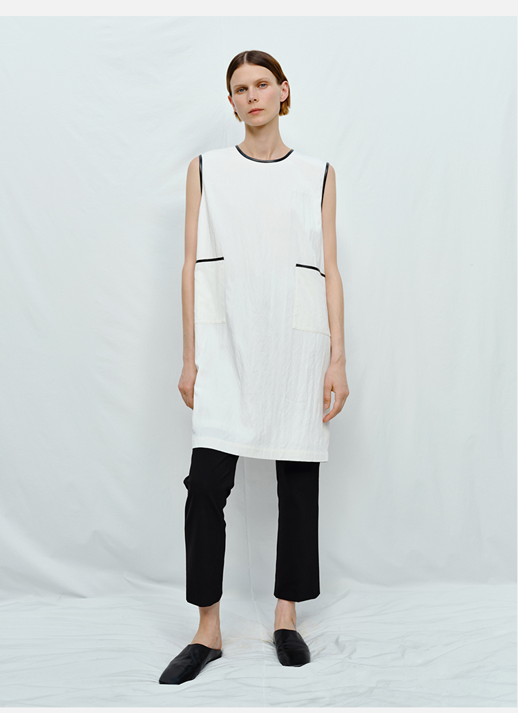 HIDEMI 皮边镶嵌包边工艺极简圆领口袋连衣裙 黑色/白色