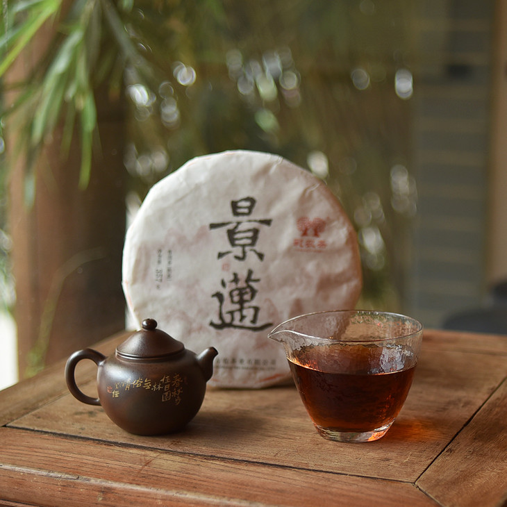 此款景迈大寨熟茶,选2015年景迈大寨优质生态乔木原料,毛茶自然仓储1年余,2016年择良时节气发堆后,收库再醇化。2017年开始紧压成357克圆饼。茶品柔和甜润,汤感细腻,不失景迈香扬、汤柔的地域风韵。
