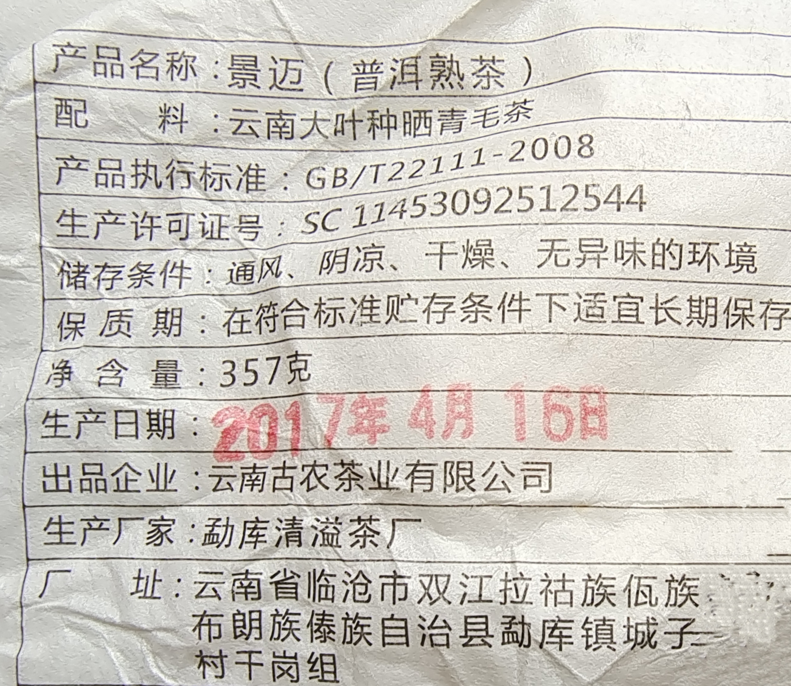 彩农茶|景迈2017年熟饼