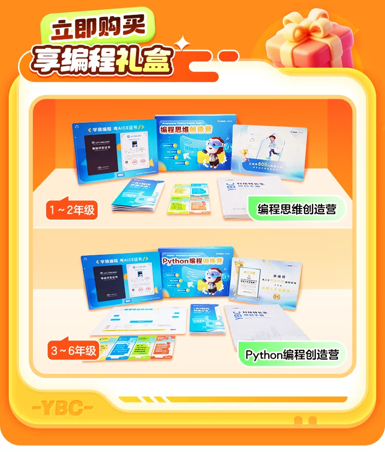 【猿编程-少儿编程直播课】学习专业编程 跑赢科技特长生 | 8节真人直播课+Python代码100次实操+2本编程科普图书+1本科技特长规划手册+4个程序作品设计+4个人工智能主题+270集科普音频